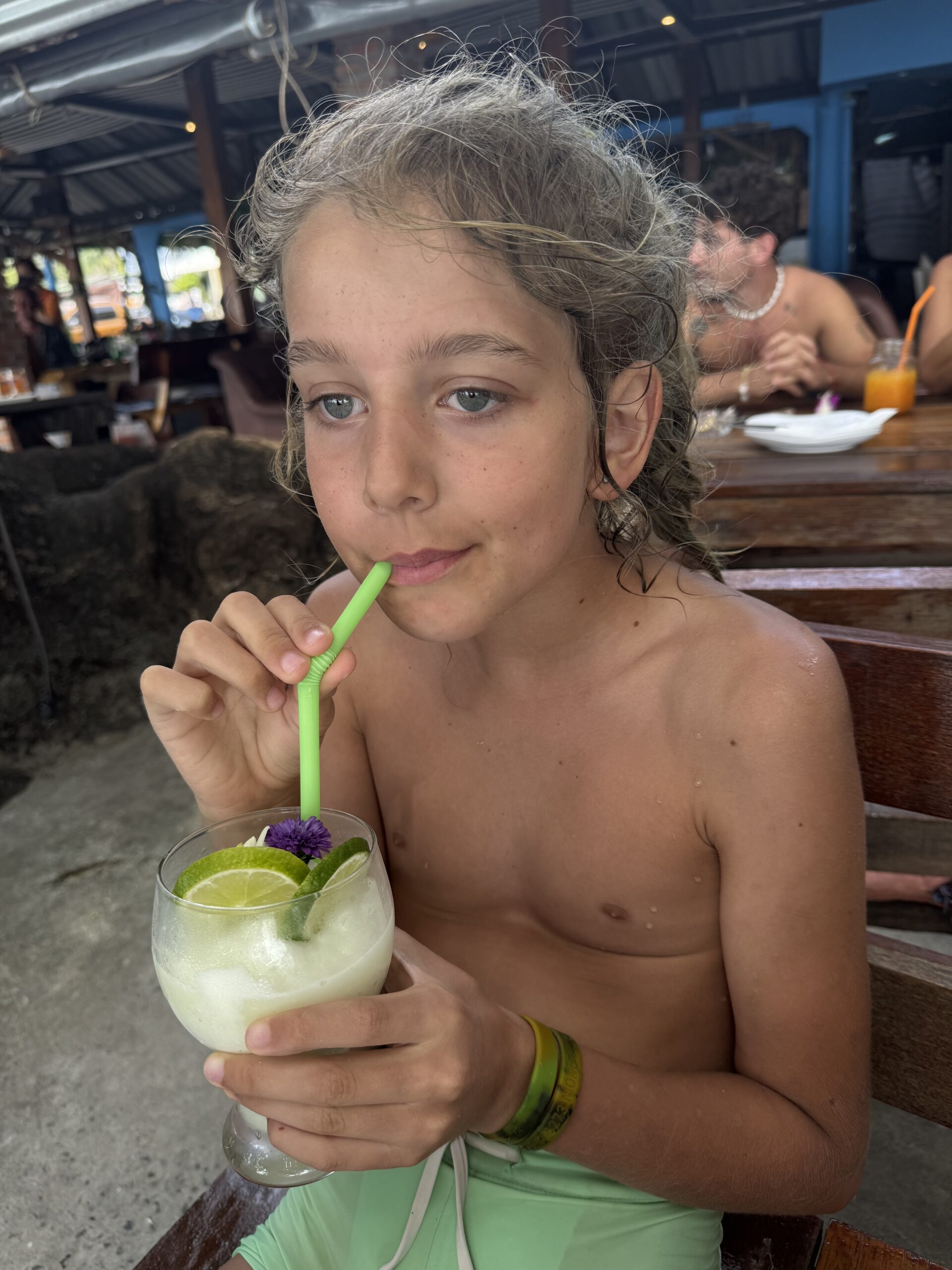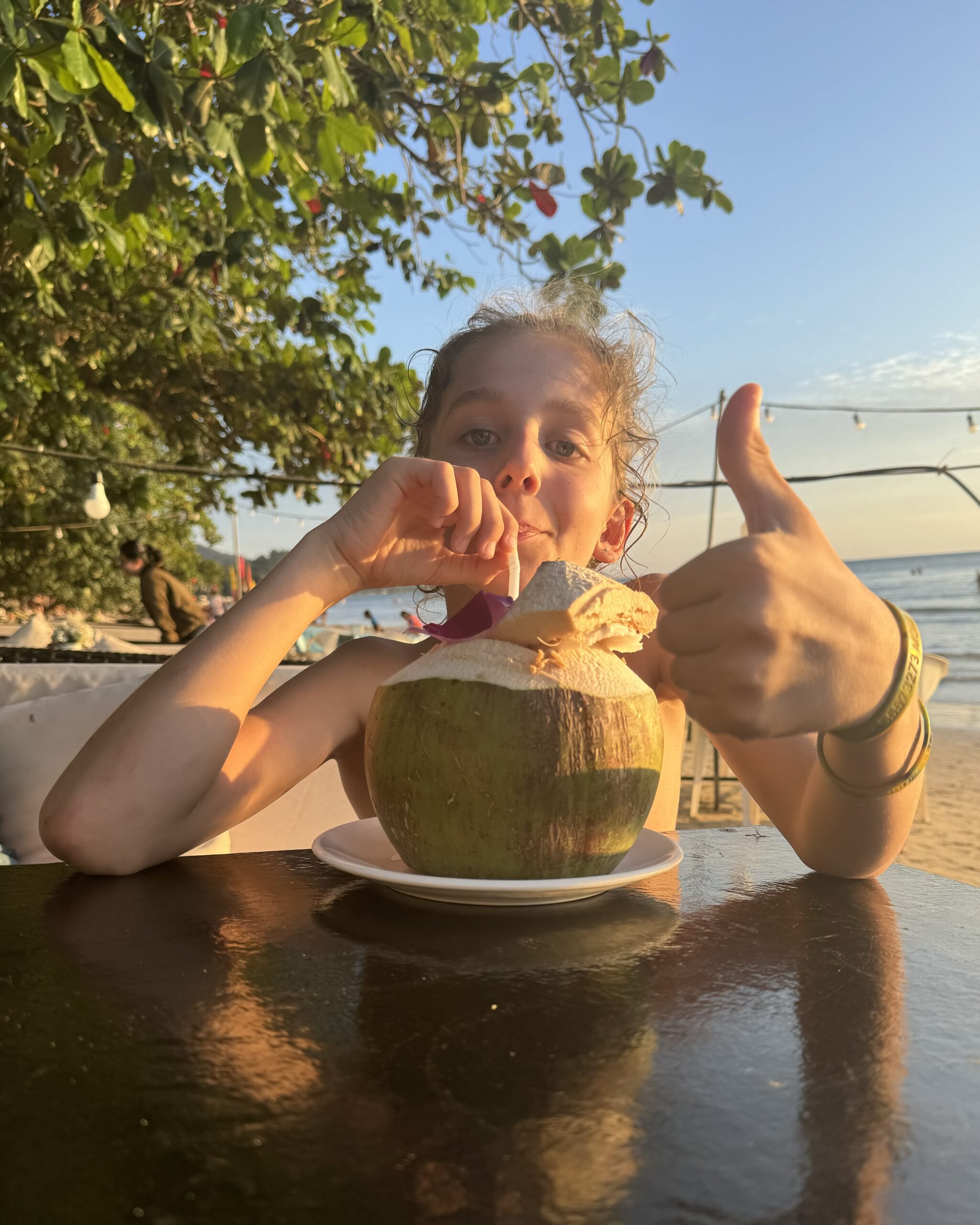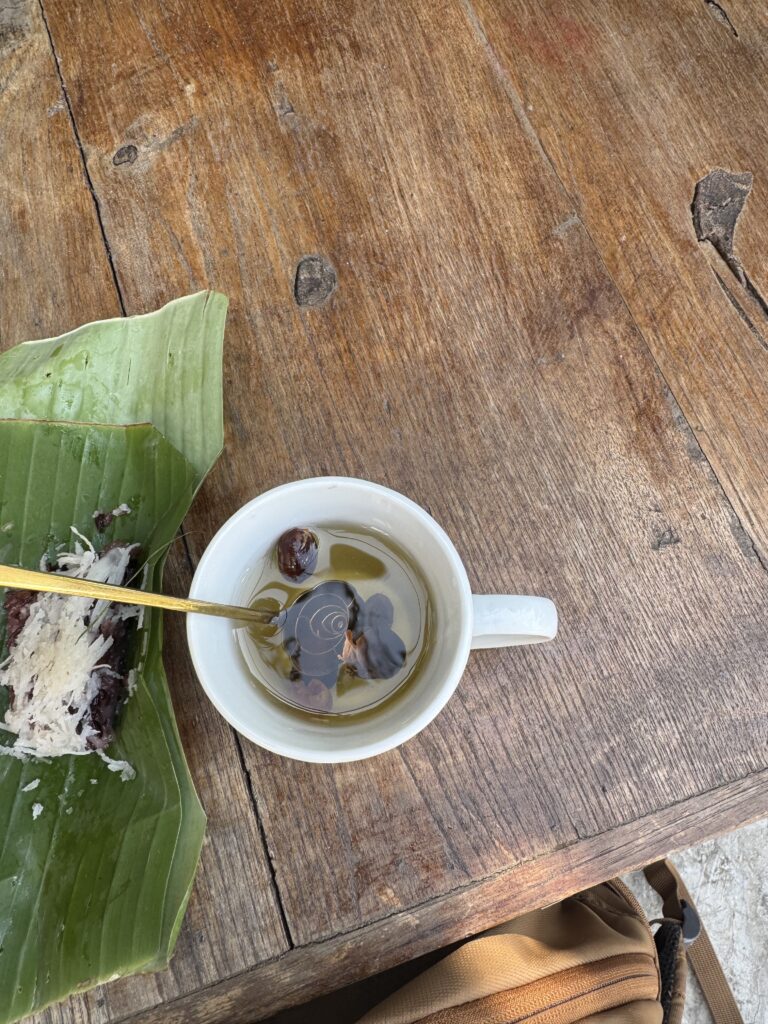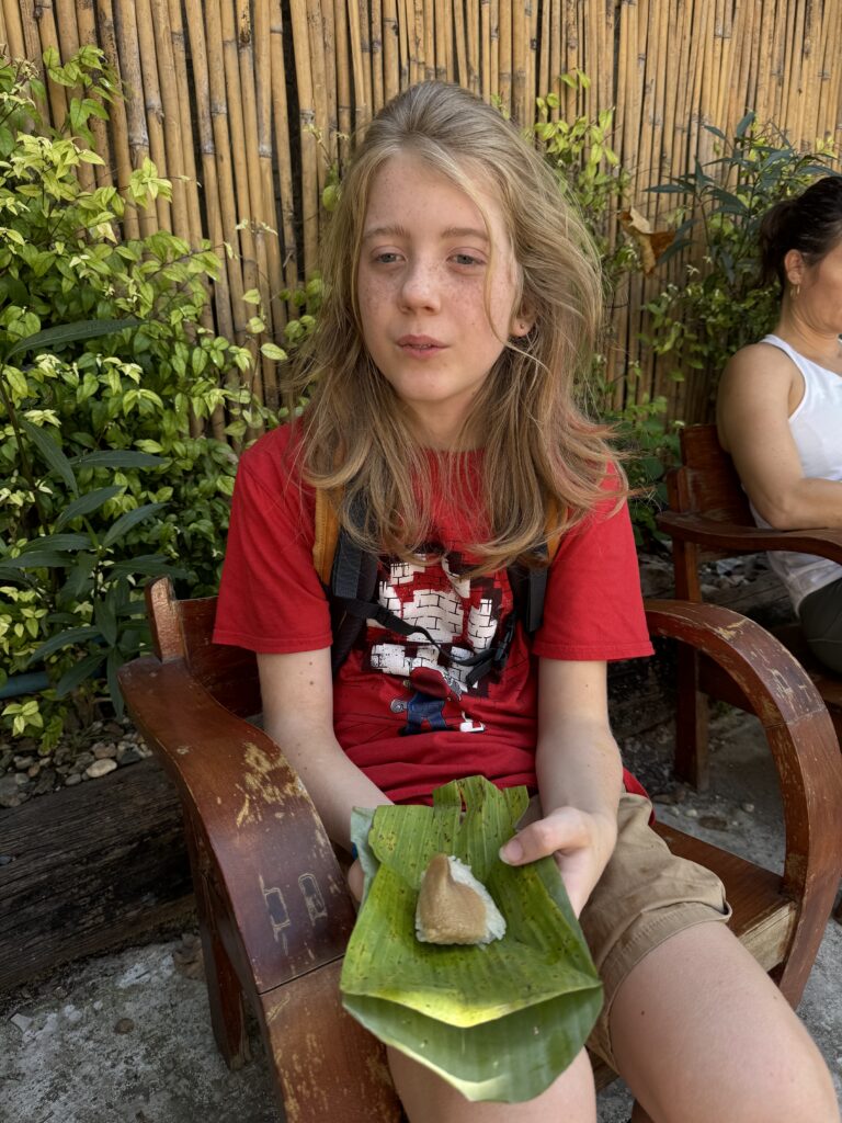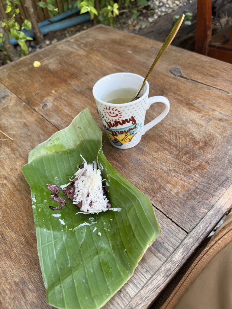 We hebben uit een kokosnoot gedronken, Ibis vond het toch niet echt zijn smaak, Storm hoefde niet echt, dus heb ik er twee leeg gedronken, de deksel leeggegeten en gedeeld met Storm, daarna hebben we de twee kokosnoten geofferd bij een mooie tempel 😂