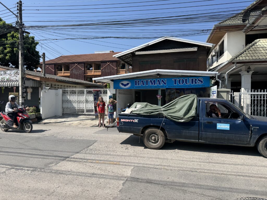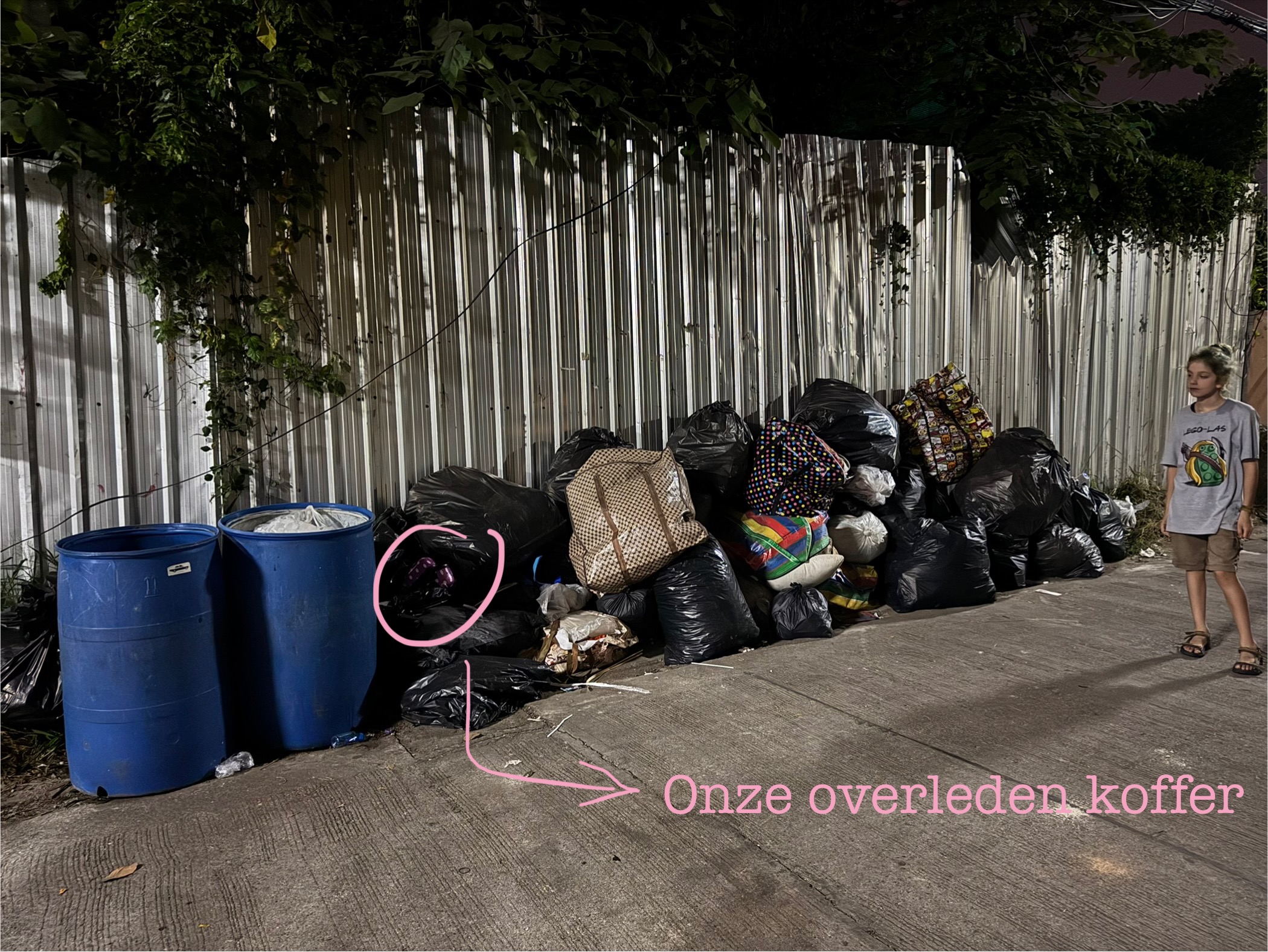 Wat een fijne laatste dag hadden we in Chiang Mai. Lekker geslapen, alles was al ingepakt, dus de bagage bij de hostel gestald en nog een laatste keer ontbeten bij Sailomjoy. Daarna in de stad een lekker ijsje voor de jongens en een smoothie voor mij. Ze hebben het voor elkaar hoor, ze hebben een pistool dat elastiekjes afvuurt gekocht en bij Chiang Mai Plastic een zak rode elastiekjes om te schieten. Ze zijn er super blij mee. Nog een nieuwe grote koffer gekocht, want ook de andere stippenkoffer was op een haar naar overleden. Bij de tempel met tafeltjes (daar is altijd de Sunday Market) hebben we even gerust, wat gedronken en hebben ze lekker gespeeld met hun houten wapens. Toen rustig terug naar de hostel gewandeld (half uurtje) en de koffers opnieuw ingepakt. Storm heeft de tweede stippenkoffer naar zijn laatste rustplaats gebracht, bij de andere stapel… Of nee, de laatste wordt ie natuurlijk samen met de rest van die stapel zooi naartoe gebracht door een hele grote sjieke vuilniswagen.