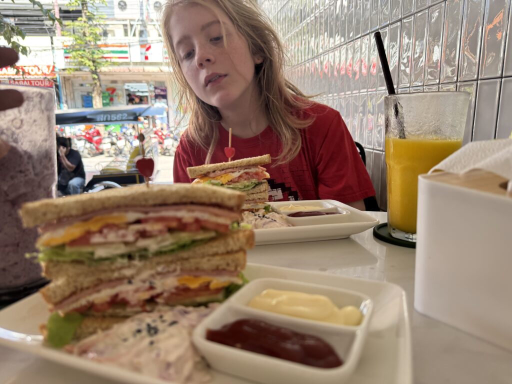 Goed geslapen, wel erg dikke stijve kussens, maar het dikke stevige matras was fijn. Gestoomd desert (sticky rice banana and beans) van hostel gekregen, kopje koffy Cherry “thee” gedronken en op pad naar ontbijtplek. We bleken maar 7 minuten van Sailomjoy Restaurant verwijderd te zijn, dus wilden we daar naartoe, maar helaas is het gesloten en nu een massage salon. Heel jammer, was een leuke traditie geweest met alle kinderen daar te zitten. Nu hebben we op Storms advies een ander plekje gevonden. Een mega sandwich-toast hebben de jongens en alledrie een heerlijke smoothie.