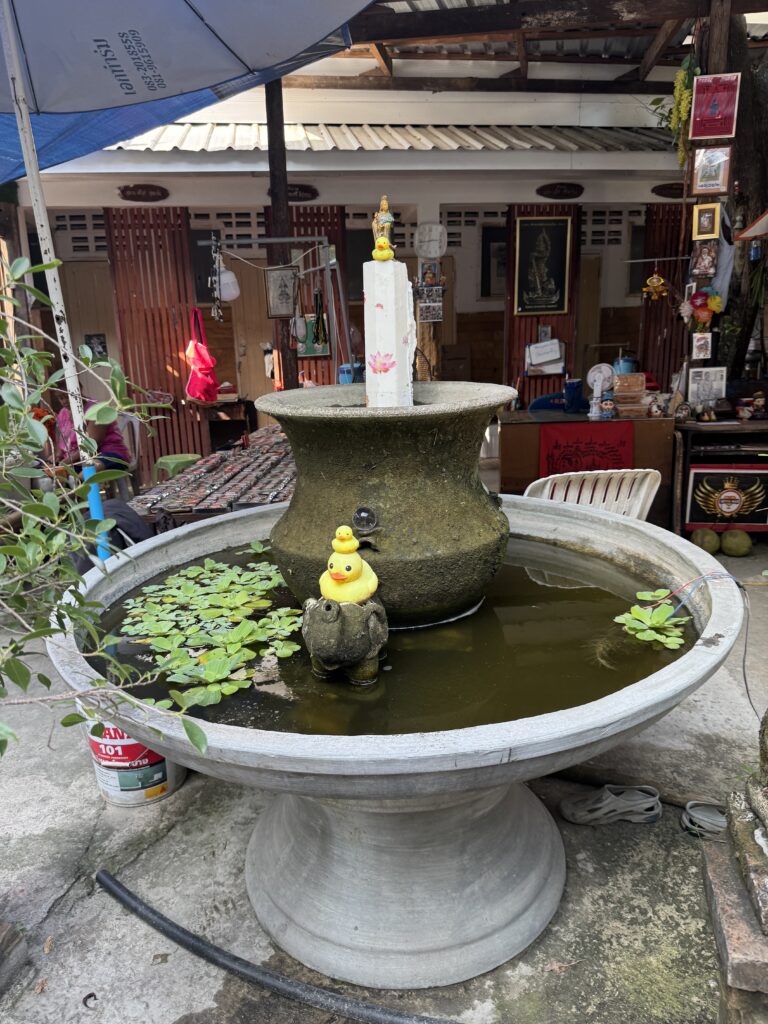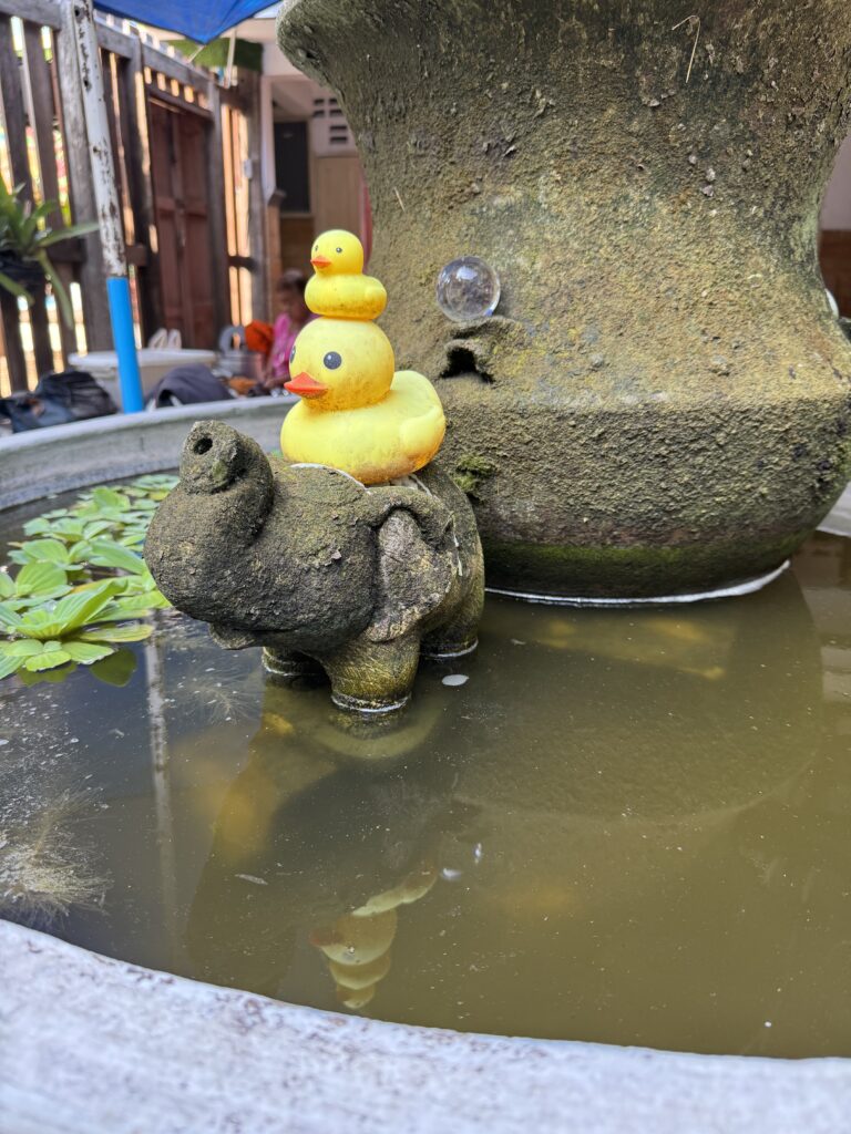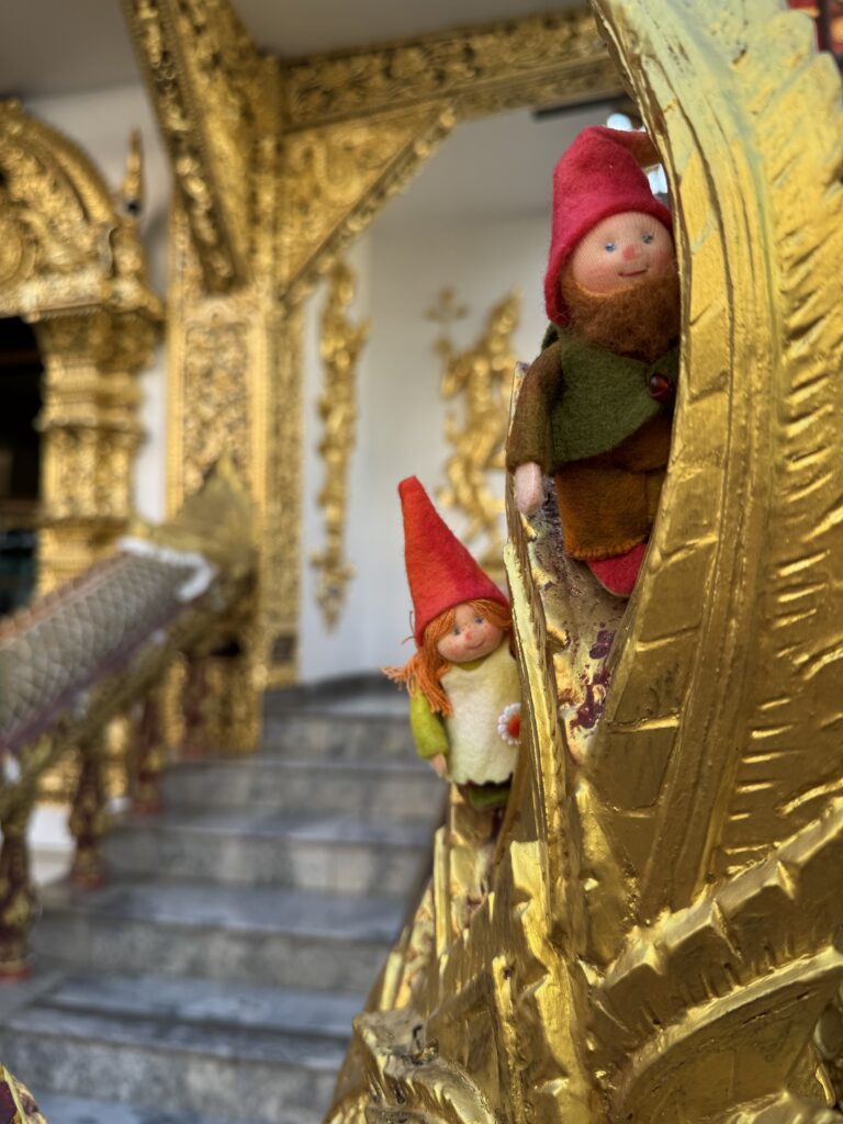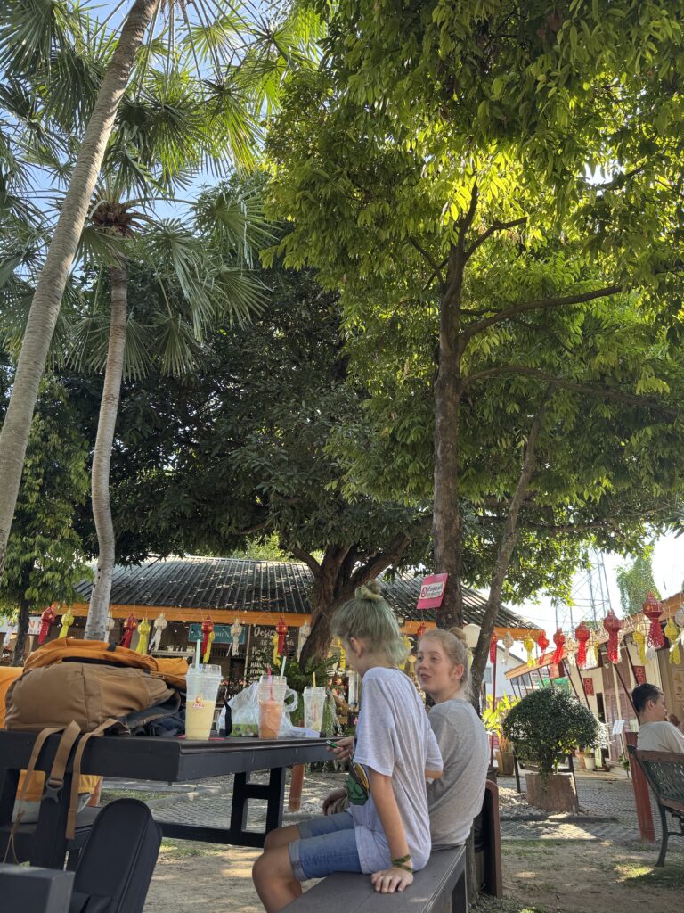 Bij een tempel die we nog niet gezien hadden zijn de jongens binnen gaan kijken, ik bleef buiten, want blote schouders en was m’n sjaal vergeten… Buiten hoorde ik van een Thaise meneer dat de grote markt vanaf 18u is en dat we overdag gewoon andere leuke dingen moeten doen. Hij tipte welk reisbureau goed was om te boeken voor de Sticky Waterfalls, dus dat gaan we vandaag of morgen regelen. Eerst spelen met de gekochte nep-Lego popjes en een dikke vette smoothie nemen.