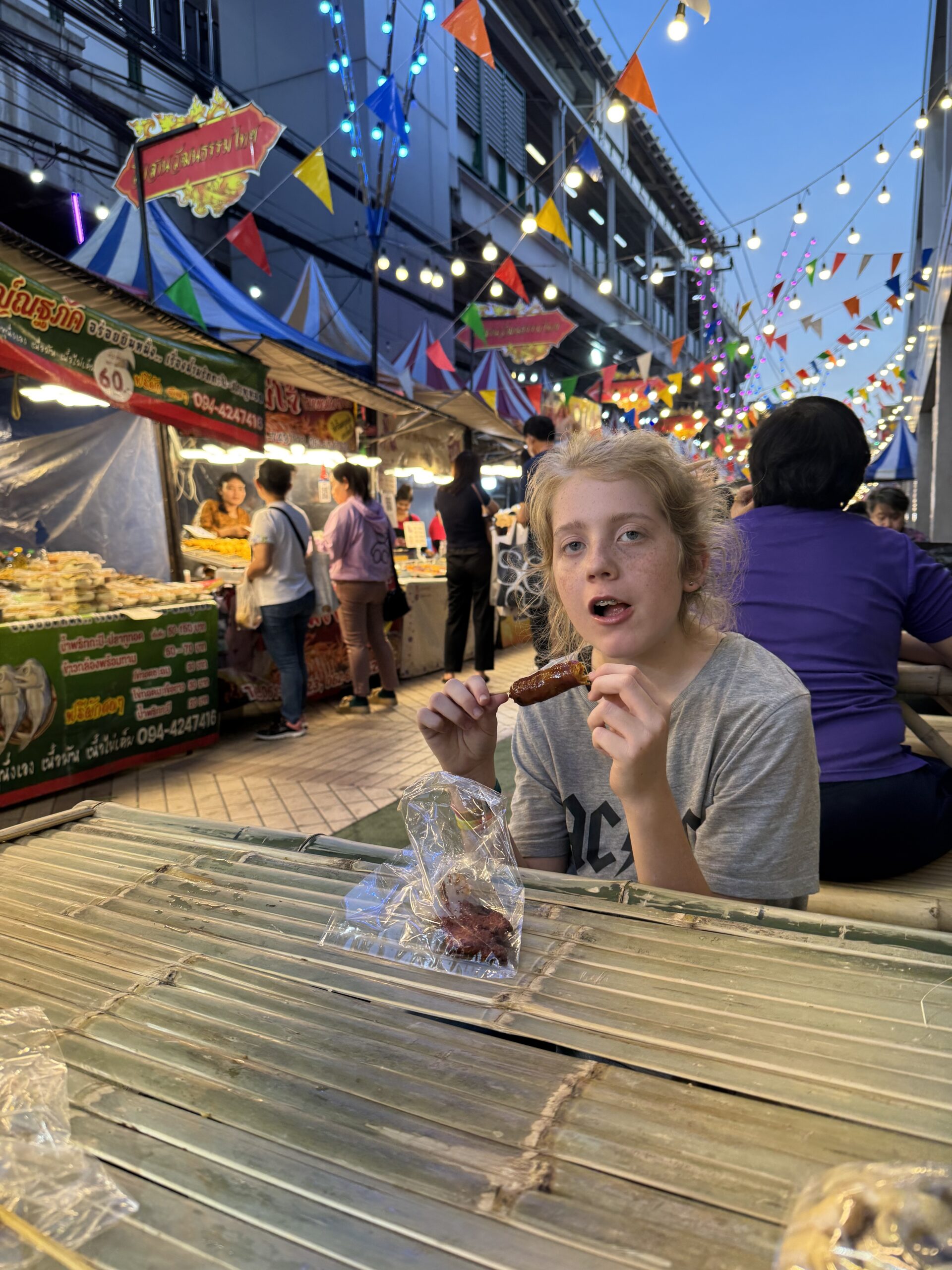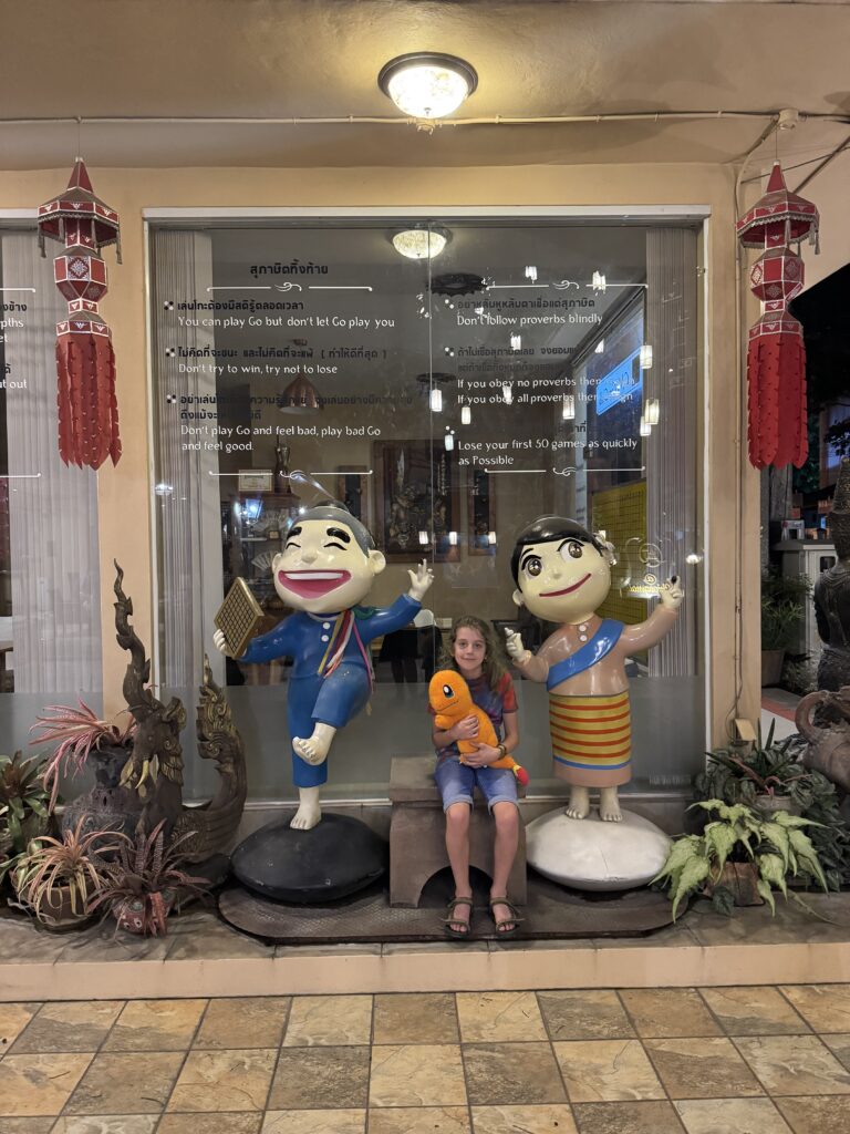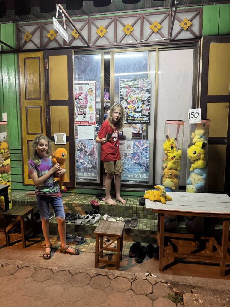 Vanavond naar Lanna Square voor festival-gezelligheid en eten. Onderweg daarnaartoe liepen we zowaar langs een pokémon winkel, dus moesten er Thaise kaarten gekocht worden en hebben beide zonen een knuffel gekocht. Het was een heerlijke avond, leuke optredens met dans, maar ook goede zang en lekker gegeten. Ik at Pad Thai, de jongens zijn kraampjes gaan shoppen en kochten verschillende lekkere dingen… morgen terug, want ze hebben lang niet alles geprobeerd.