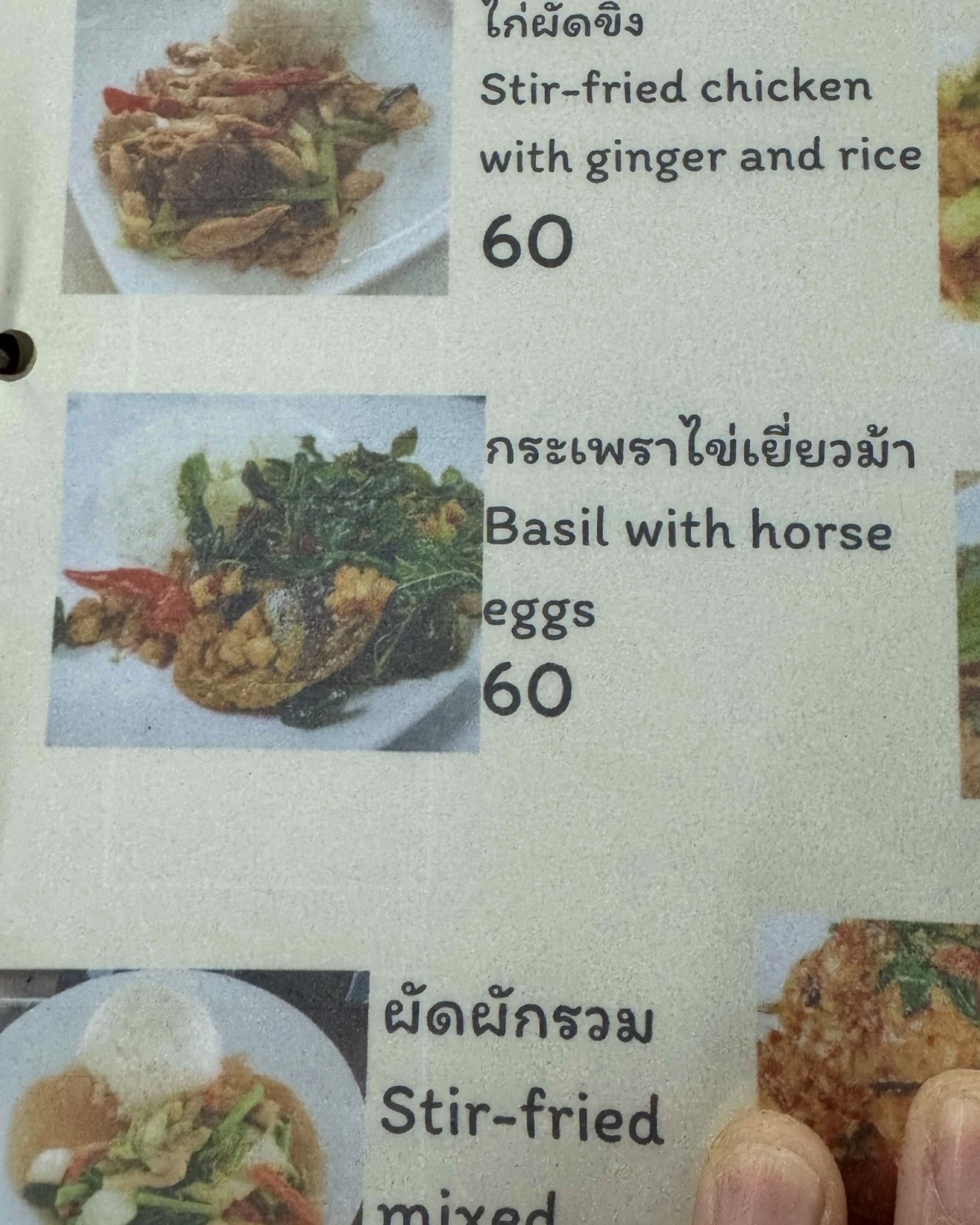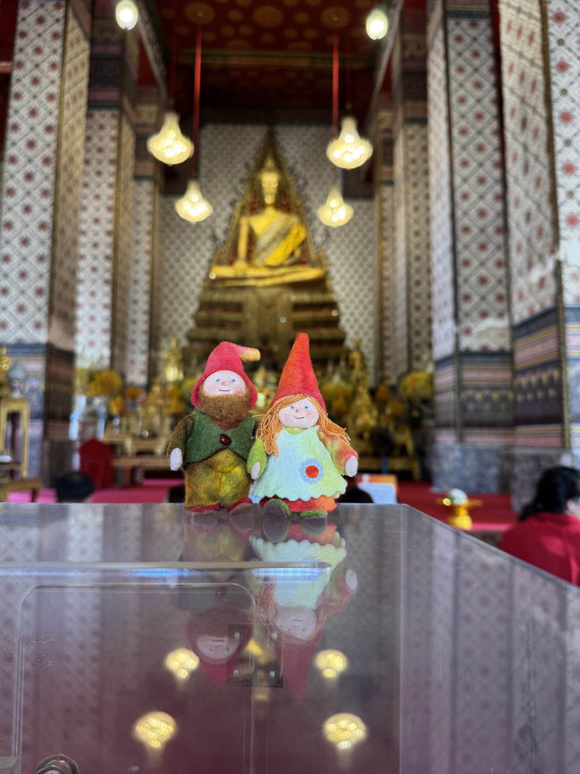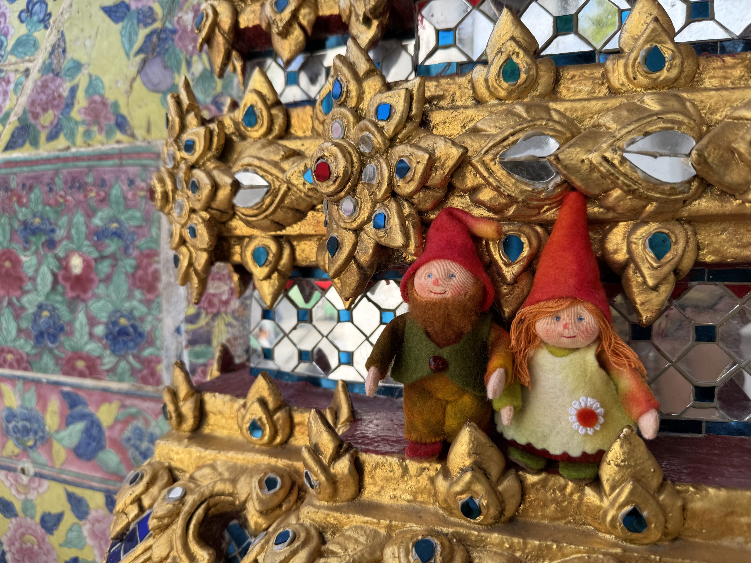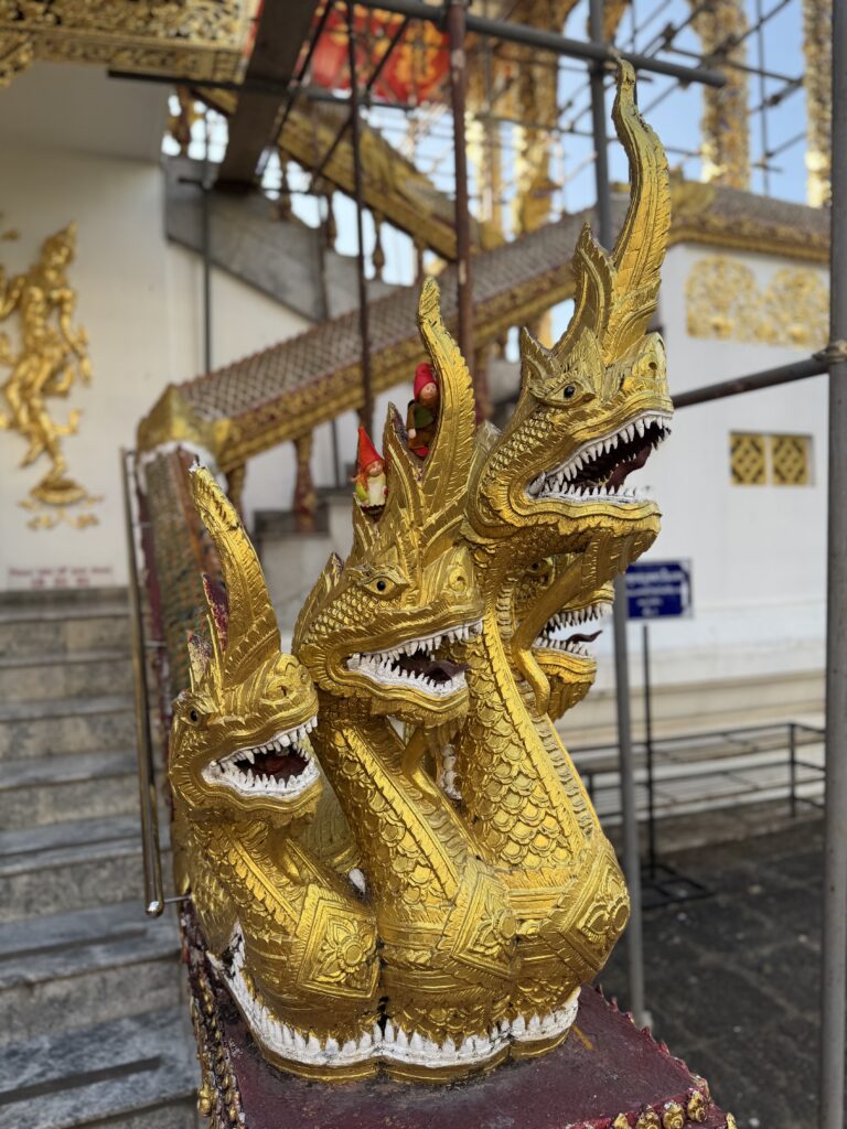 Ontbijten bij Sailomjoy! Ik dacht dat ie gesloten was, maar hij is er gewoon nog. Ik had stir-fried Morning Glory, kabouters op de foto met mijn eten en in het tempeltje van het restaurant. We hebben geprobeerd een kakkerlak te redden, maar helaas, hij bleef worstelen en draaide toch weer op zijn rug, waardoor hij naast onze rugzakken is overleden en opgeveegd.