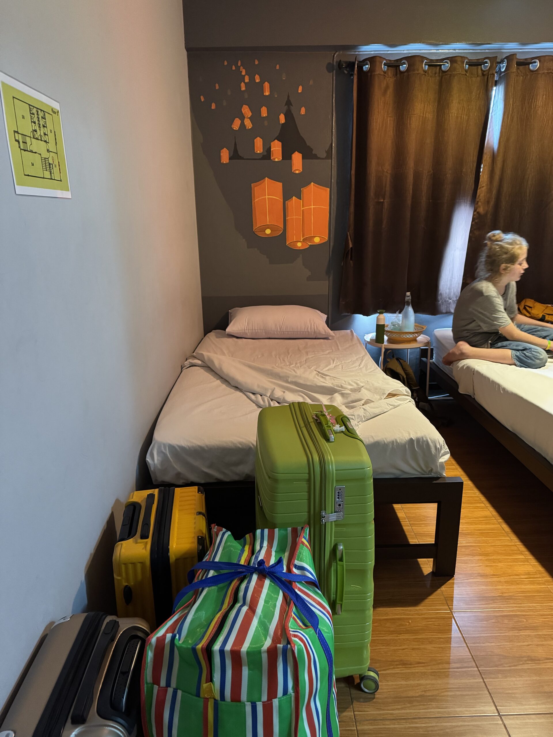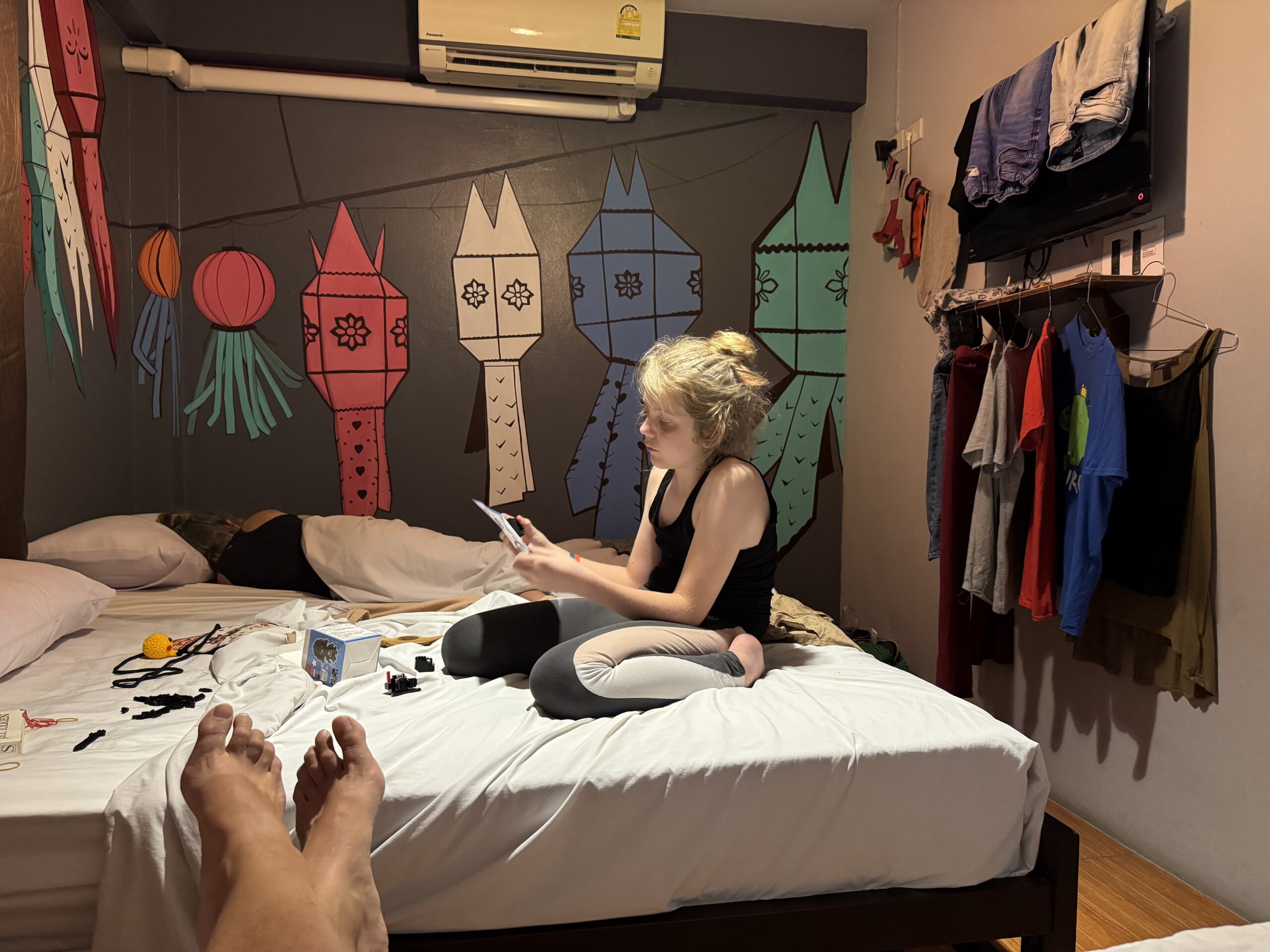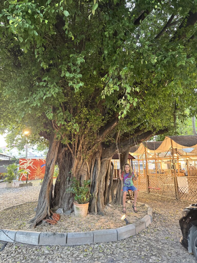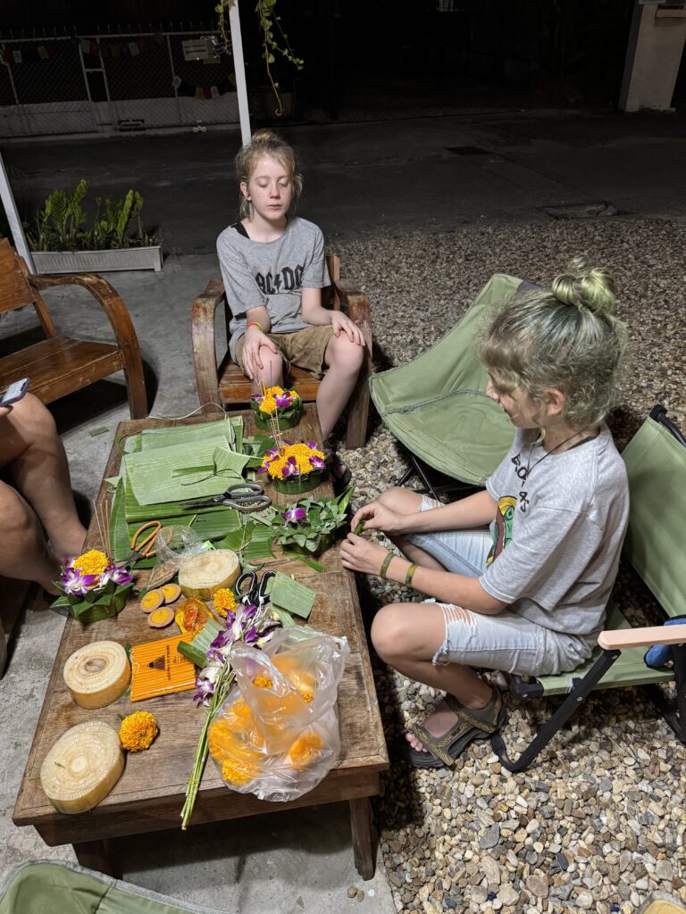 Door de aardige vrouw van de hostel werden we gisteren al uitgenodigd om vandaag zelf een krathong te leren maken. We hadden afgesproken om 6 uur en we waren precies op tijd terug van het zwemmen. Wat leuk om te doen en wat extra leuk om het zo geleerd te krijgen van haar, samen met de kinderen van hen. Het is nog best makkelijk te doen als je eenmaal weet hoe het zit. Ibis vond die van hem echt super mooi worden en was reuze trots op zijn creatie (vol met nietjes 😂) en Storm was ook echt heel blij met zijn zelfgemaakte krathong. Morgenavond gaan we naar de rivier om onze kaarsjes en wierook aan te steken en onze krathongs de rivier af te laten varen. Hopelijk blijven ze goed drijven.
