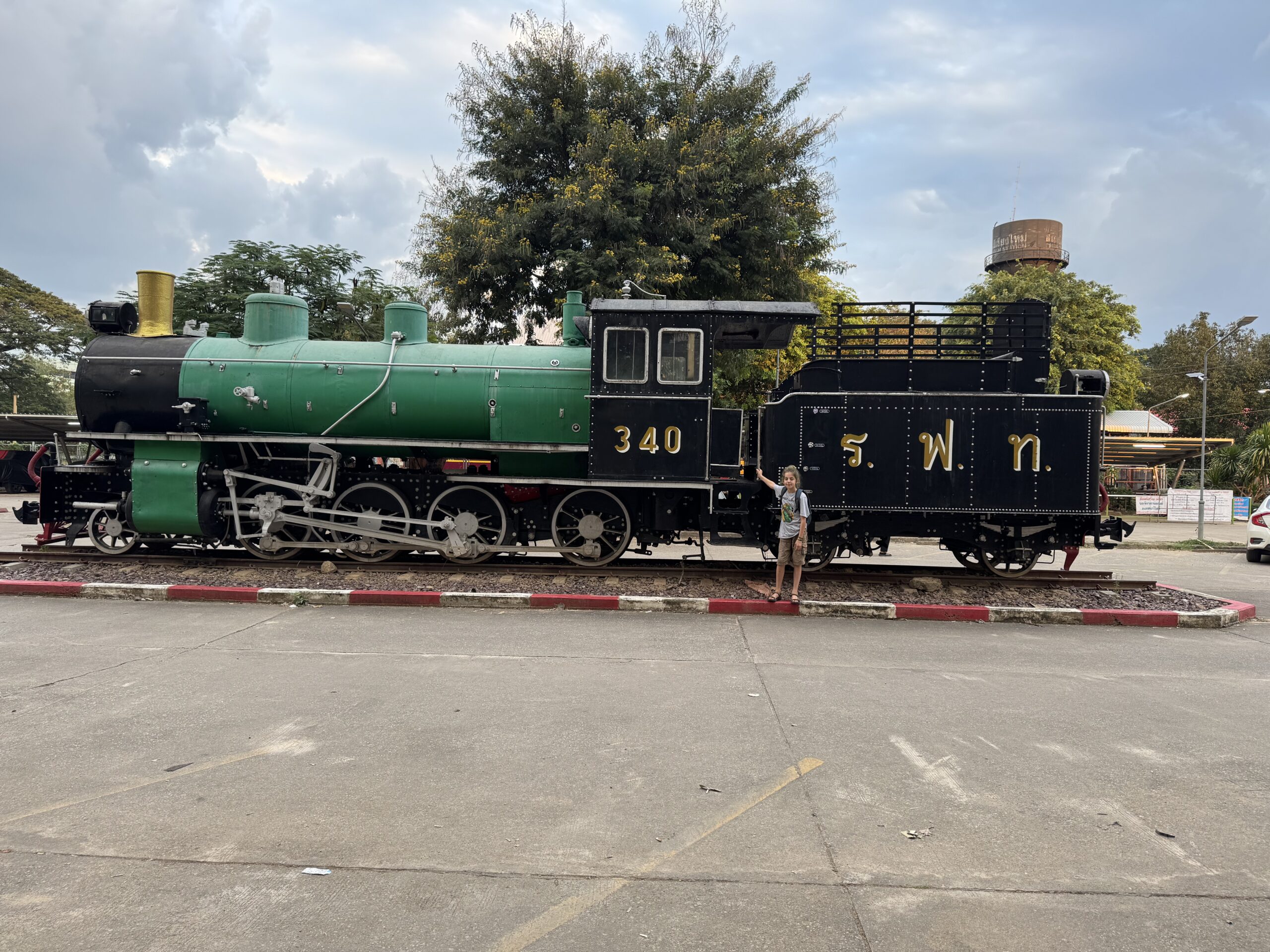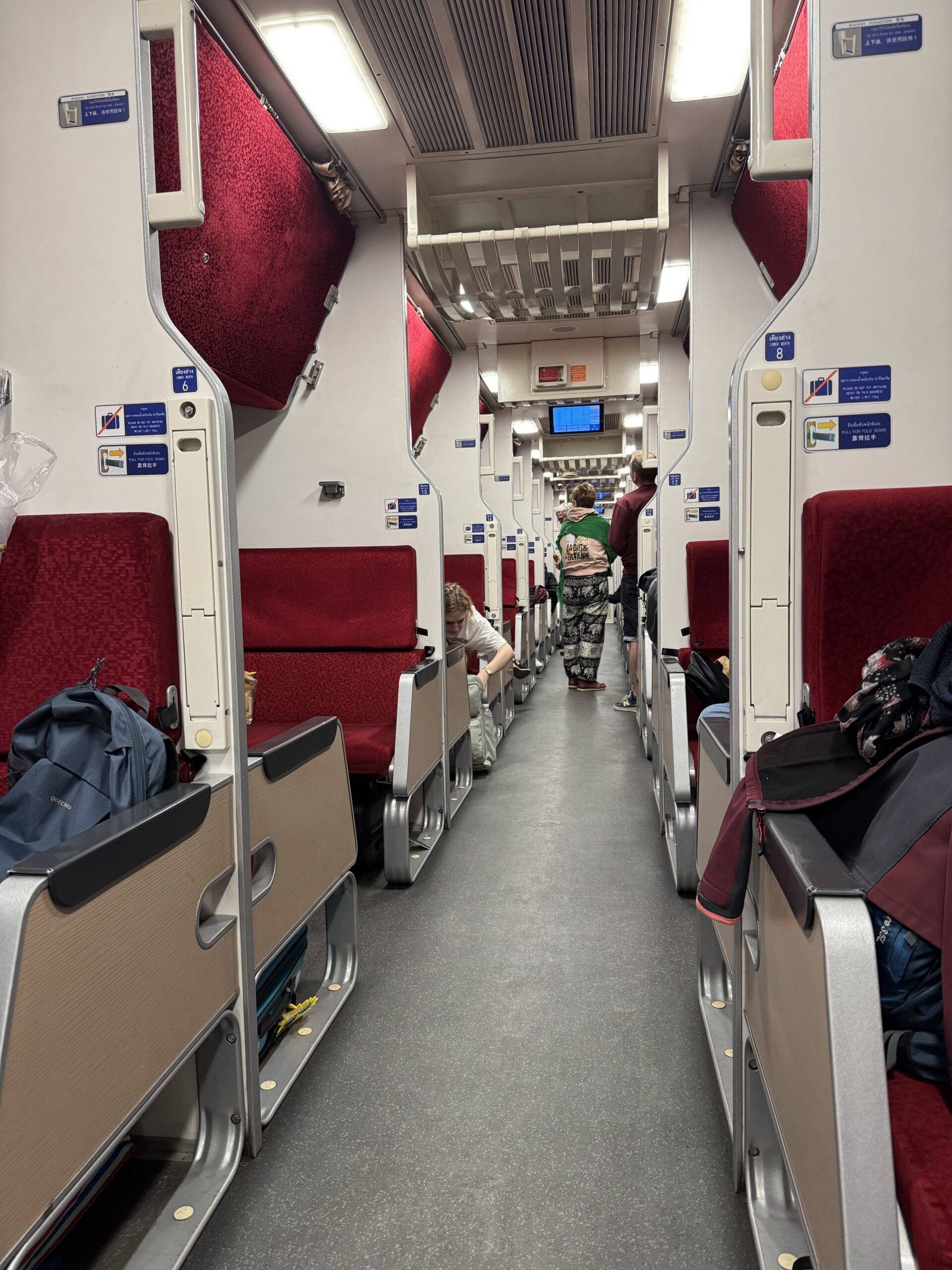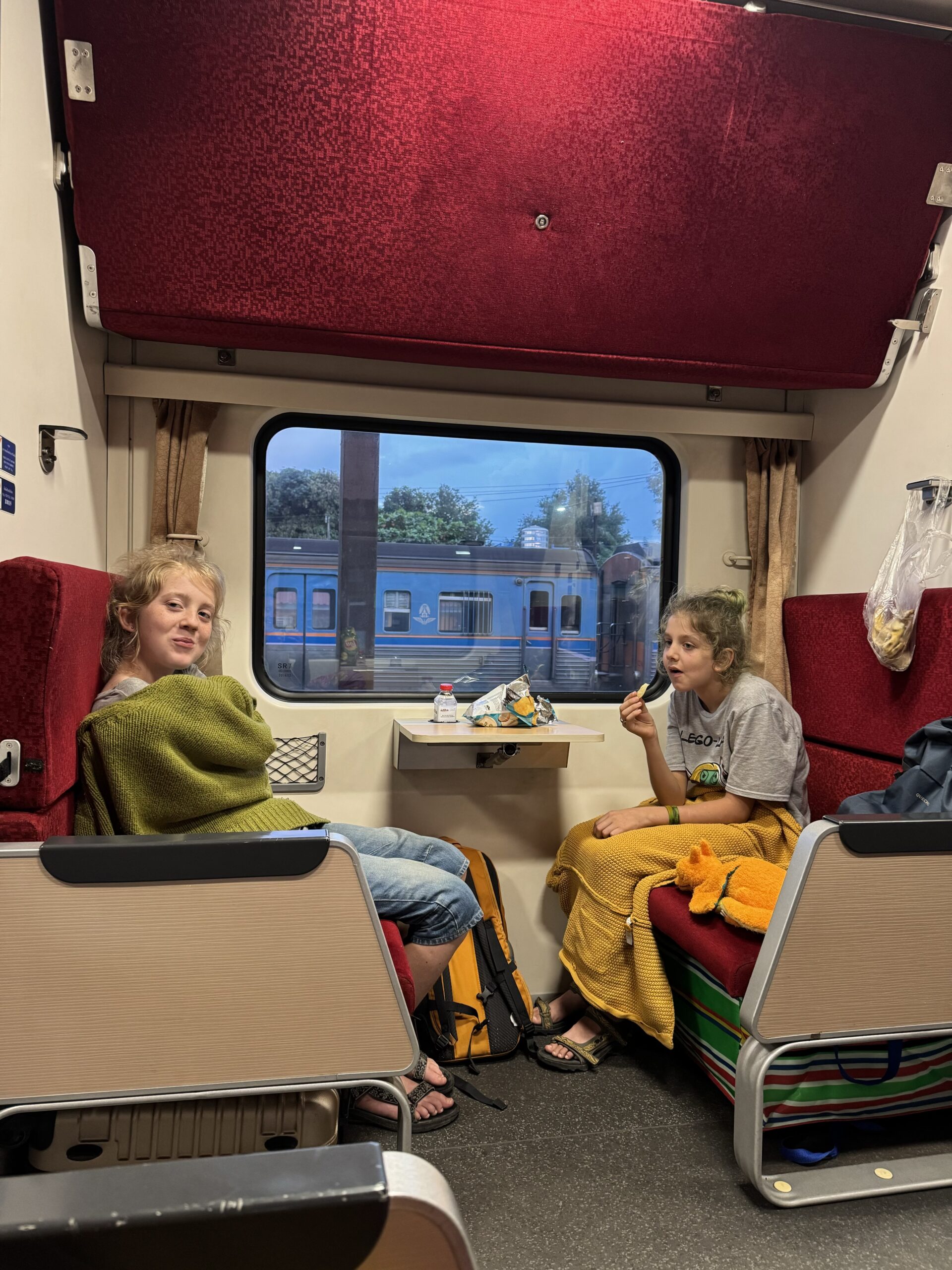 Bij de hostel een taxi besteld en alles liep op rolletjes. Overal konden we rustig aan doen zonder echt te hoeven wachten óf haasten. Zalig ontspannen. De kaartjes van de nachttrein opgepikt bij het Bossotel tegenover het station, even kijken maar de oude stoomlocomotief op de parkeerplaats en hup naar de trein. Ons plekje was zo gevonden en nu is het wachten tot ze de banken gaan ombouwen tot bedjes.