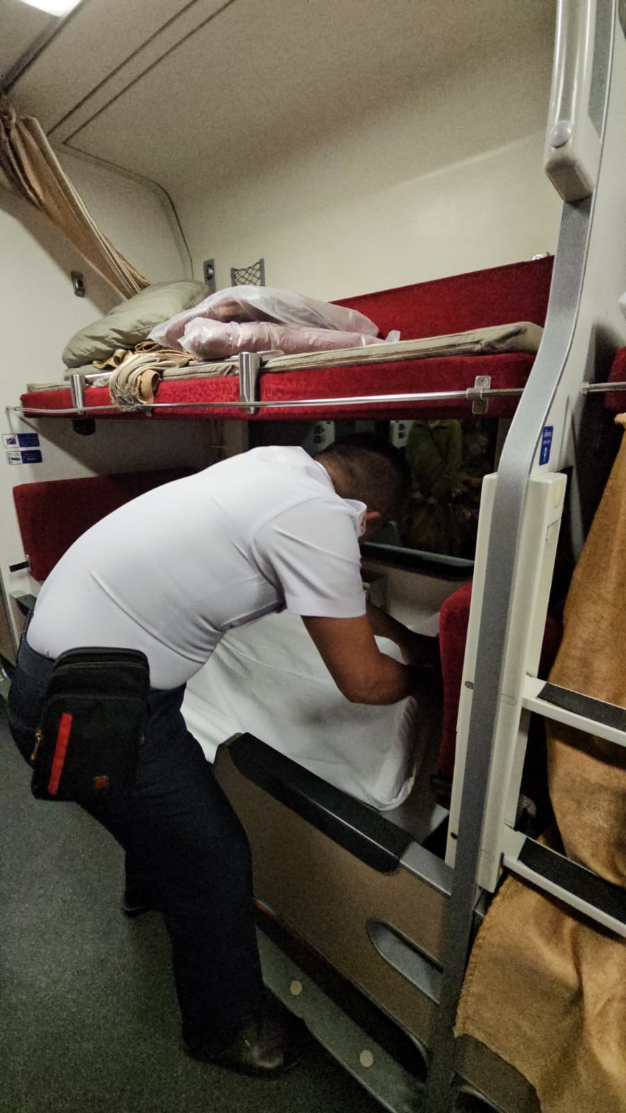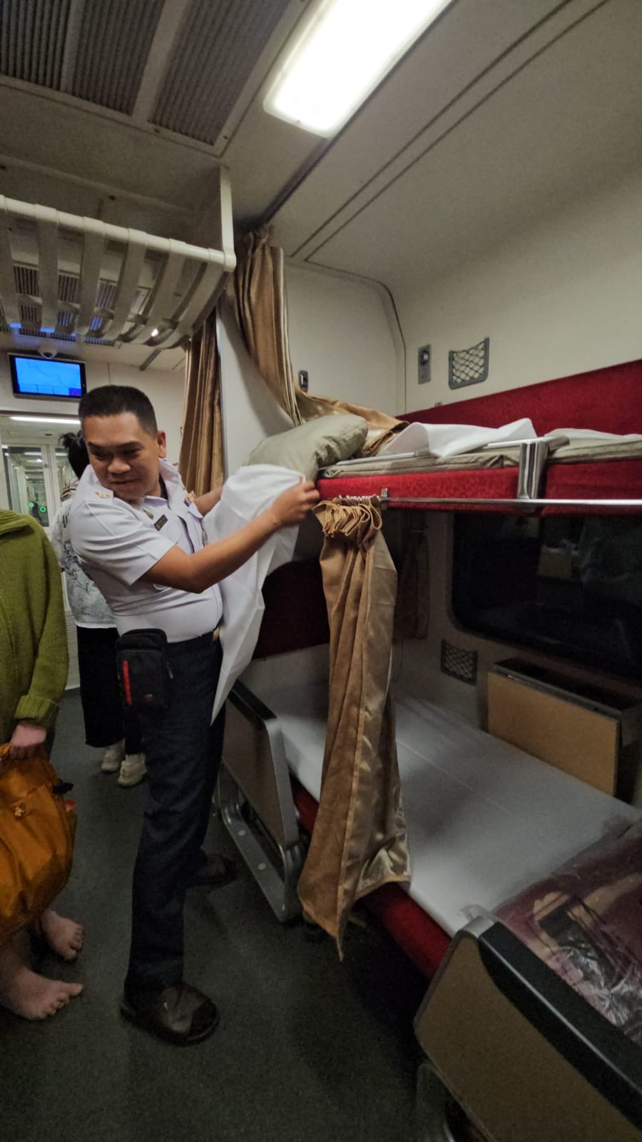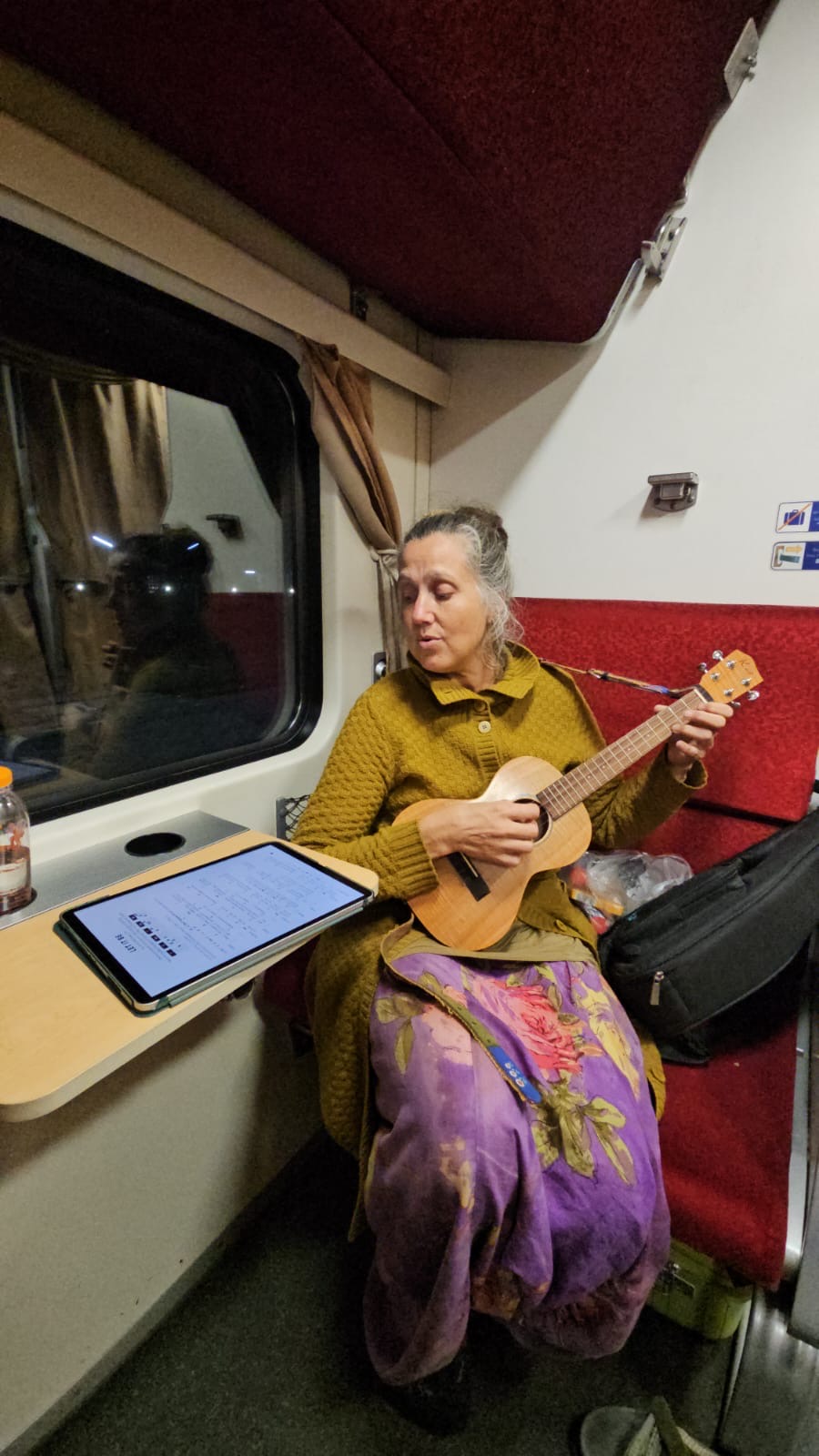 Bij de hostel een taxi besteld en alles liep op rolletjes. Overal konden we rustig aan doen zonder echt te hoeven wachten óf haasten. Zalig ontspannen. De kaartjes van de nachttrein opgepikt bij het Bossotel tegenover het station, even kijken maar de oude stoomlocomotief op de parkeerplaats en hup naar de trein. Ons plekje was zo gevonden en nu is het wachten tot ze de banken gaan ombouwen tot bedjes.