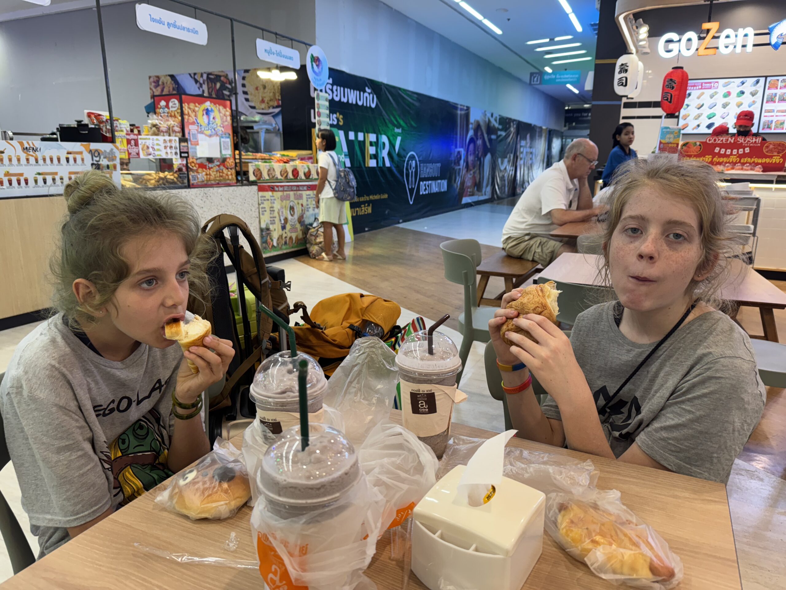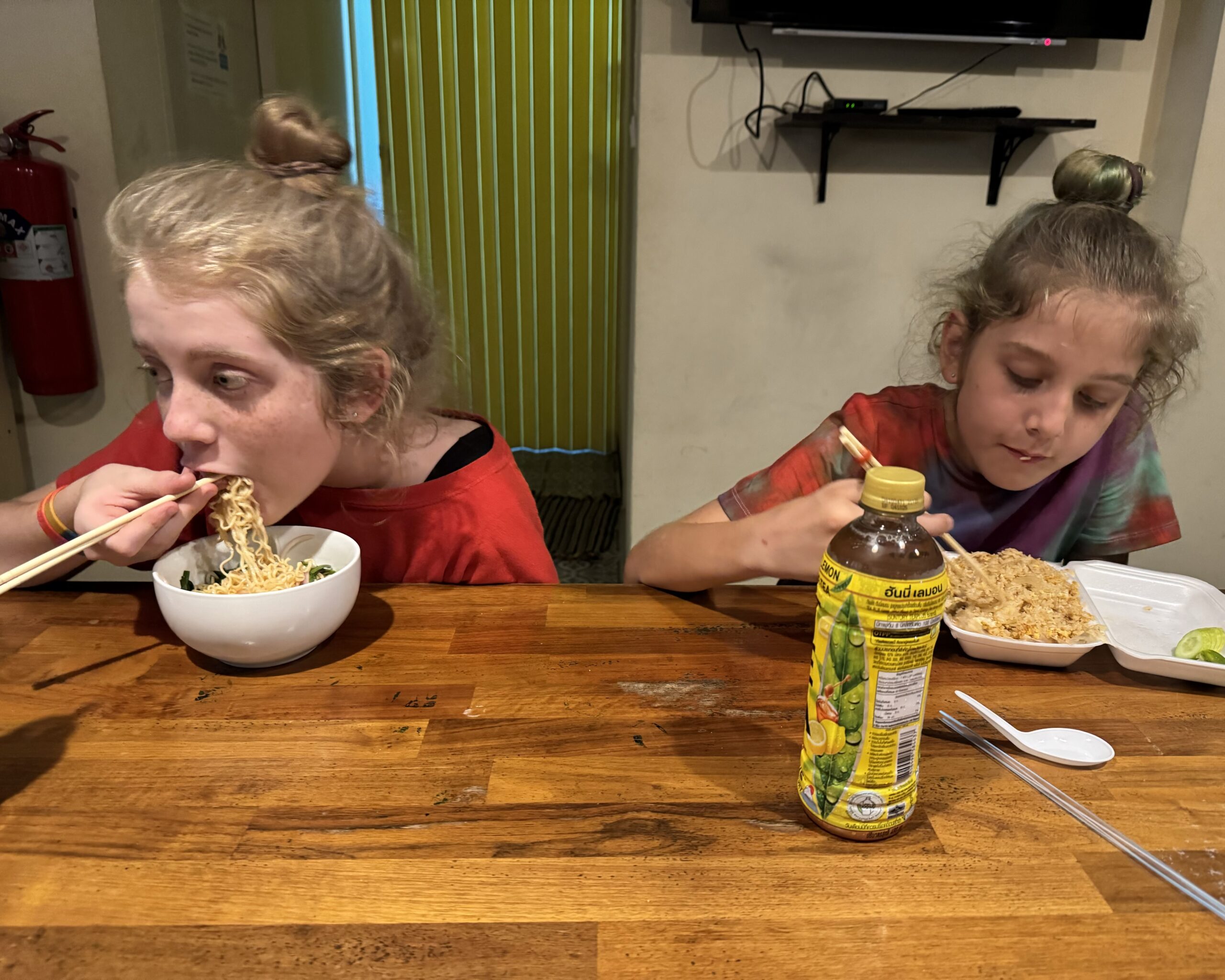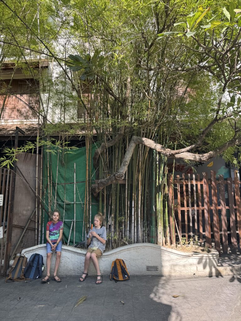 Echt super slecht geslapen, het matras lijkt harder te worden, dat is echt balen, want het is hier verder heel gezellig, schoon en de mensen zijn aardig. We zijn pas om 11 uur opgestaan, opgefrist en naar het ontbijt-restaurant gelopen. Storm nam weer noodlesoop en Ibis deze keer twee borden mango. Ik kon de pad thai niet weerstaan, dus we zijn soort van opgestart, ondanks fysieke vermoeidheid.