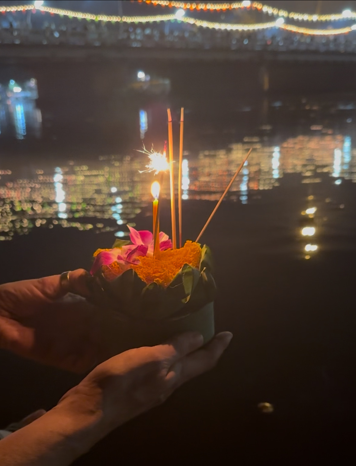 Eenmaal terug bij de hostel (ritje van anderhalf uur ongeveer) hebben we even gerust en gespeeld. Toen zijn we om 20u naar de brug gelopen en hebben onderweg bij kraampjes steeds eten gekocht. Op het grote plein net buiten de Tha Phae Gate hebben Ibis en Storm een lichtgevend vliegend dingetje gekocht, dat de lucht in gekatapulteerd wordt en dan als een soort tollend elfje naar beneden komt. We zagen de parade van heel mooi aangeklede mensen en praalwagens met draken en lichtjes en glitters en bloemen…. Wat een schitterend geheel. Maar ook erg veel herrie… dat was iets minder fijn.