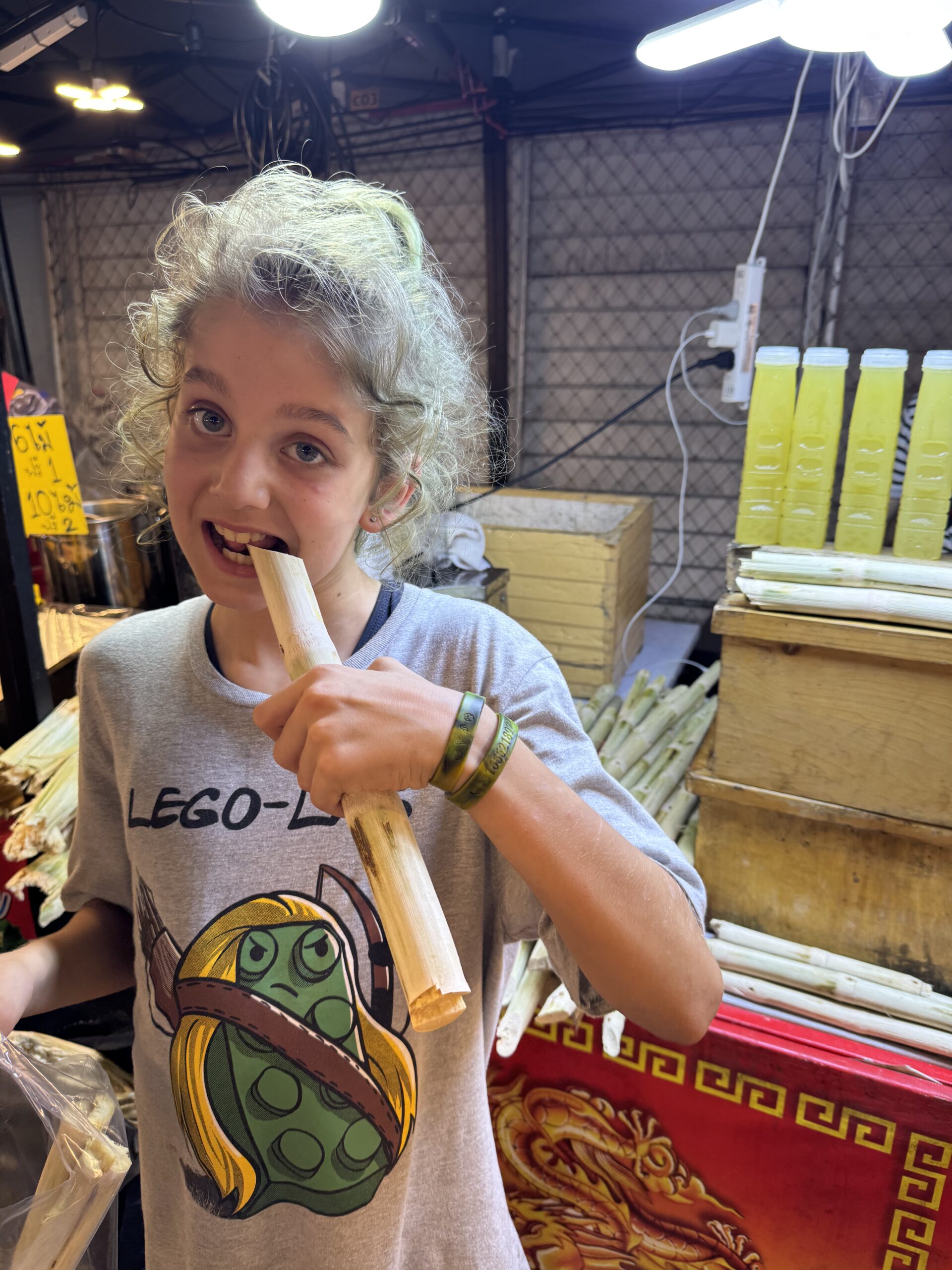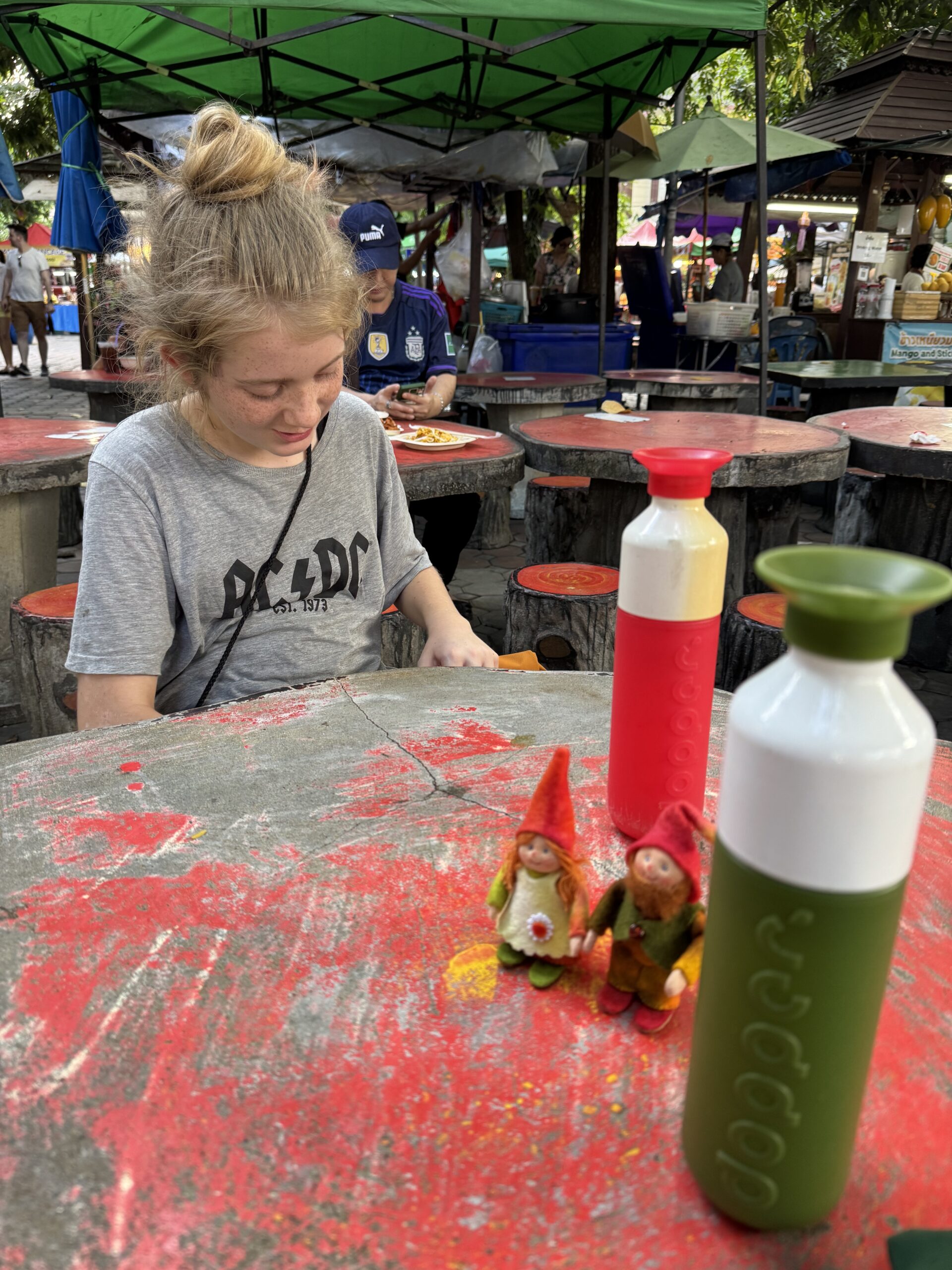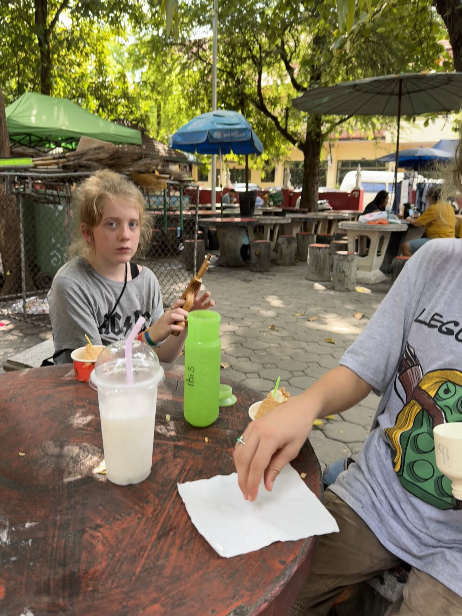 Bij de tempelplaats waar zondags de kraampjes open zijn even lekker verder gespeeld. Ibis graaft zijn dino uit, terwijl Storm mieren beschijnt met de laserlamp. Onder het genot van een Nutella-pancake en SRM.