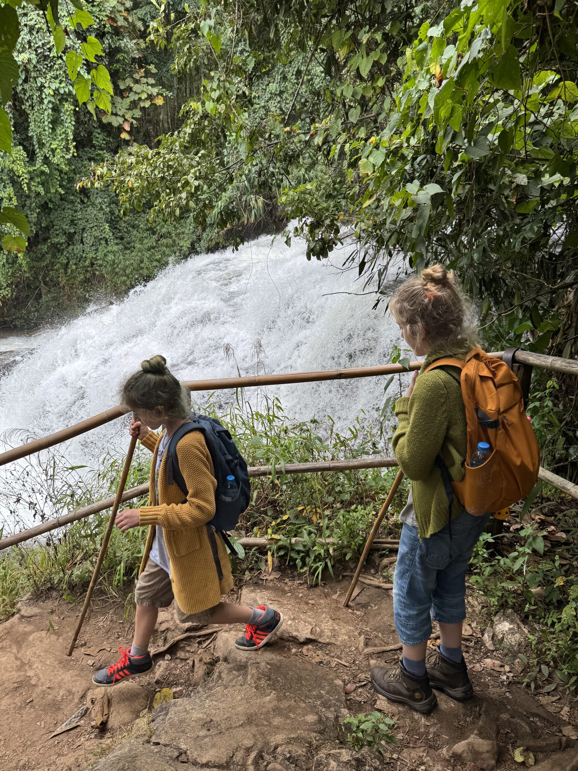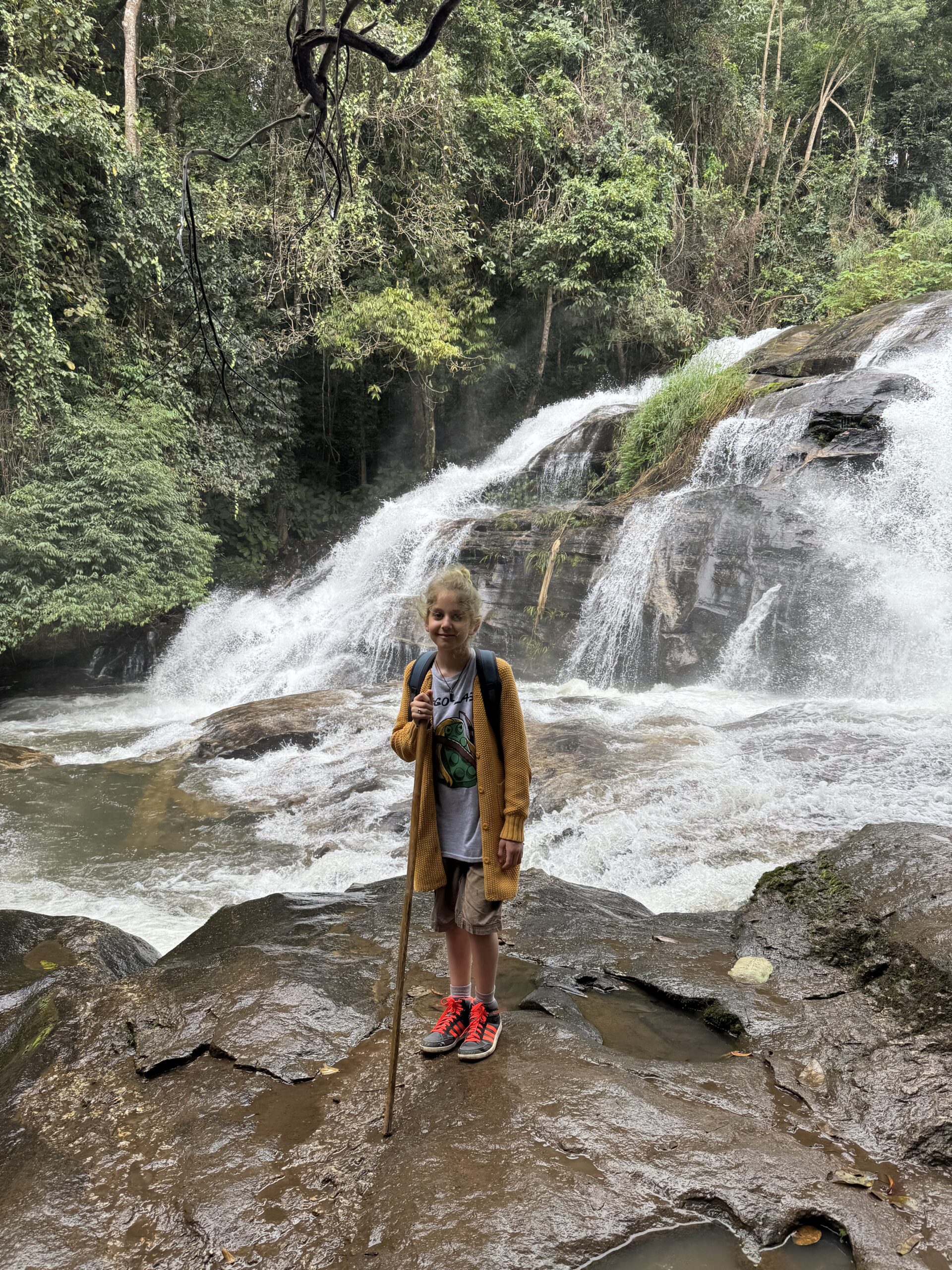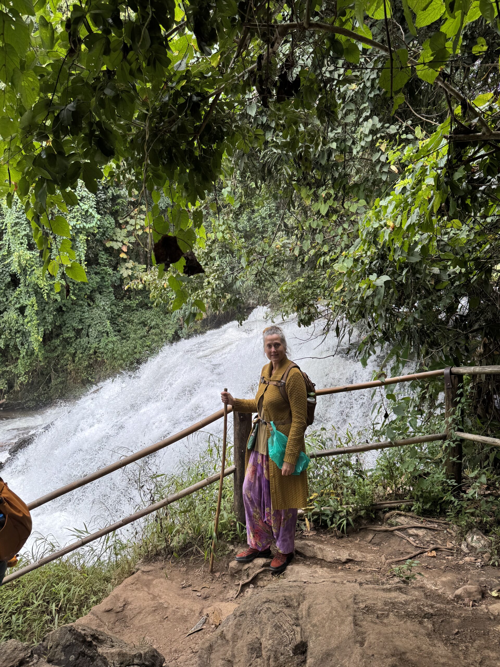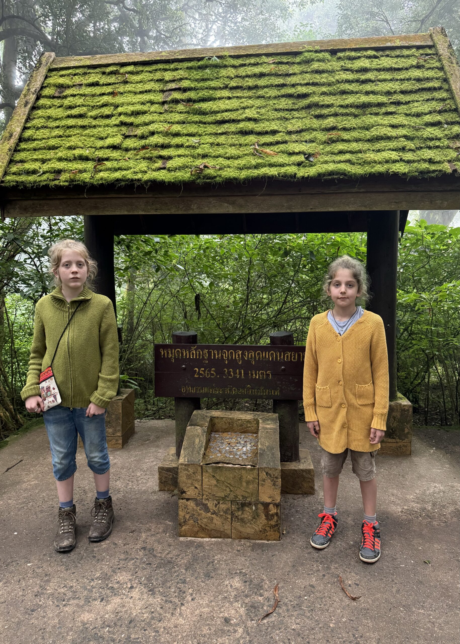 Mooi op tijd voor de taxi die er al om 7:01u was. Het was een heel mooie wandeling van twee uur door de jungle, langs een mega mooie waterval, heel enge grote spinnen op slechts anderhalve meter afstand van het pad, langs rijstvelden, langs aardpeer-bosjes en langs de koffieplantage. Daarna verder gereden naar het hoogste punt van Thailand, wat echt sprookjesachtig mooi was (en natuurlijk lag mijn rugzak met de lieve kabouter en dwerg nog in de bus, dus stom, geen prachtige foto’s met ons schattige duo) en daar kort gewandeld. Toen door naar de twee pagodes. Eentje voor de koning en eentje voor de koningin. Het uitzicht was niet zo denderend als dat het had kunnen zijn vanwege de mist en een beetje neerslag. Dat was niet zo erg, er waren al meer dan genoeg indrukken opgedaan en het was behoorlijk vermoeiend om om 7 uur klaar te staan en pas om 17.45u terug bij de hostel te komen. Bij de laatste waterval, de mooiste volgens sommigen, zijn we met een paar anderen in de bus blijven zitten, omdat we gewoon te moe waren. Dan hebben we nog iets voor een andere keer om te ontdekken.