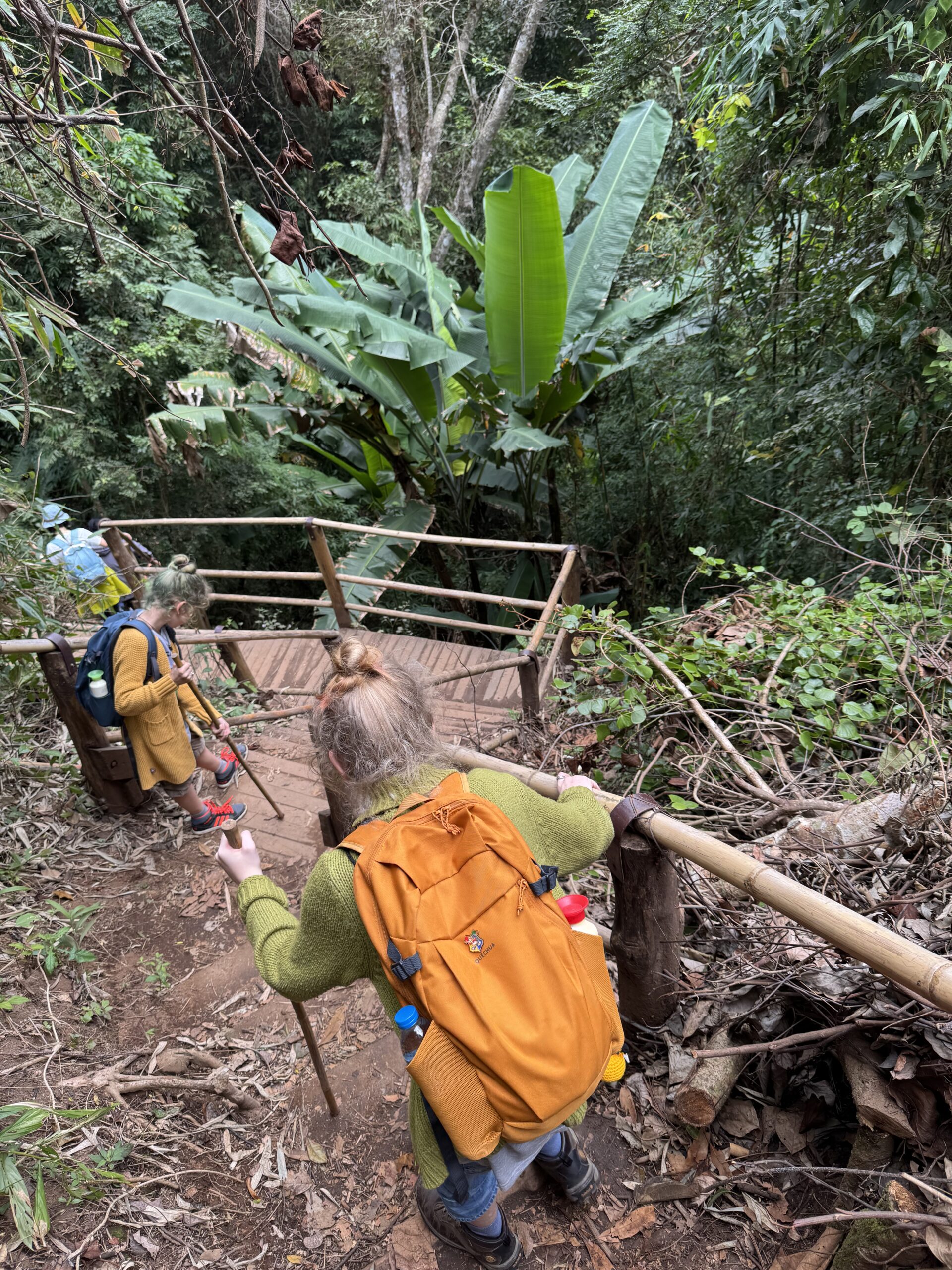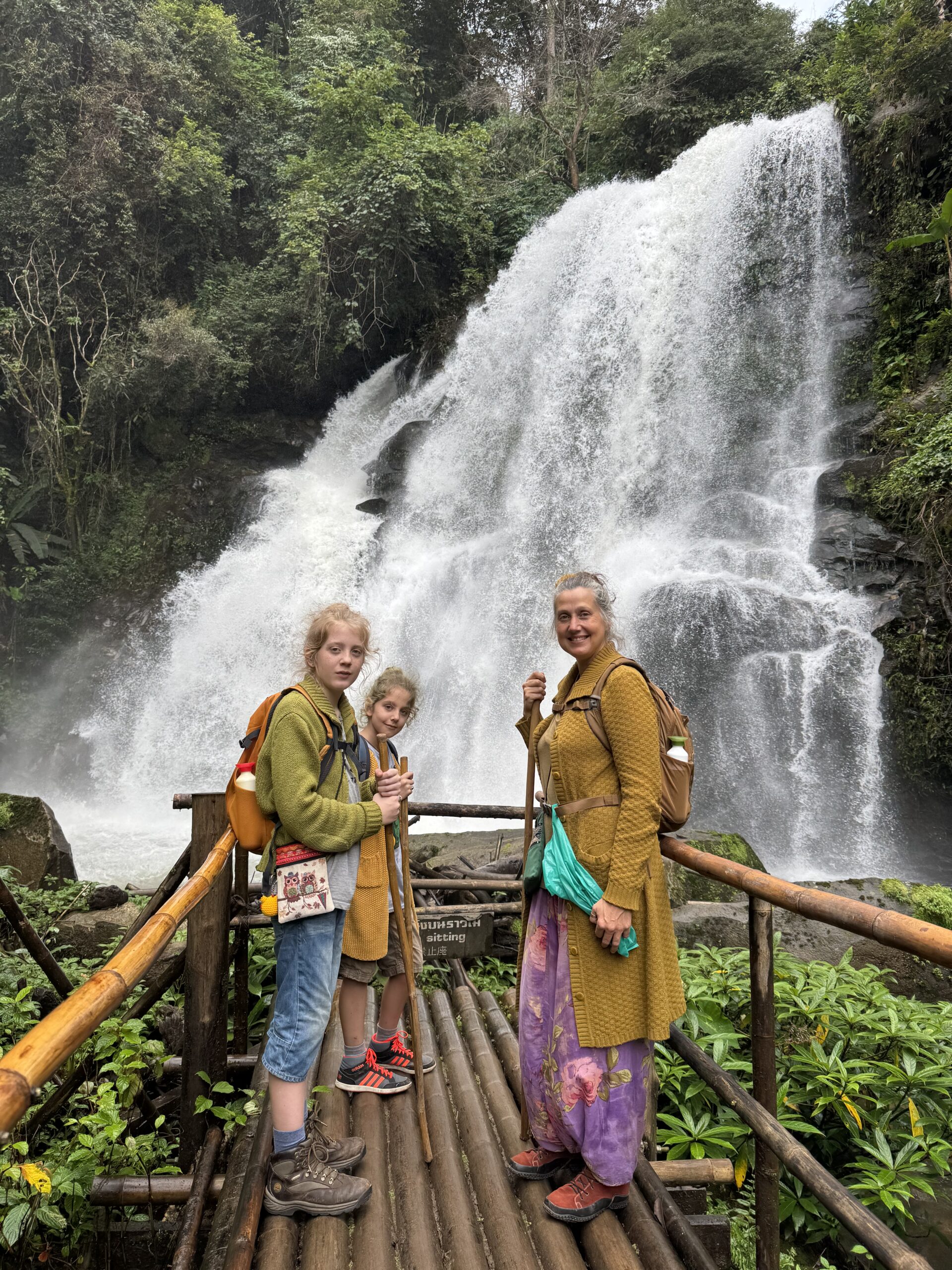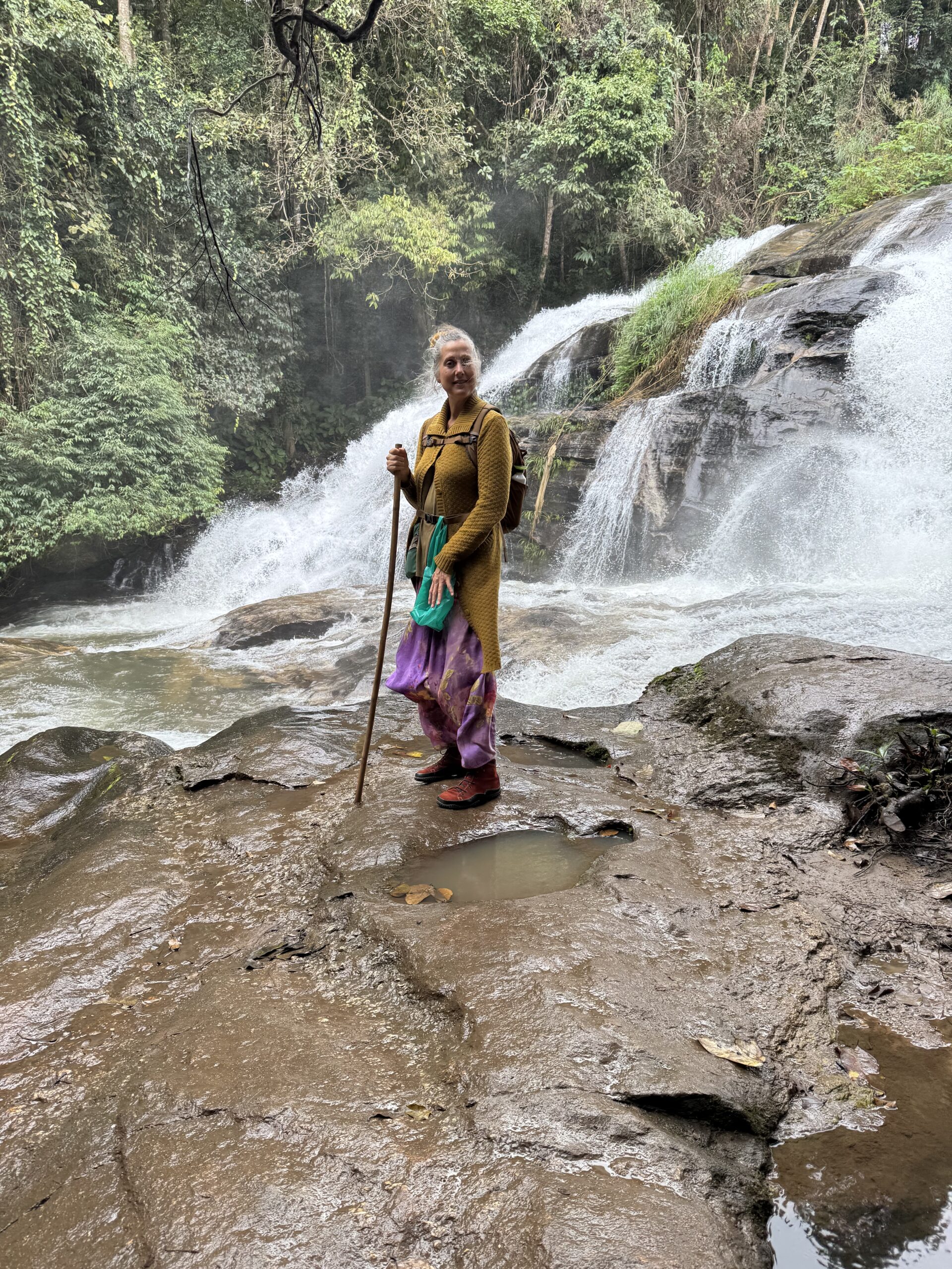 Mooi op tijd voor de taxi die er al om 7:01u was. Het was een heel mooie wandeling van twee uur door de jungle, langs een mega mooie waterval, heel enge grote spinnen op slechts anderhalve meter afstand van het pad, langs rijstvelden, langs aardpeer-bosjes en langs de koffieplantage. Daarna verder gereden naar het hoogste punt van Thailand, wat echt sprookjesachtig mooi was (en natuurlijk lag mijn rugzak met de lieve kabouter en dwerg nog in de bus, dus stom, geen prachtige foto’s met ons schattige duo) en daar kort gewandeld. Toen door naar de twee pagodes. Eentje voor de koning en eentje voor de koningin. Het uitzicht was niet zo denderend als dat het had kunnen zijn vanwege de mist en een beetje neerslag. Dat was niet zo erg, er waren al meer dan genoeg indrukken opgedaan en het was behoorlijk vermoeiend om om 7 uur klaar te staan en pas om 17.45u terug bij de hostel te komen. Bij de laatste waterval, de mooiste volgens sommigen, zijn we met een paar anderen in de bus blijven zitten, omdat we gewoon te moe waren. Dan hebben we nog iets voor een andere keer om te ontdekken.