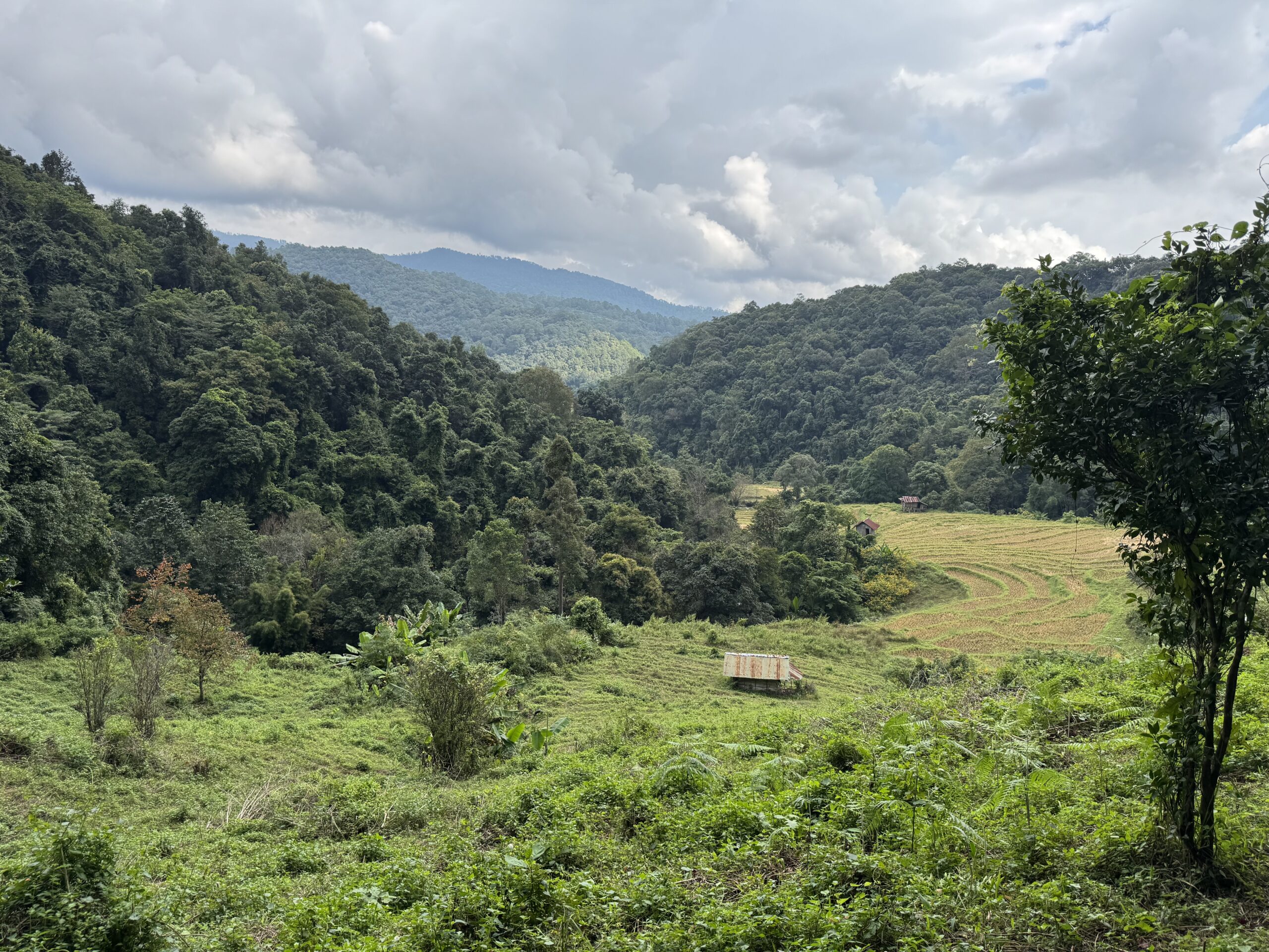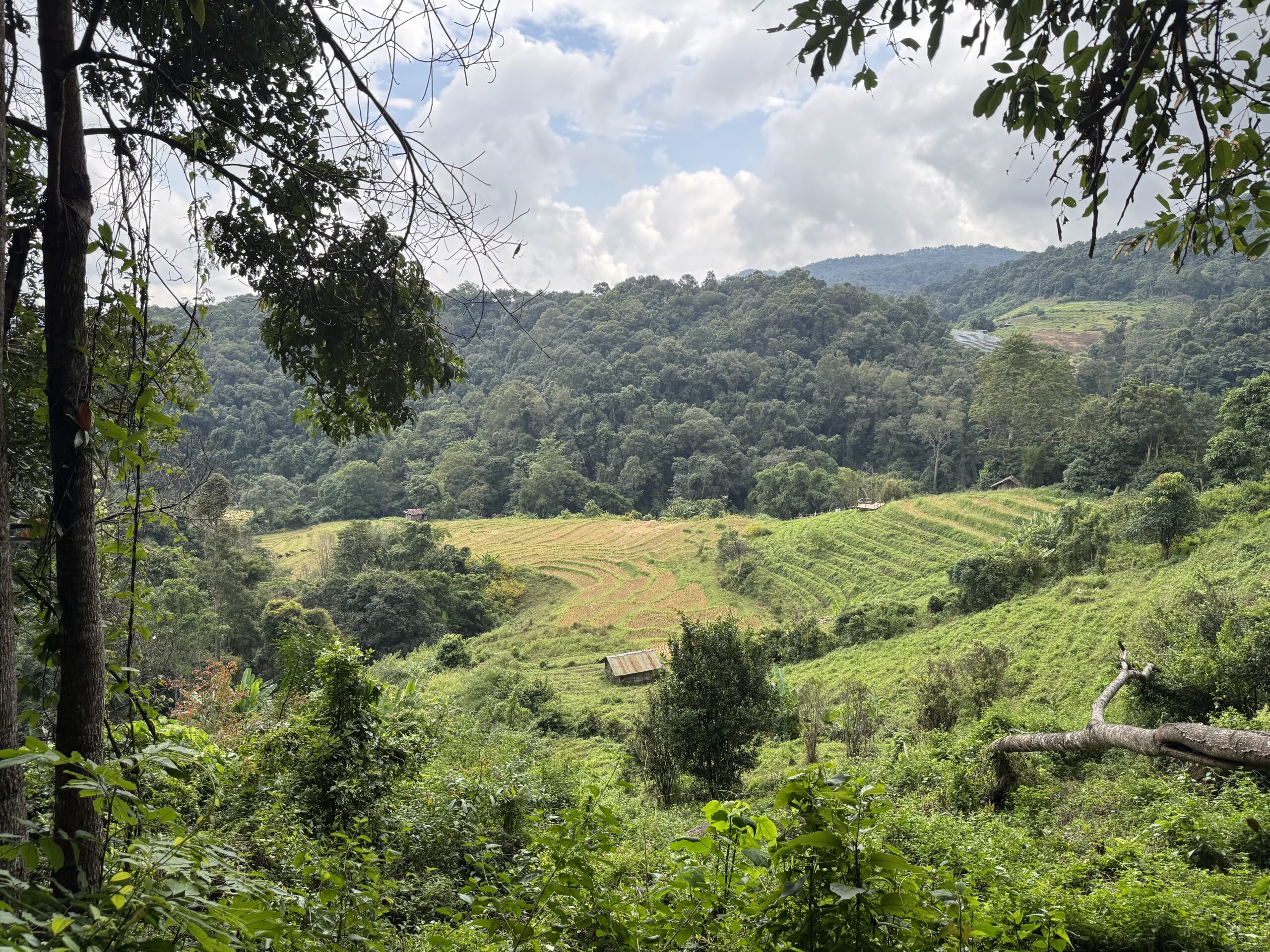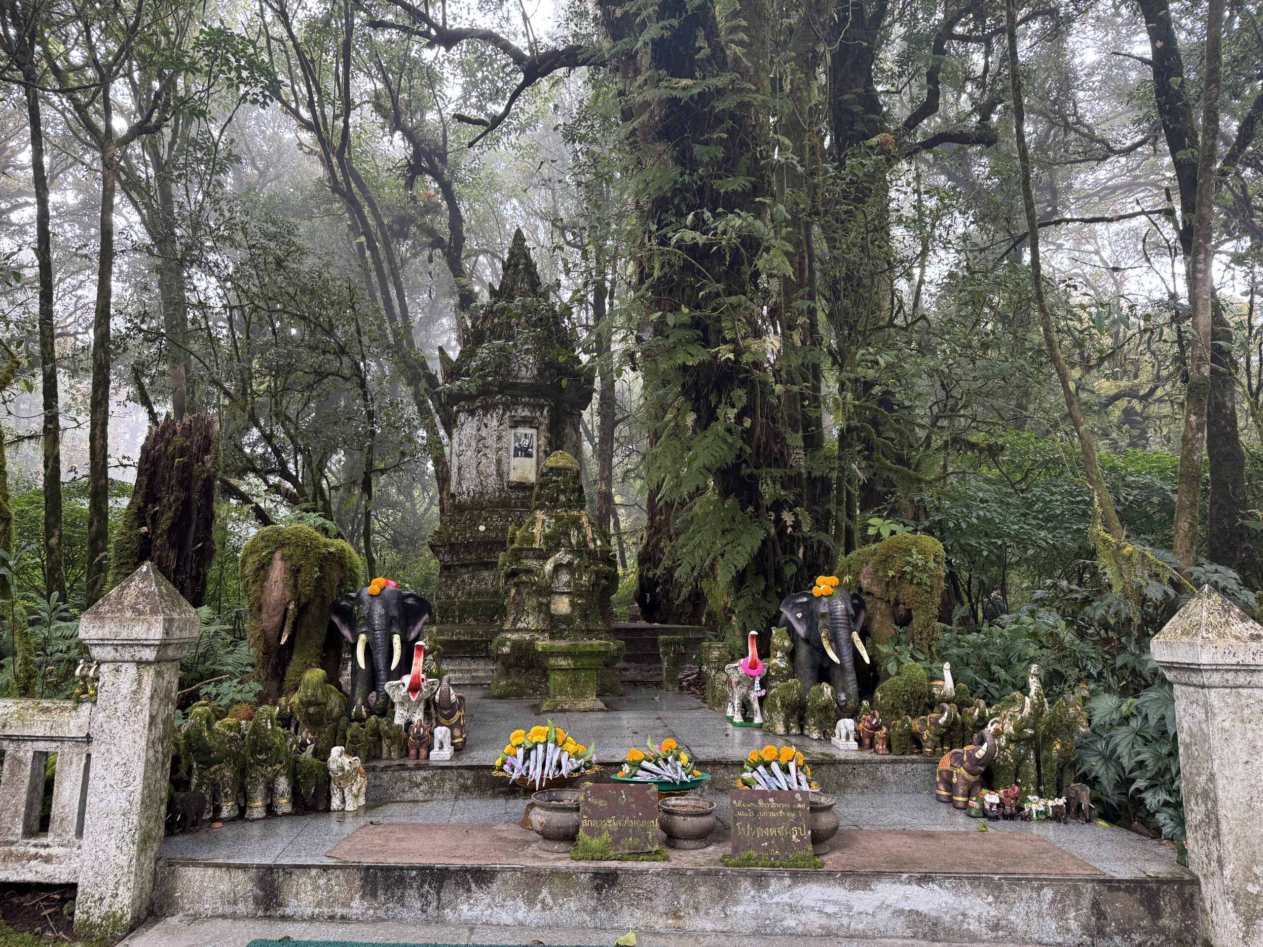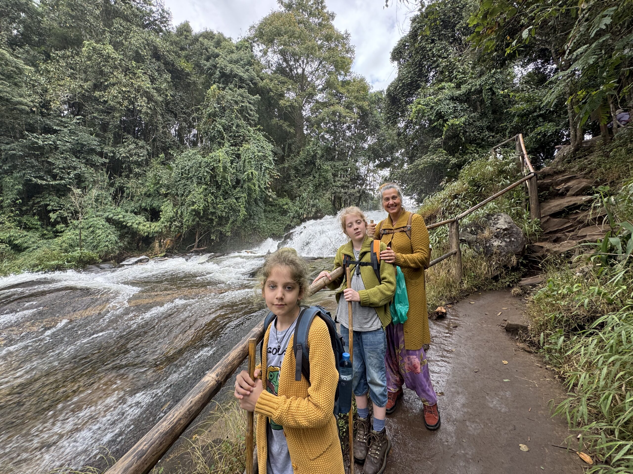 Mooi op tijd voor de taxi die er al om 7:01u was. Het was een heel mooie wandeling van twee uur door de jungle, langs een mega mooie waterval, heel enge grote spinnen op slechts anderhalve meter afstand van het pad, langs rijstvelden, langs aardpeer-bosjes en langs de koffieplantage. Daarna verder gereden naar het hoogste punt van Thailand, wat echt sprookjesachtig mooi was (en natuurlijk lag mijn rugzak met de lieve kabouter en dwerg nog in de bus, dus stom, geen prachtige foto’s met ons schattige duo) en daar kort gewandeld. Toen door naar de twee pagodes. Eentje voor de koning en eentje voor de koningin. Het uitzicht was niet zo denderend als dat het had kunnen zijn vanwege de mist en een beetje neerslag. Dat was niet zo erg, er waren al meer dan genoeg indrukken opgedaan en het was behoorlijk vermoeiend om om 7 uur klaar te staan en pas om 17.45u terug bij de hostel te komen. Bij de laatste waterval, de mooiste volgens sommigen, zijn we met een paar anderen in de bus blijven zitten, omdat we gewoon te moe waren. Dan hebben we nog iets voor een andere keer om te ontdekken.