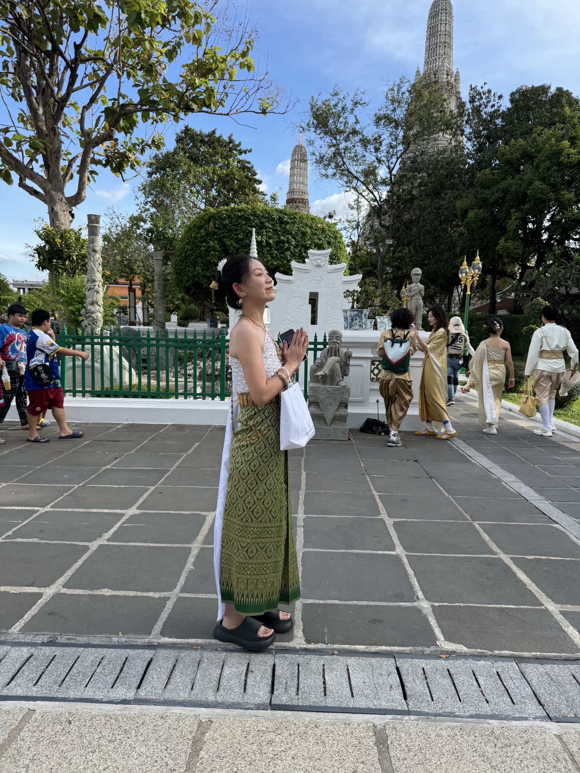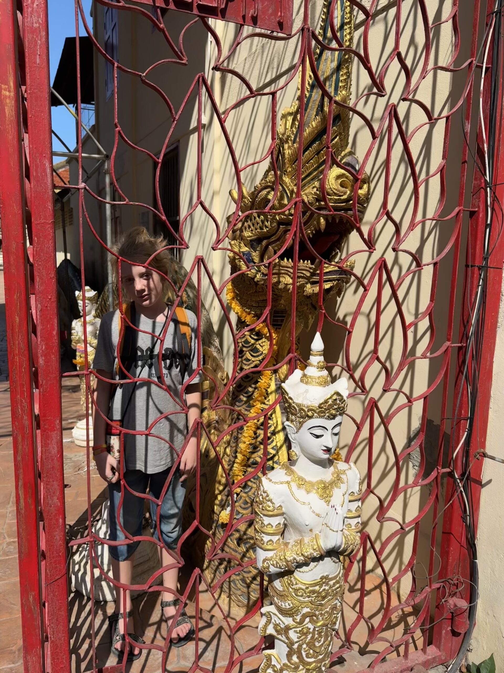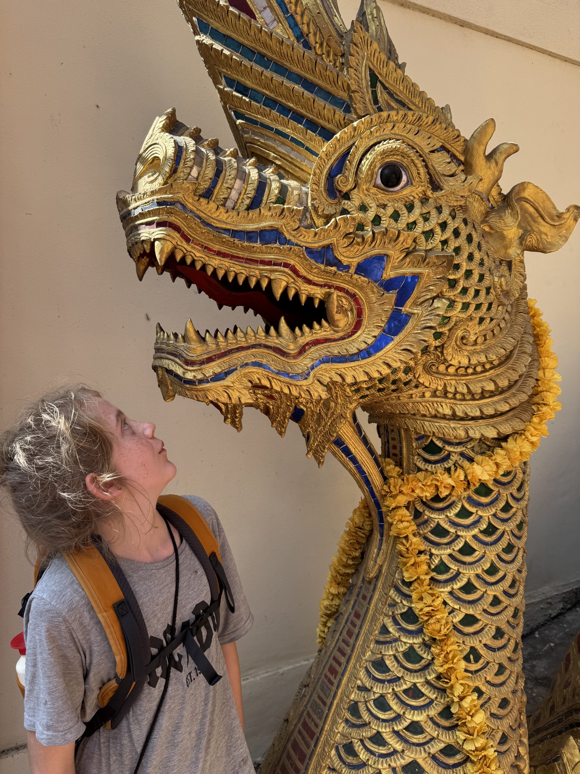 We zijn nog langs de hostel gelopen waar ik met Swaen verbleef en vanaf daar naar de plek waar het gezellige muziek festival en eetkraampjes zijn…. Daar gaan we vanavond naartoe en eten. We kwamen ook bij een tempel met een witte draak met een gouden poepgat. Iemand kreeg dus de taak om het poepgat van deze draak goud te maken. Die gedachte vinden wij hilarisch. De uitvoering evengoed.