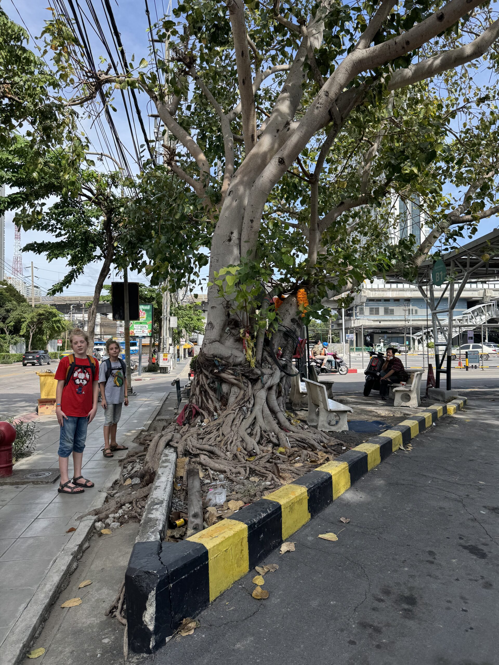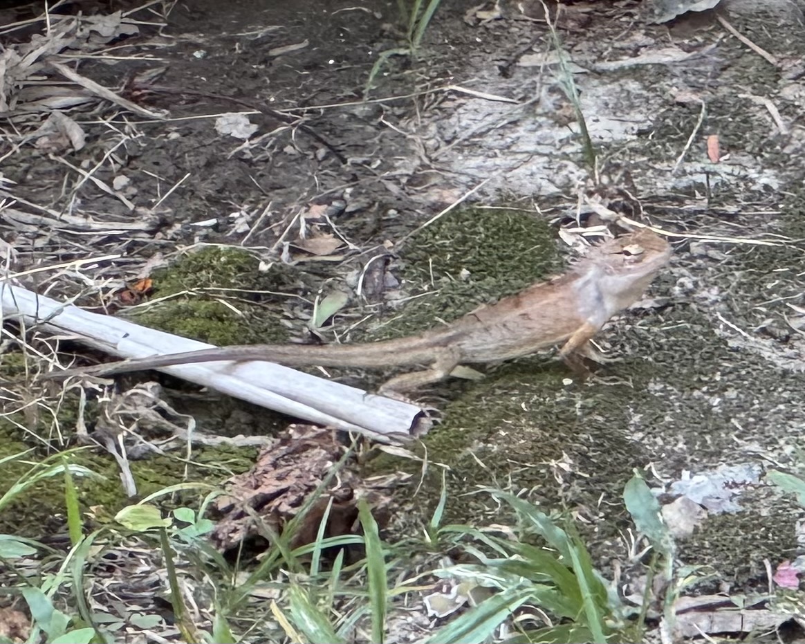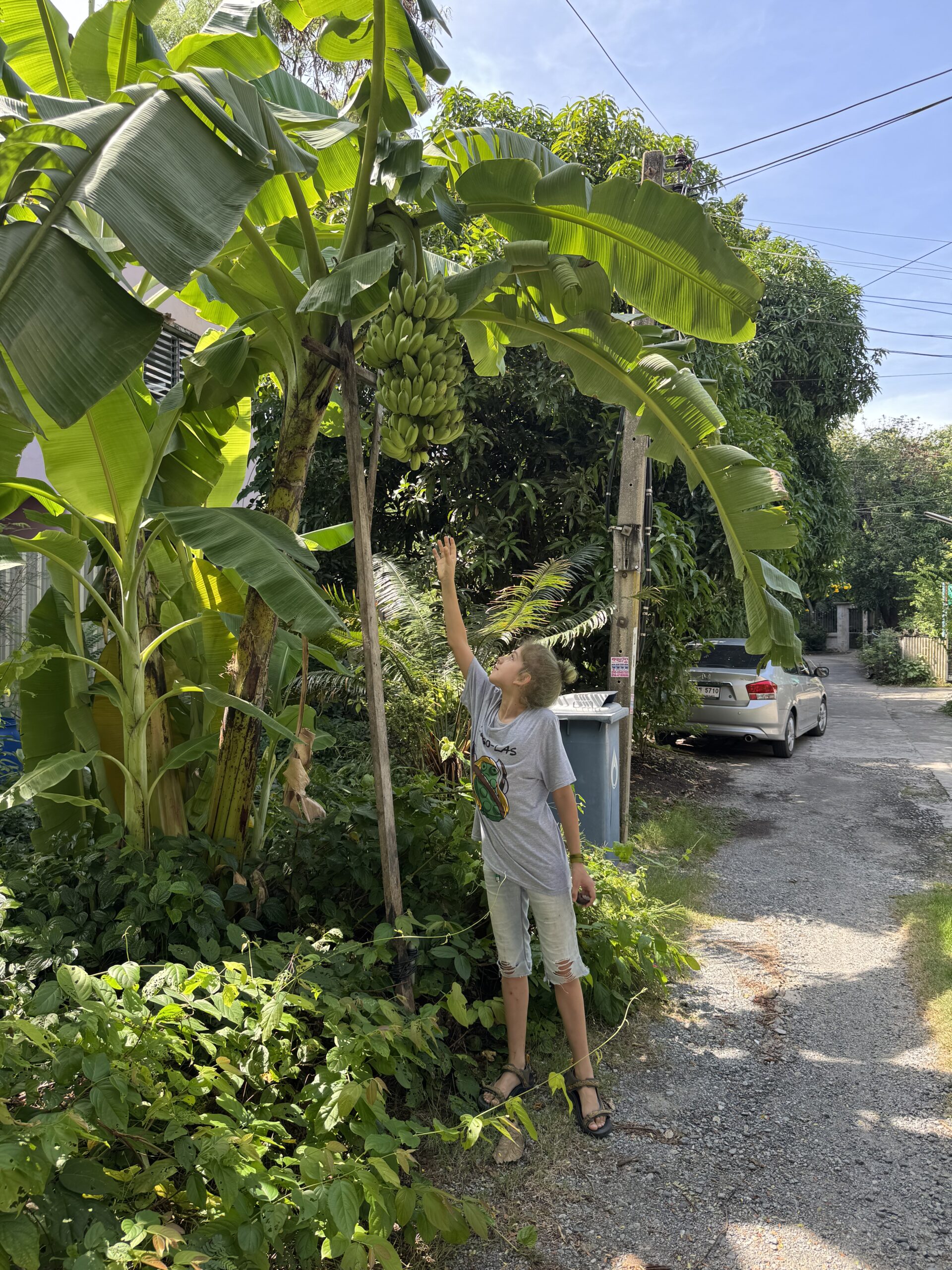 We zijn opeens op de helft van de reis én de helft van Bangkok, de tijd vliegt zeggen de jongens… Ze vervelen zich niet, ze vinden het ook niet teveel. Ibis wil wel meer doen, maar kan dat ook, dus maakt steeds wanneer hij wil een ommetje op varanen-jacht. Vanochtend hoorde hij iets in de struiken, gekeken en daar was ie weer! De grote varaan van gisteren! Nu wél op beeld, al was het gisteren veel duidelijker, nu had hij een snellere tred, maar geeft niet.
