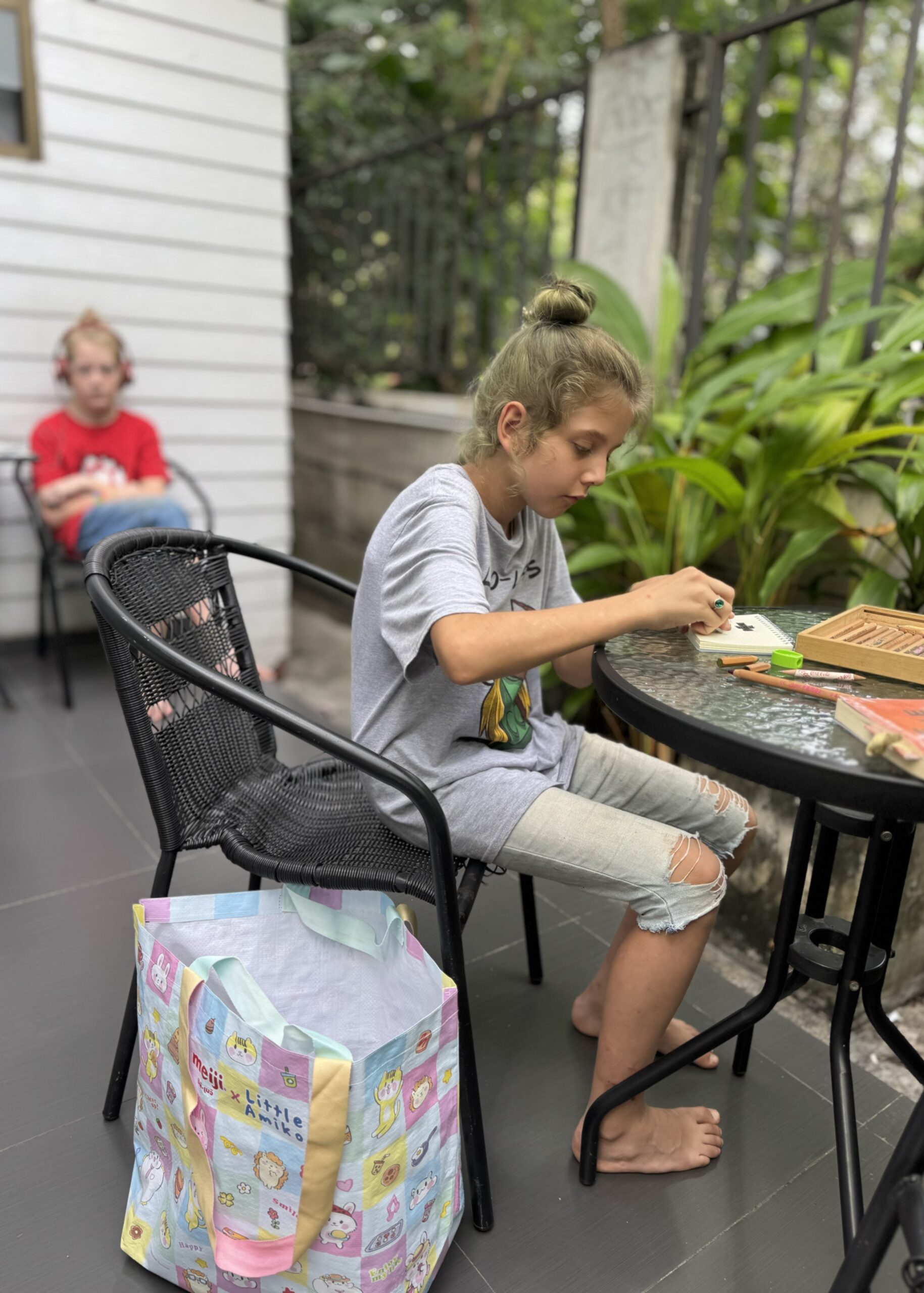 Rustig vrij dagje gehad. Ibis is er weer een paar keer in zijn eentje op uit gegaan om varanen te spotten, zonder succes, maar toch lekker voor zichzelf bezig geweest en Storm heeft gelezen in De Hobbit en weer gespeeld met zijn gekochte speelgoed. Ik heb gelezen in een boekje dat ik hier in de kast vond “the art of not giving a fuck” en samen met Ibis getekend/gekleurd. Storm heeft wat ideeën opgeschreven voor een boek.