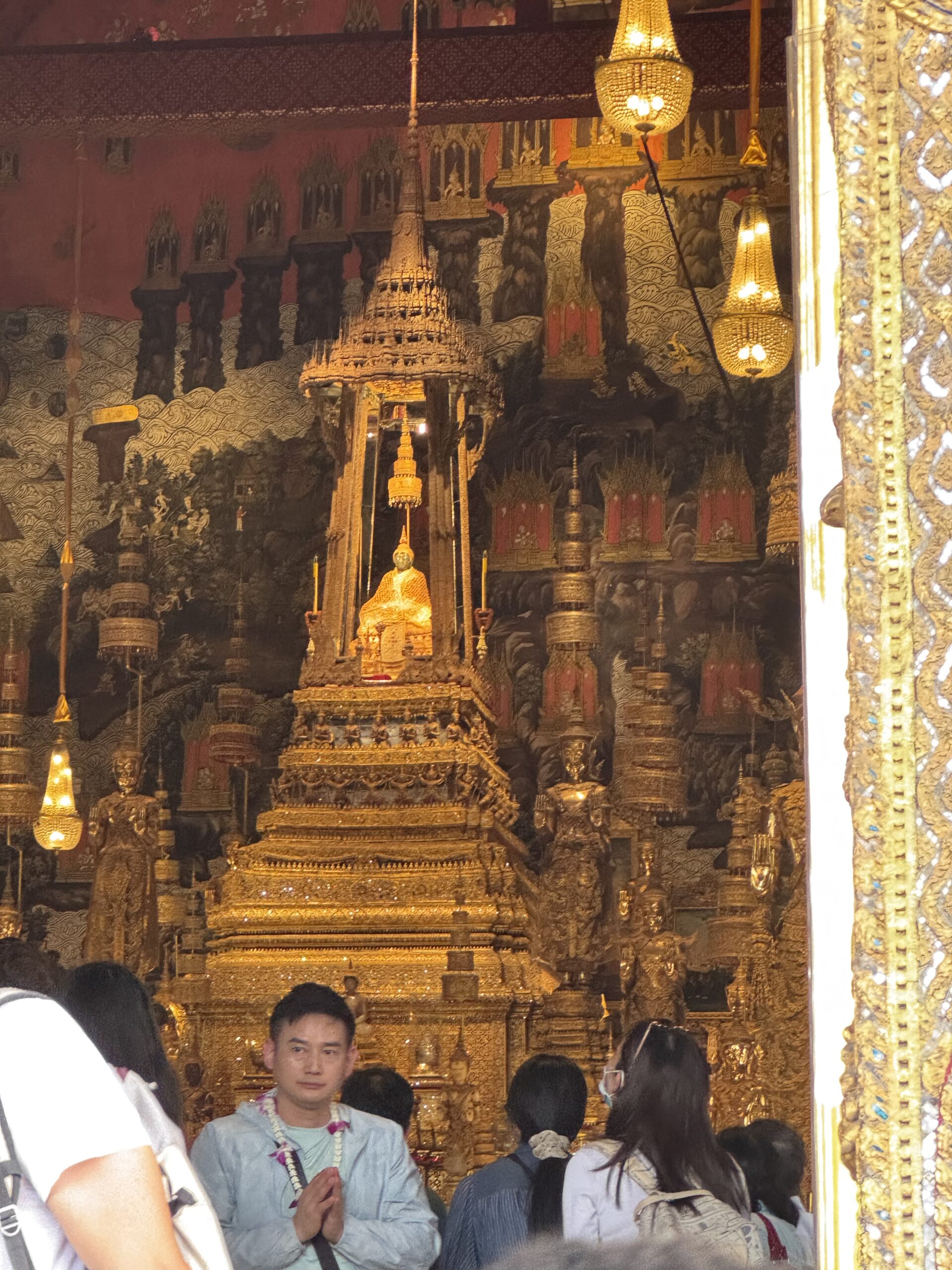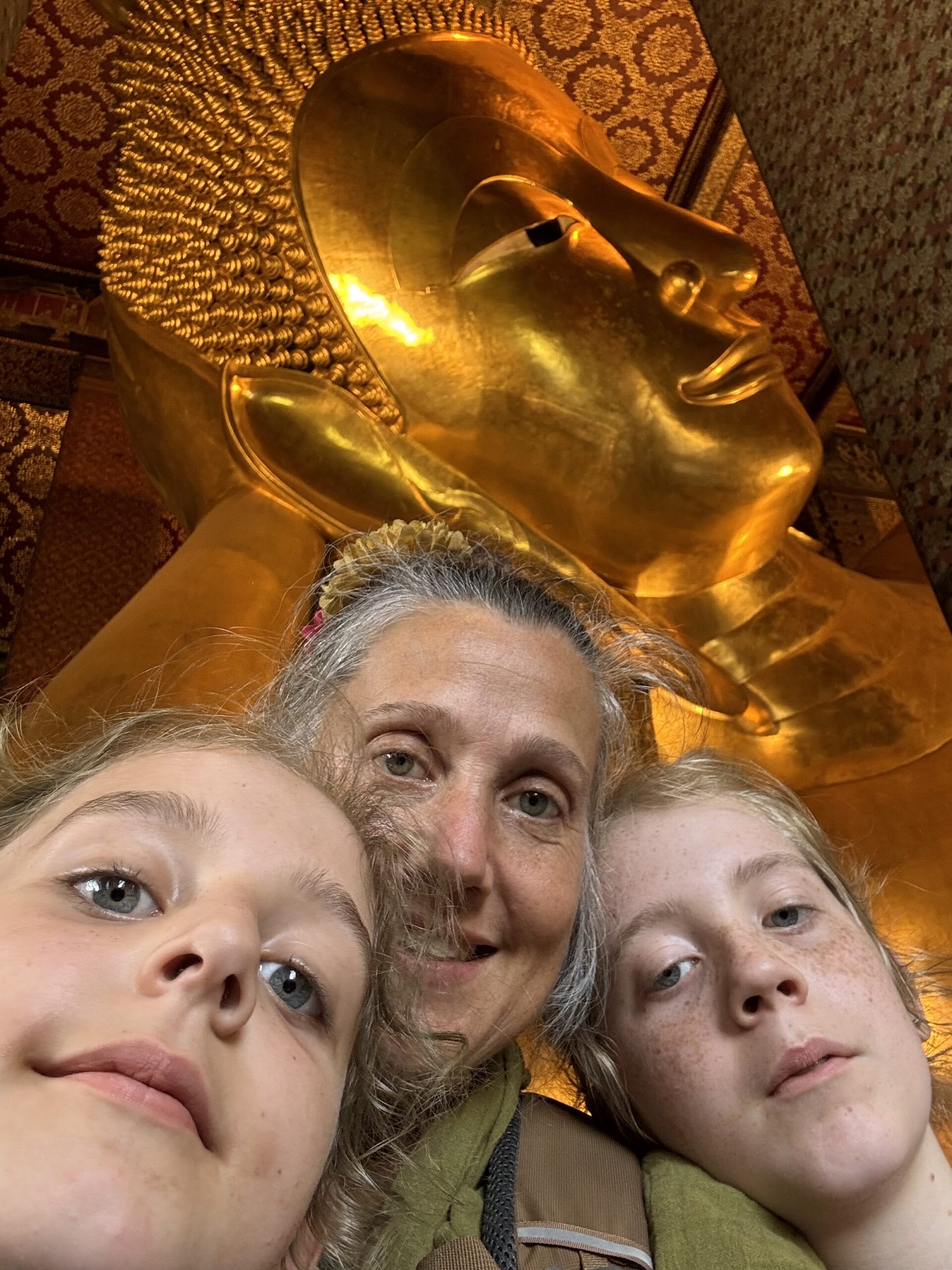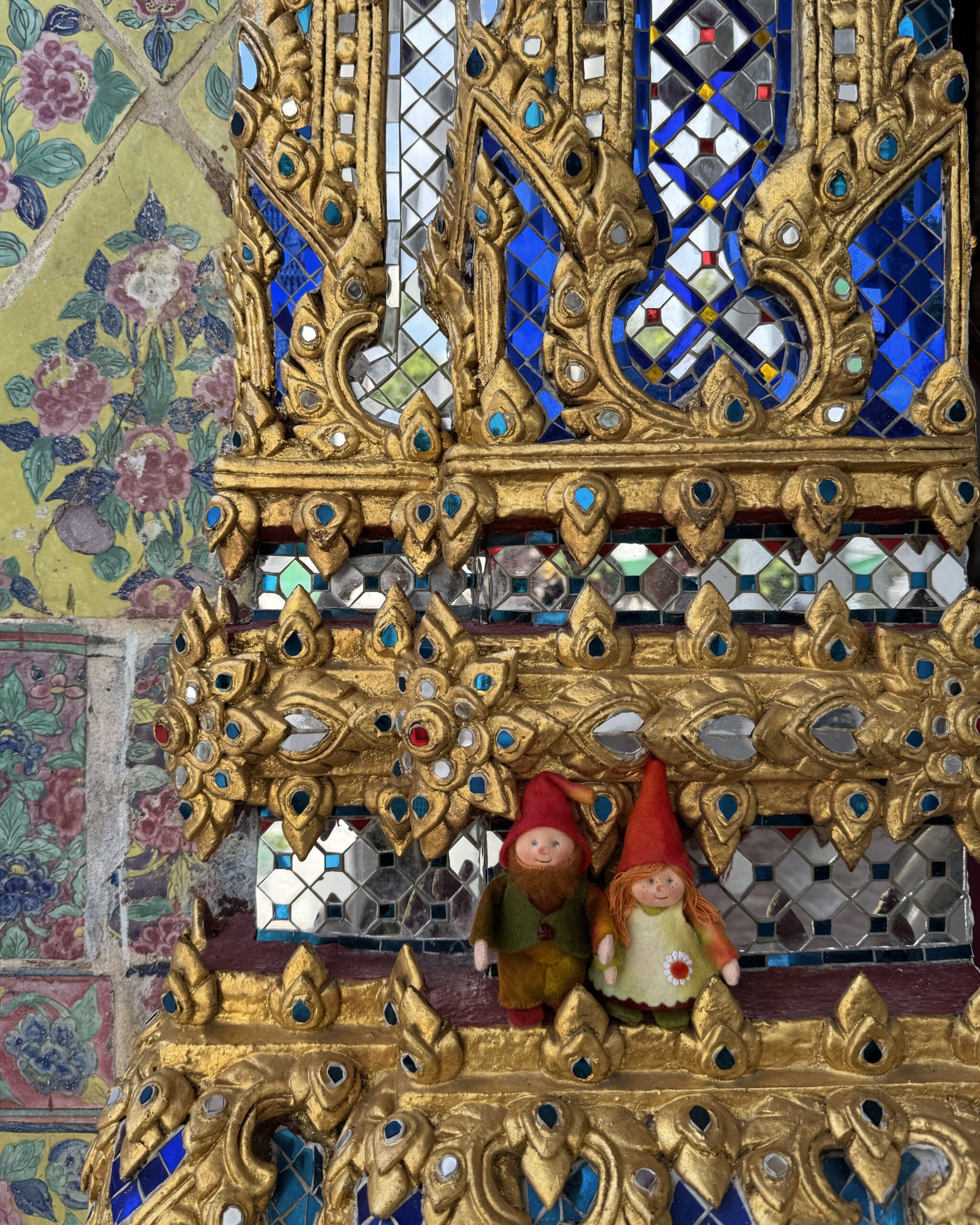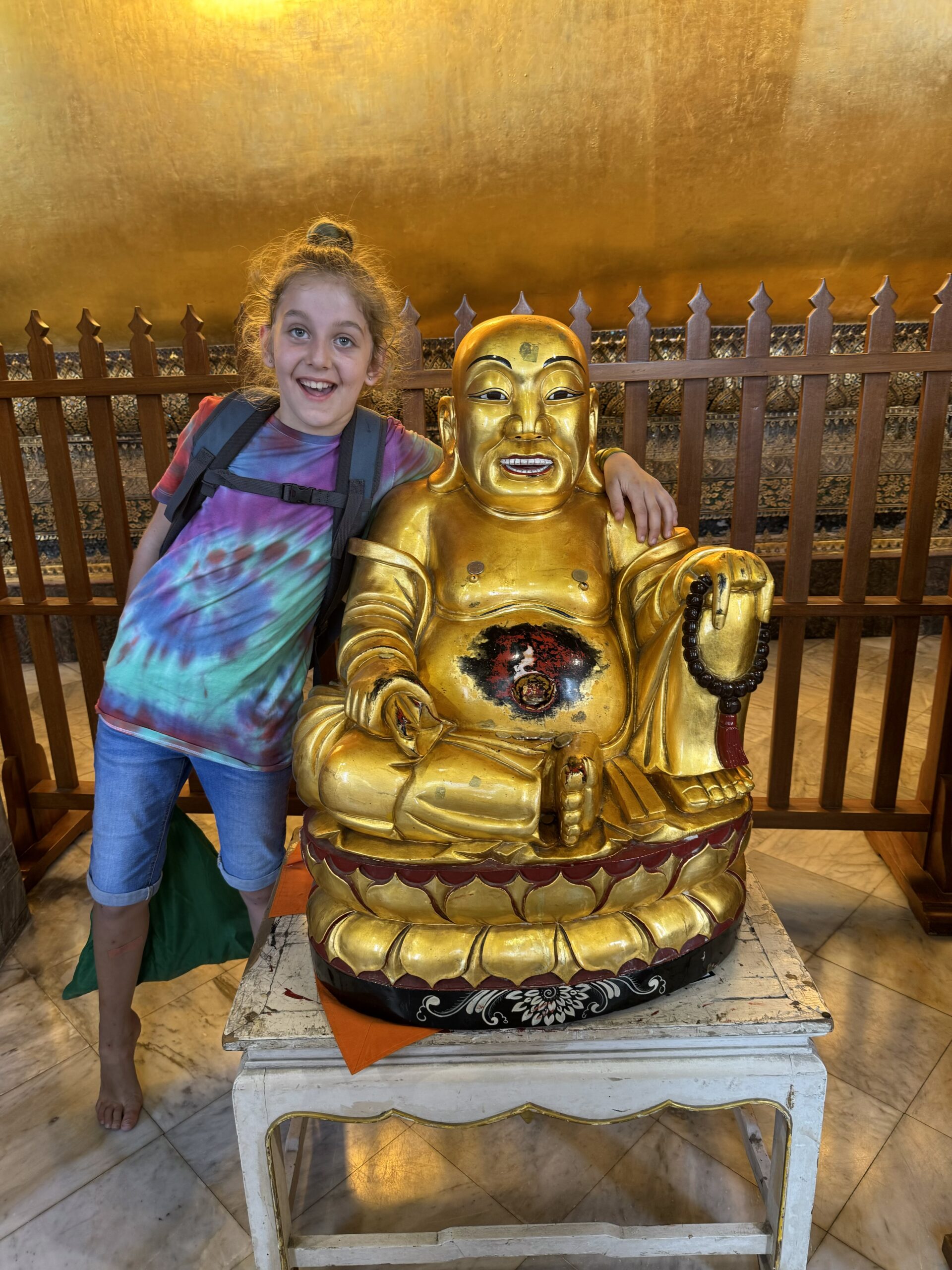 Weer met de hop-on-hop-of boot naar The Grand Palace geweest, vervelend verrast bij de ingang dat mijn shawl niet mocht, maar alleen T-shirts en lange broeken ook voor kinderen moeten, maar geen probleem, want je koopt daar ter plekke gewoon een stom T-shirt en een saaie broek…. Naaiers. Als ze dat in de folder hadden gezet dan hadden we dat natuurlijk gedaan, maar we dachten dat alles in orde was. We mochten overal op deze manier namelijk naar binnen en nu opeens moest er kleding aangepast (lees gekocht) worden. Nouja, ik mocht de shawl als rok om Ibis wikkelen, dat verlengde zijn broek toch zeker met 3 cm en dat was helemaal prima, want nu droeg hij een rok (ze dachten waarschijnlijk dat hij een meisje was) en dan mocht je wél scheenbenen zien. Zucht. Storm een groene broek waar Ibis alvast heel erg naar uitkijkt om in te groeien en dan kunnen we in het paleis en naar de tempel binnen de paleismuren met de smaragdgroene Boeddah, die dus best klein en van Jade blijkt te zijn…. Hahaha. Wel genoten van alle pracht en praal, maar eigenlijk ook wat overloaded… zoveel.