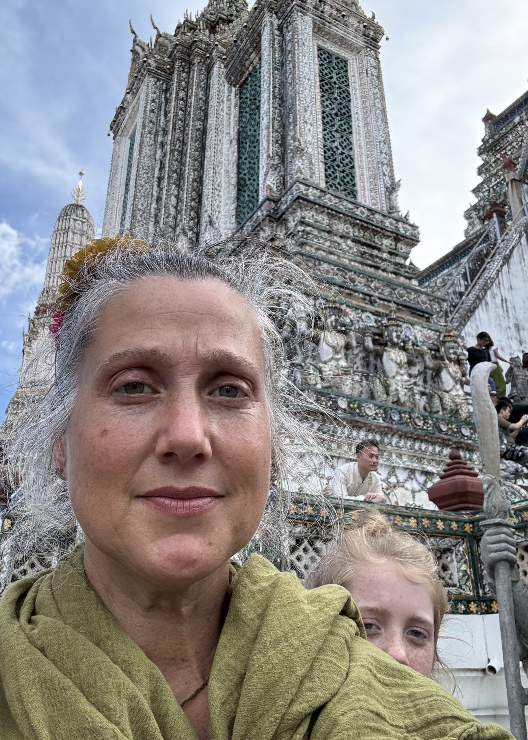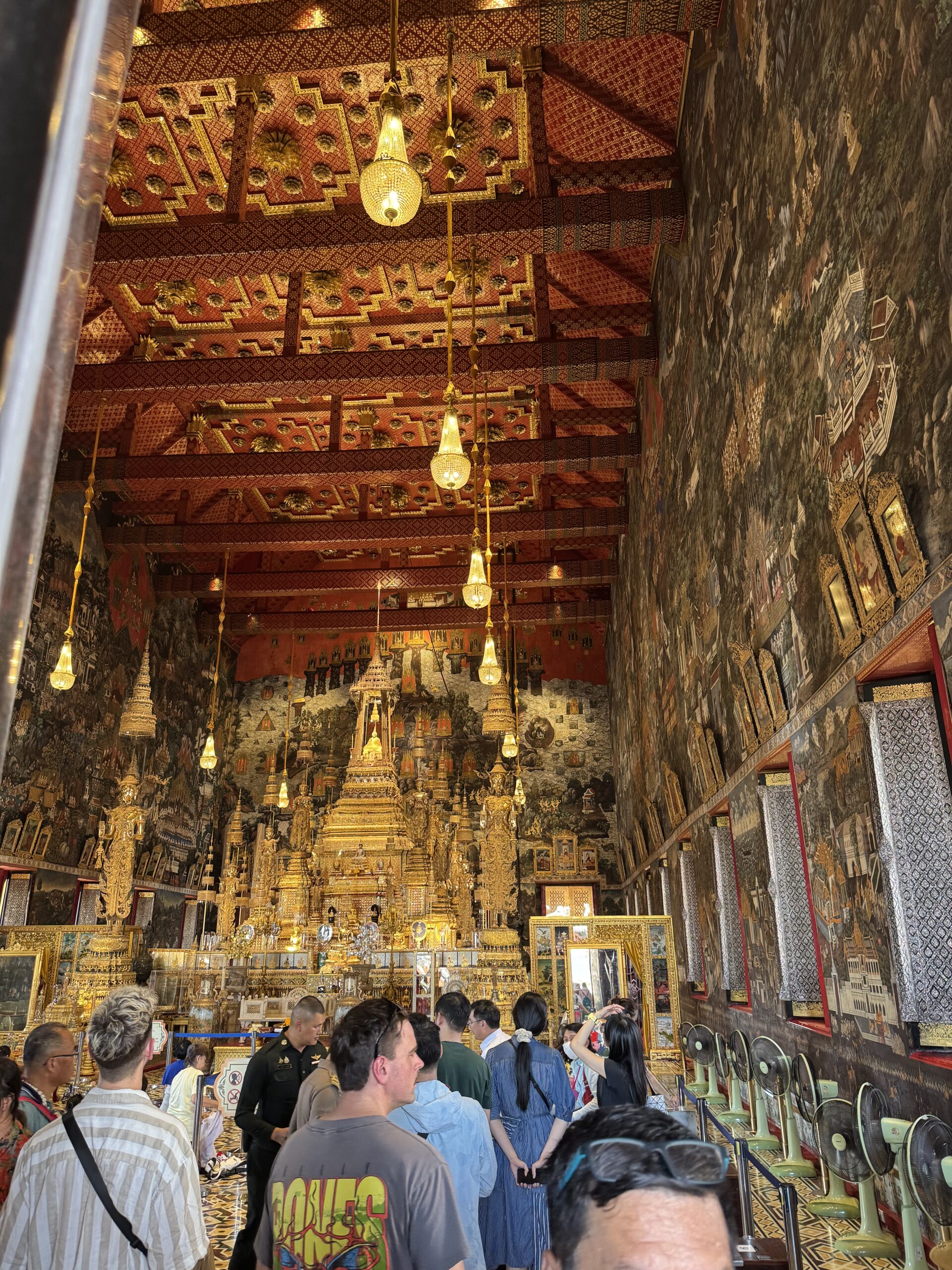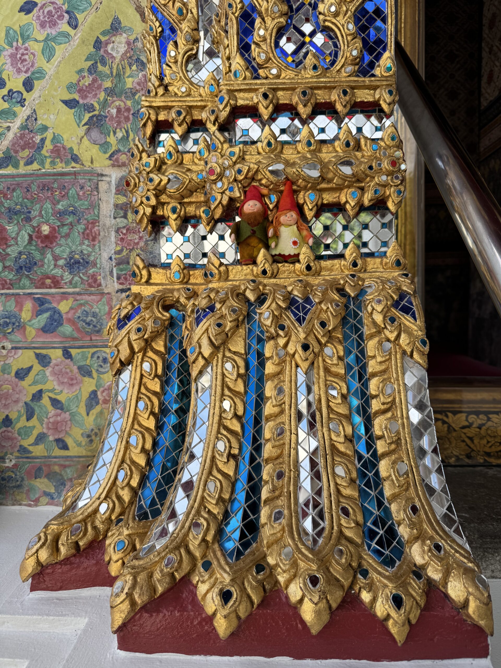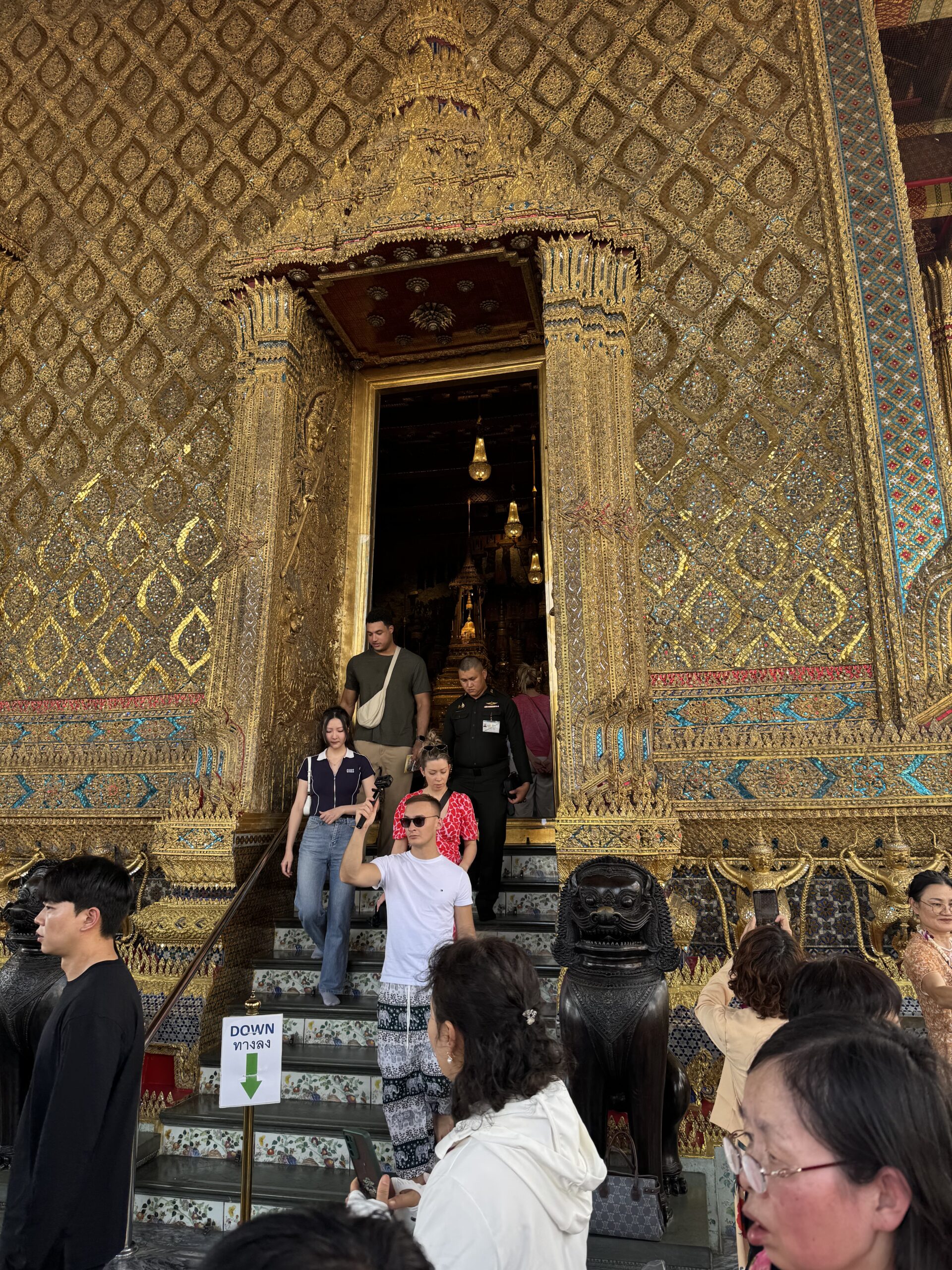 Weer met de hop-on-hop-of boot naar The Grand Palace geweest, vervelend verrast bij de ingang dat mijn shawl niet mocht, maar alleen T-shirts en lange broeken ook voor kinderen moeten, maar geen probleem, want je koopt daar ter plekke gewoon een stom T-shirt en een saaie broek…. Naaiers. Als ze dat in de folder hadden gezet dan hadden we dat natuurlijk gedaan, maar we dachten dat alles in orde was. We mochten overal op deze manier namelijk naar binnen en nu opeens moest er kleding aangepast (lees gekocht) worden. Nouja, ik mocht de shawl als rok om Ibis wikkelen, dat verlengde zijn broek toch zeker met 3 cm en dat was helemaal prima, want nu droeg hij een rok (ze dachten waarschijnlijk dat hij een meisje was) en dan mocht je wél scheenbenen zien. Zucht. Storm een groene broek waar Ibis alvast heel erg naar uitkijkt om in te groeien en dan kunnen we in het paleis en naar de tempel binnen de paleismuren met de smaragdgroene Boeddah, die dus best klein en van Jade blijkt te zijn…. Hahaha. Wel genoten van alle pracht en praal, maar eigenlijk ook wat overloaded… zoveel.