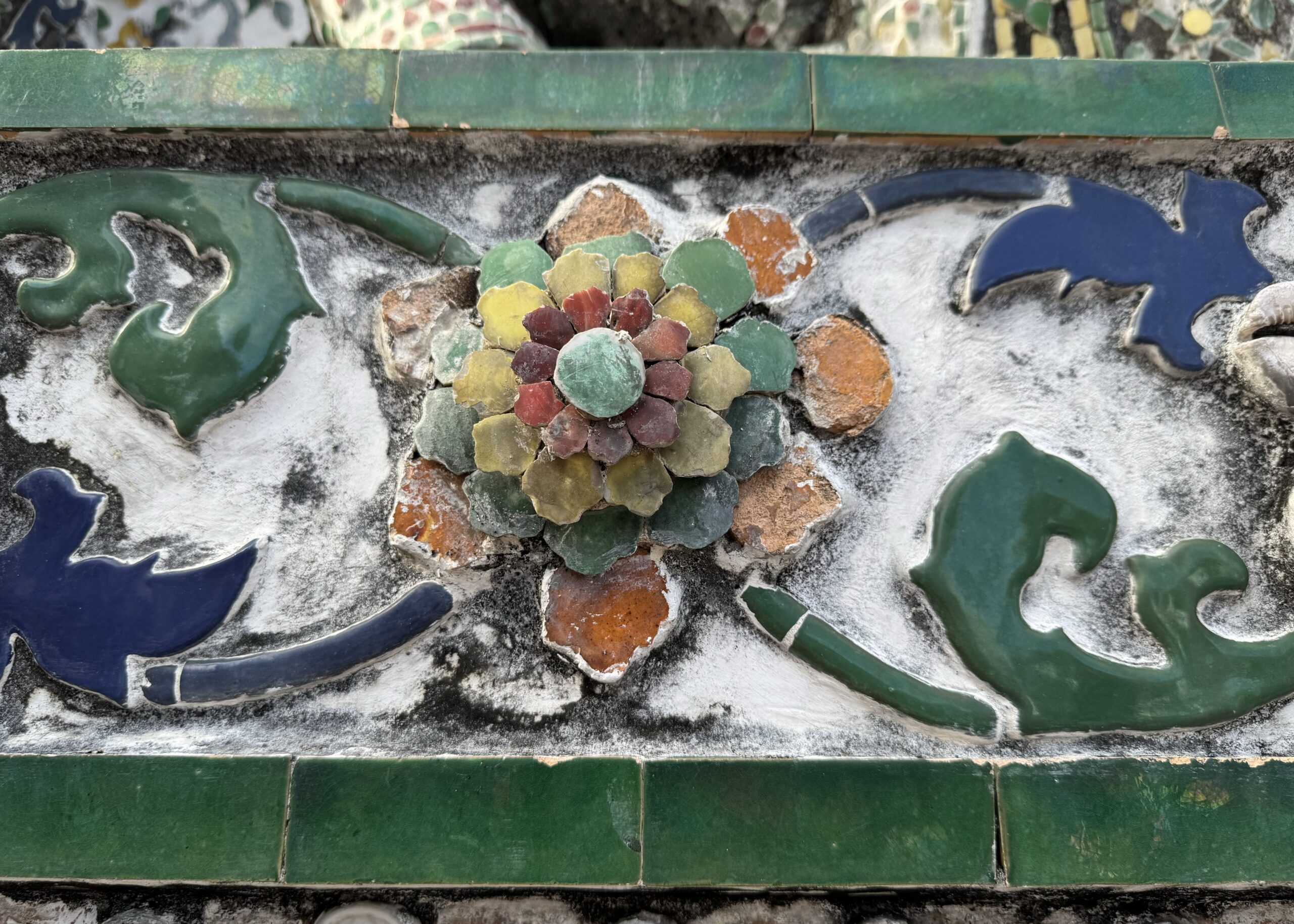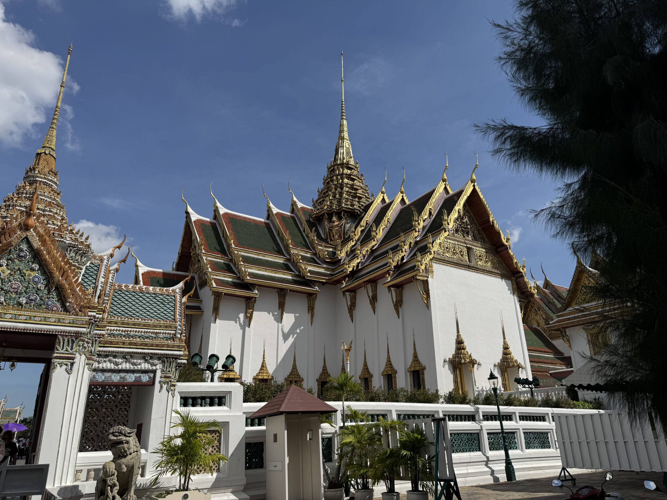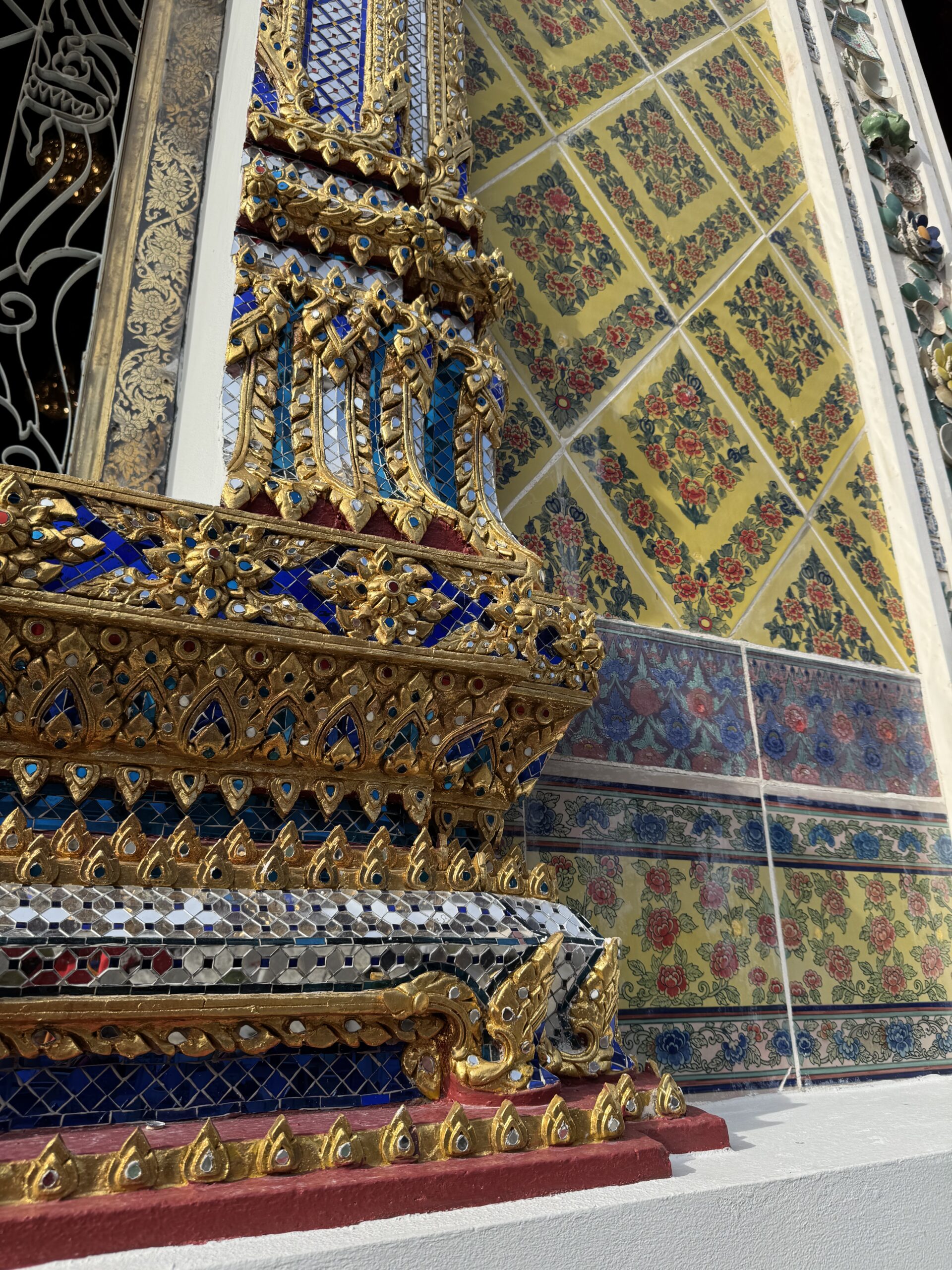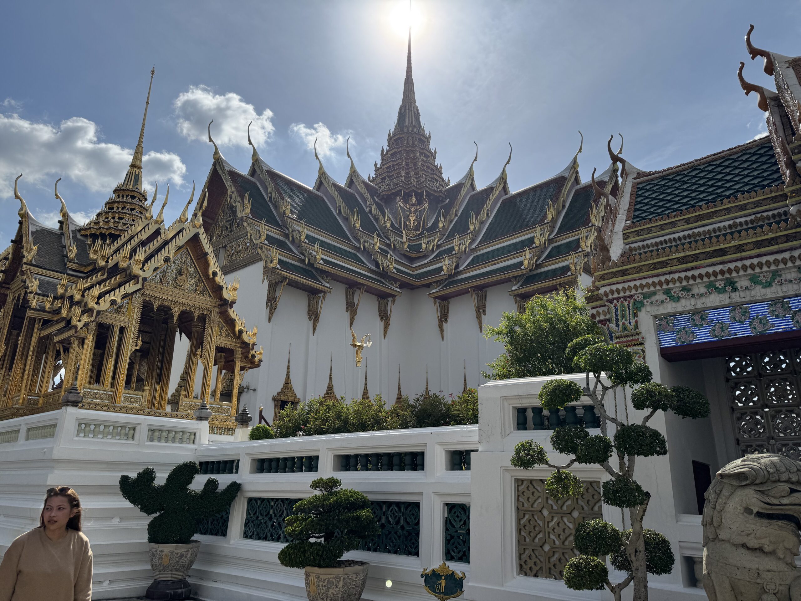 Weer met de hop-on-hop-of boot naar The Grand Palace geweest, vervelend verrast bij de ingang dat mijn shawl niet mocht, maar alleen T-shirts en lange broeken ook voor kinderen moeten, maar geen probleem, want je koopt daar ter plekke gewoon een stom T-shirt en een saaie broek…. Naaiers. Als ze dat in de folder hadden gezet dan hadden we dat natuurlijk gedaan, maar we dachten dat alles in orde was. We mochten overal op deze manier namelijk naar binnen en nu opeens moest er kleding aangepast (lees gekocht) worden. Nouja, ik mocht de shawl als rok om Ibis wikkelen, dat verlengde zijn broek toch zeker met 3 cm en dat was helemaal prima, want nu droeg hij een rok (ze dachten waarschijnlijk dat hij een meisje was) en dan mocht je wél scheenbenen zien. Zucht. Storm een groene broek waar Ibis alvast heel erg naar uitkijkt om in te groeien en dan kunnen we in het paleis en naar de tempel binnen de paleismuren met de smaragdgroene Boeddah, die dus best klein en van Jade blijkt te zijn…. Hahaha. Wel genoten van alle pracht en praal, maar eigenlijk ook wat overloaded… zoveel.
