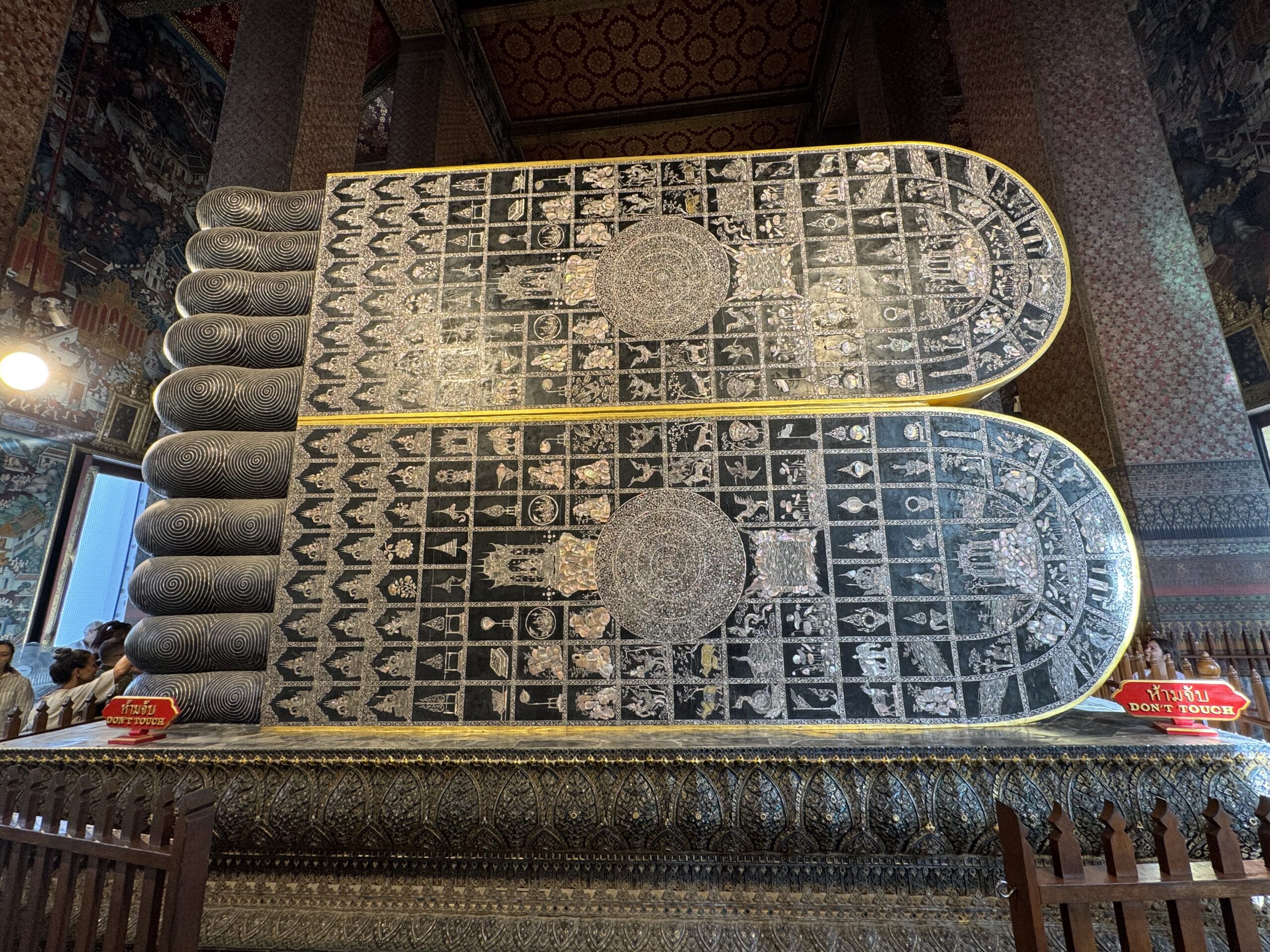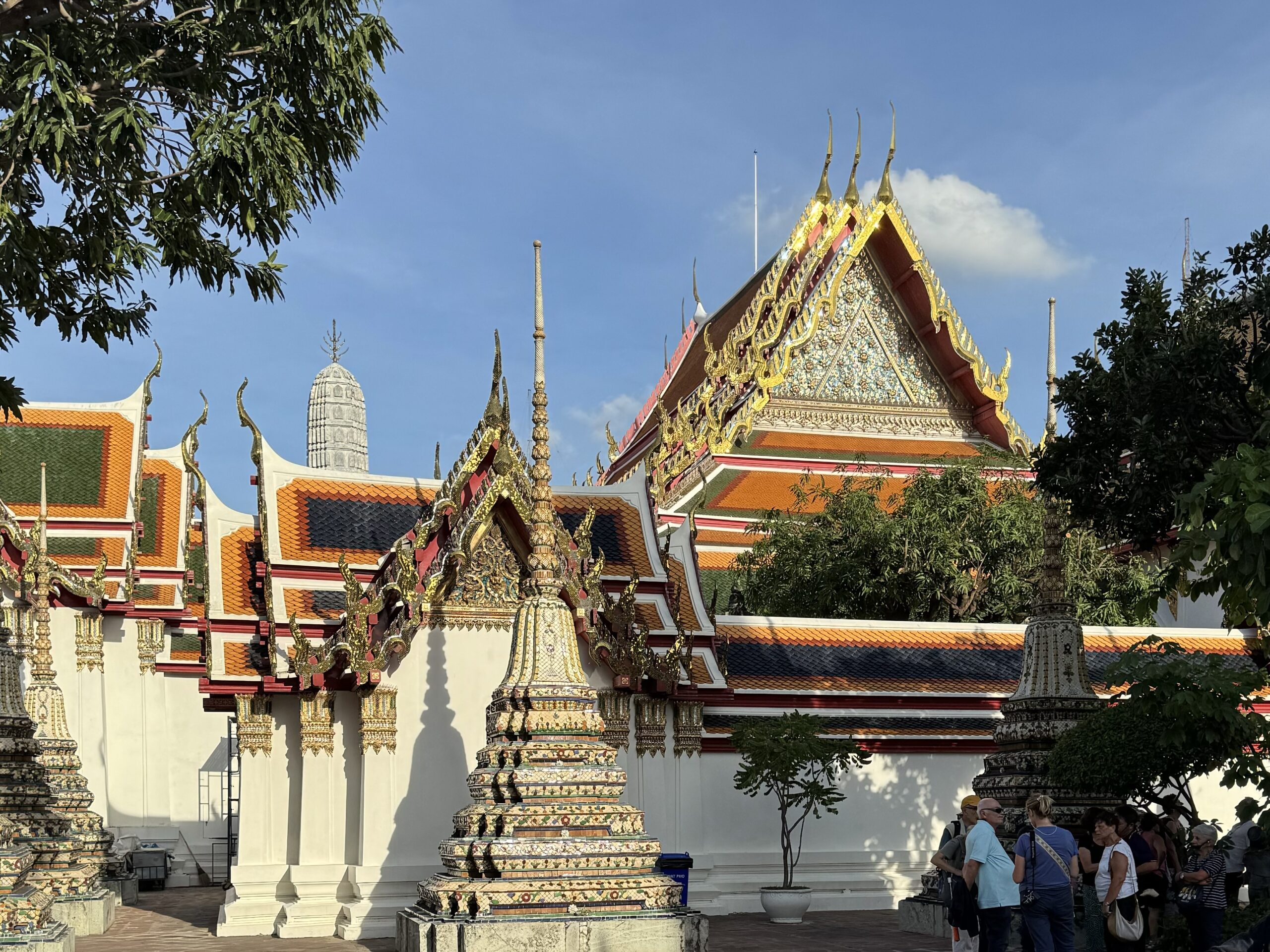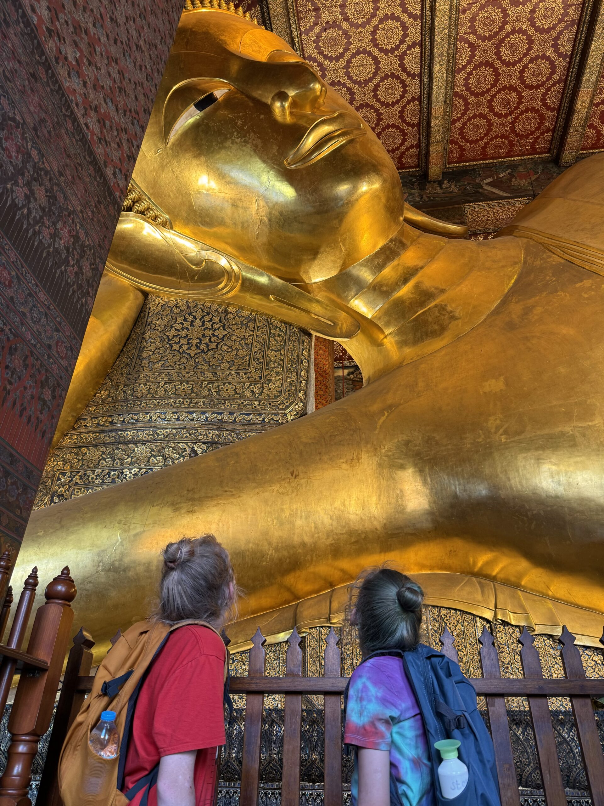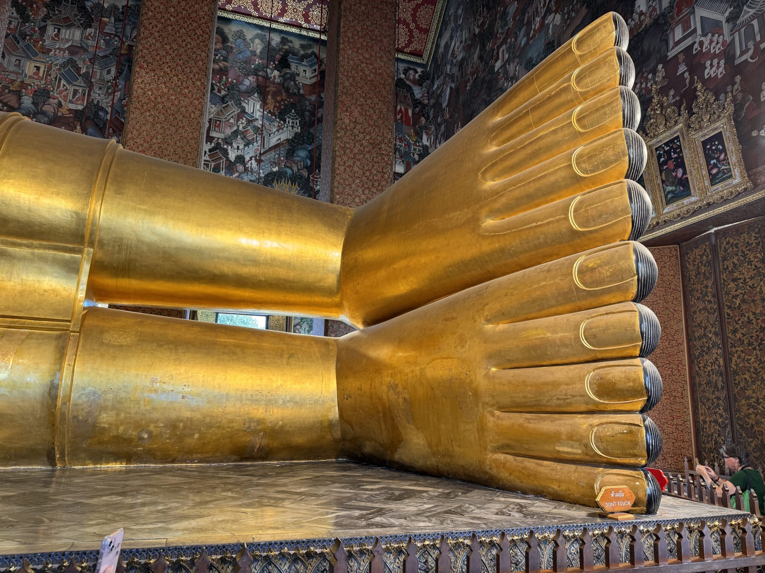Toen naar Wat Pho gelopen, waar we met gewone kleding en ik met shawl gewoon binnen mochten. Reusachtige liggende gouden boeddha gezien.