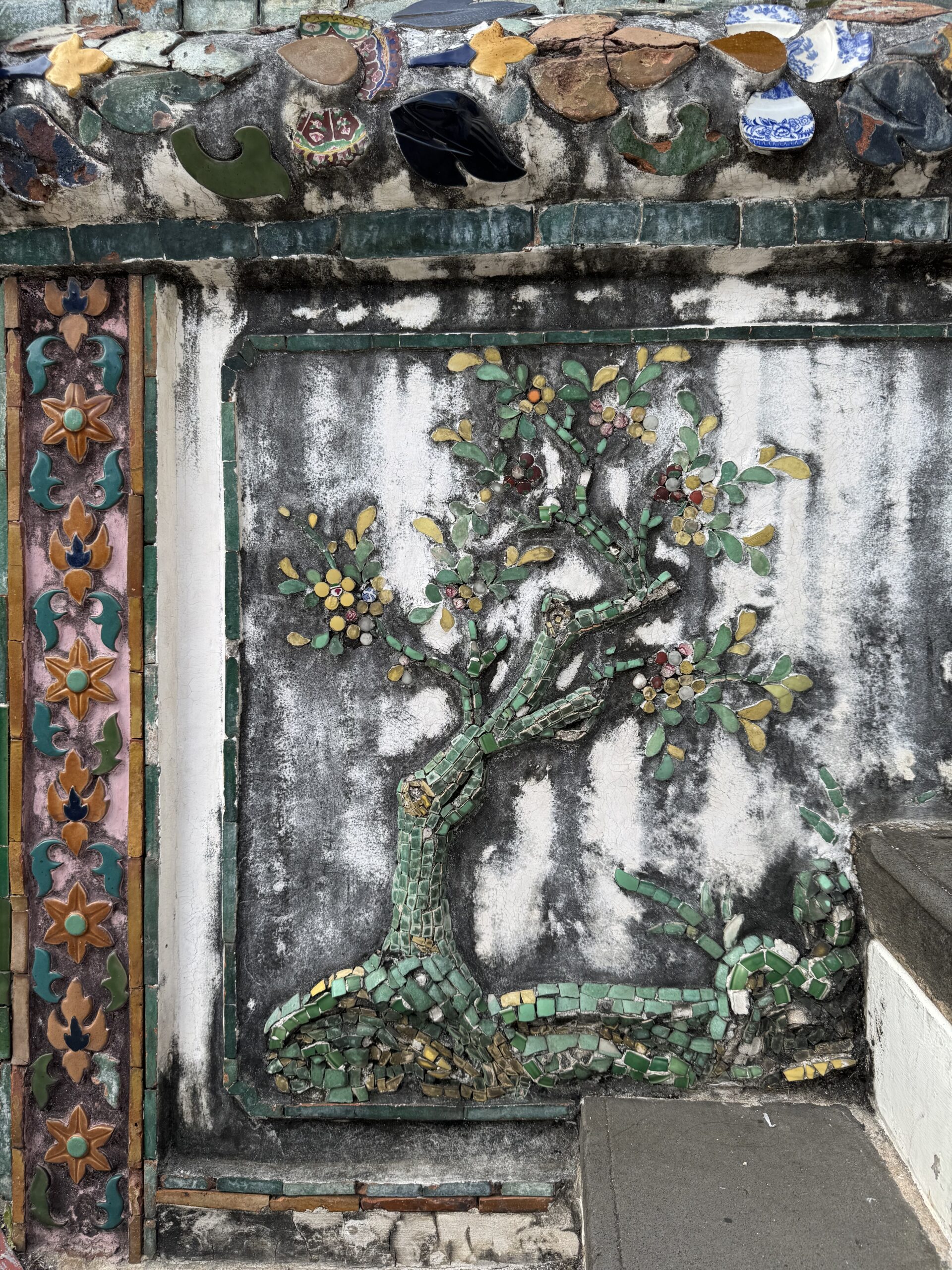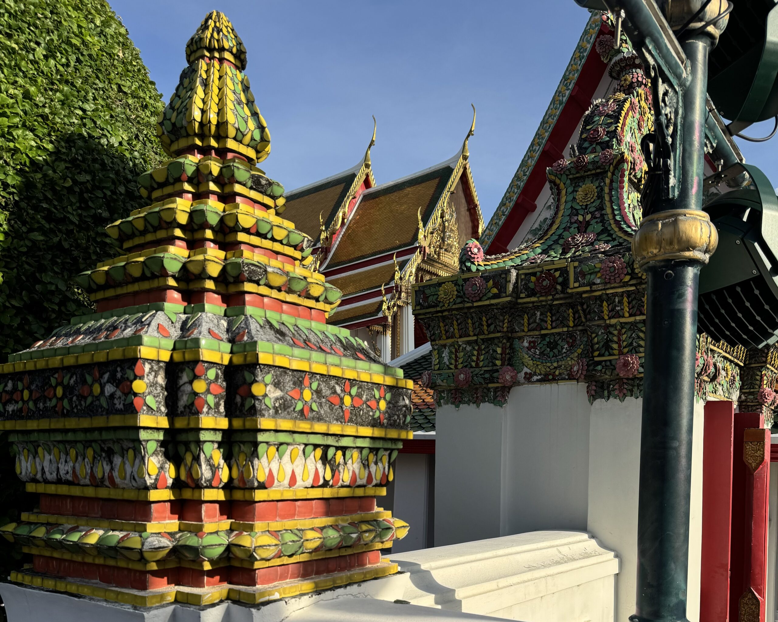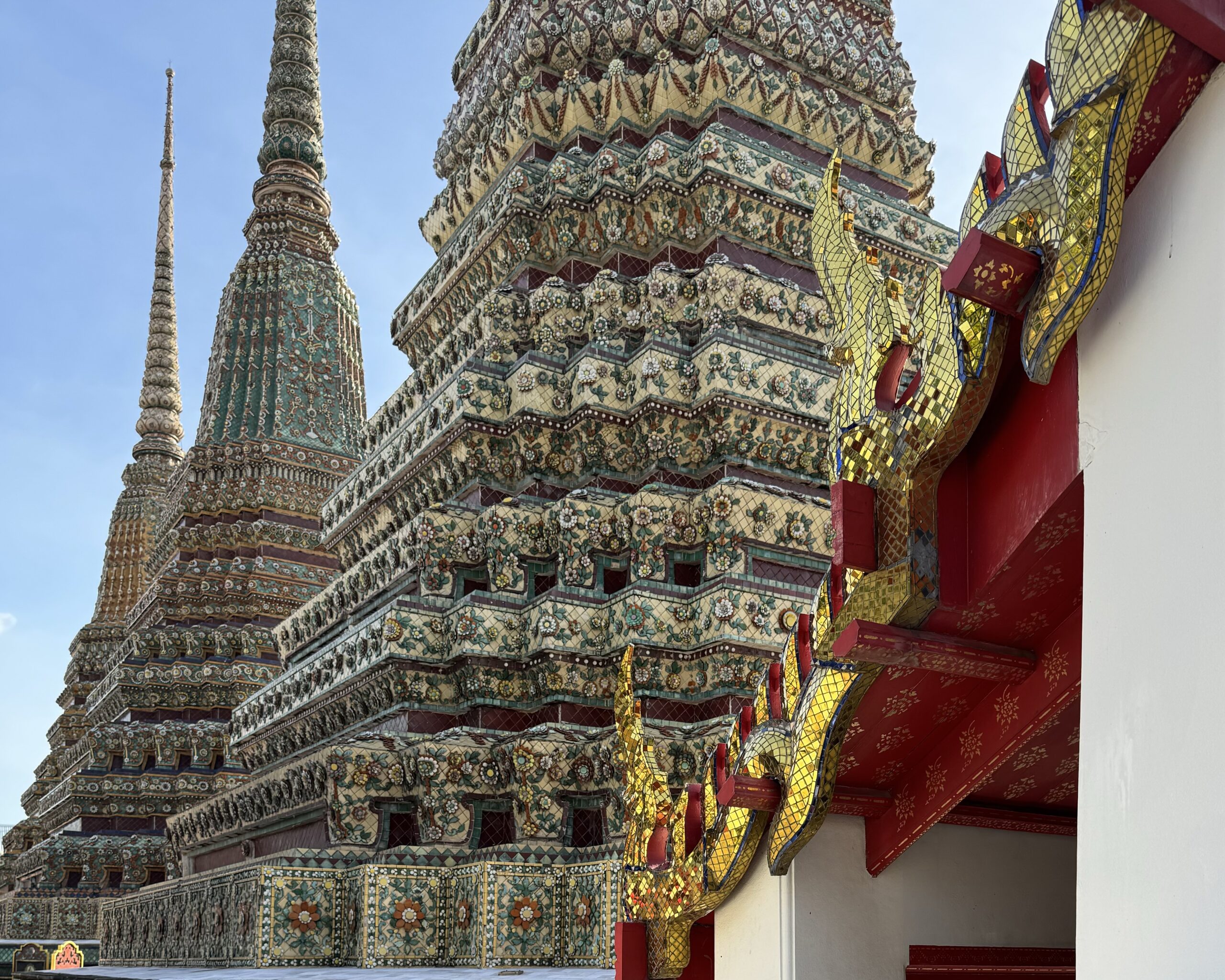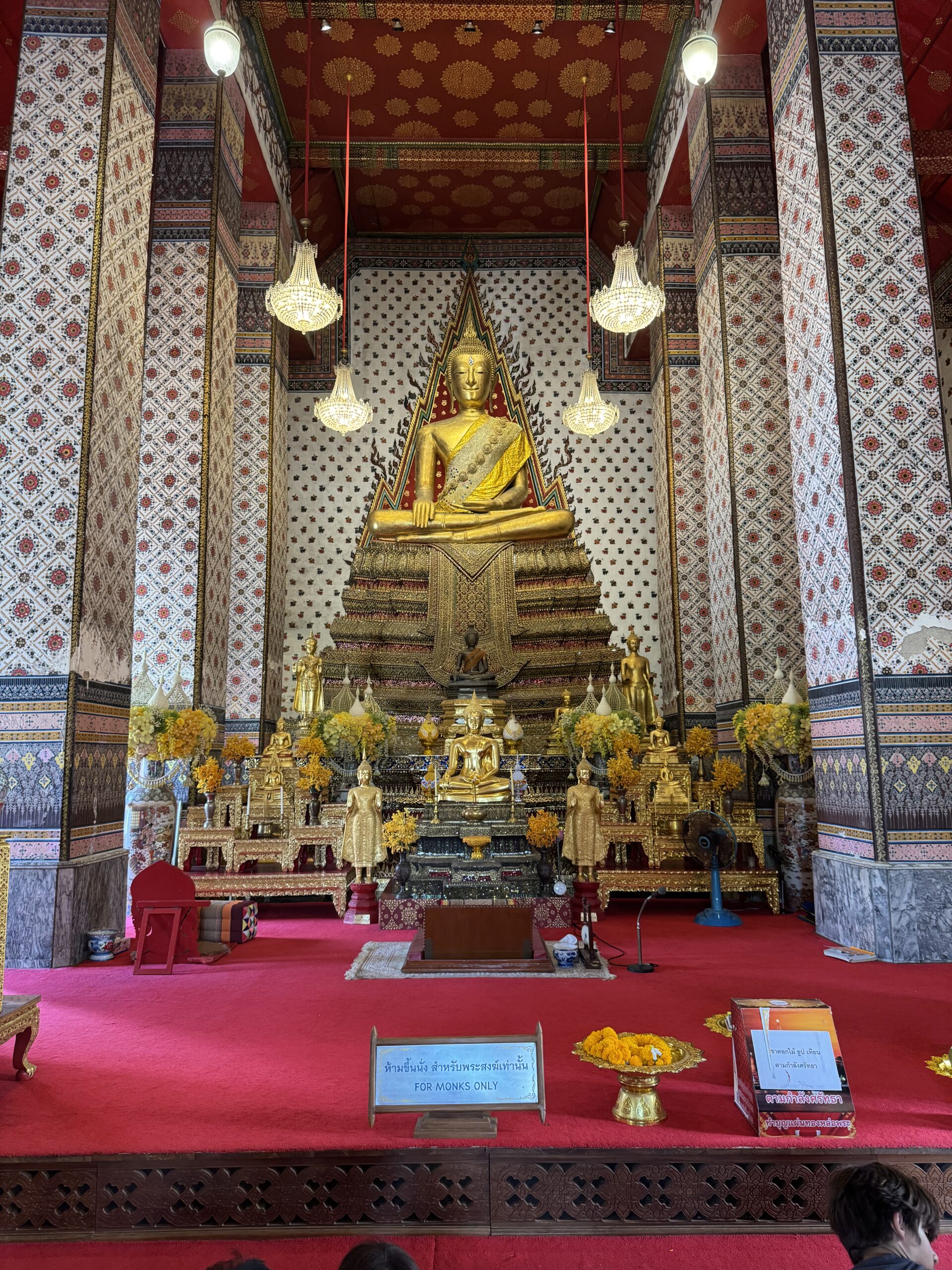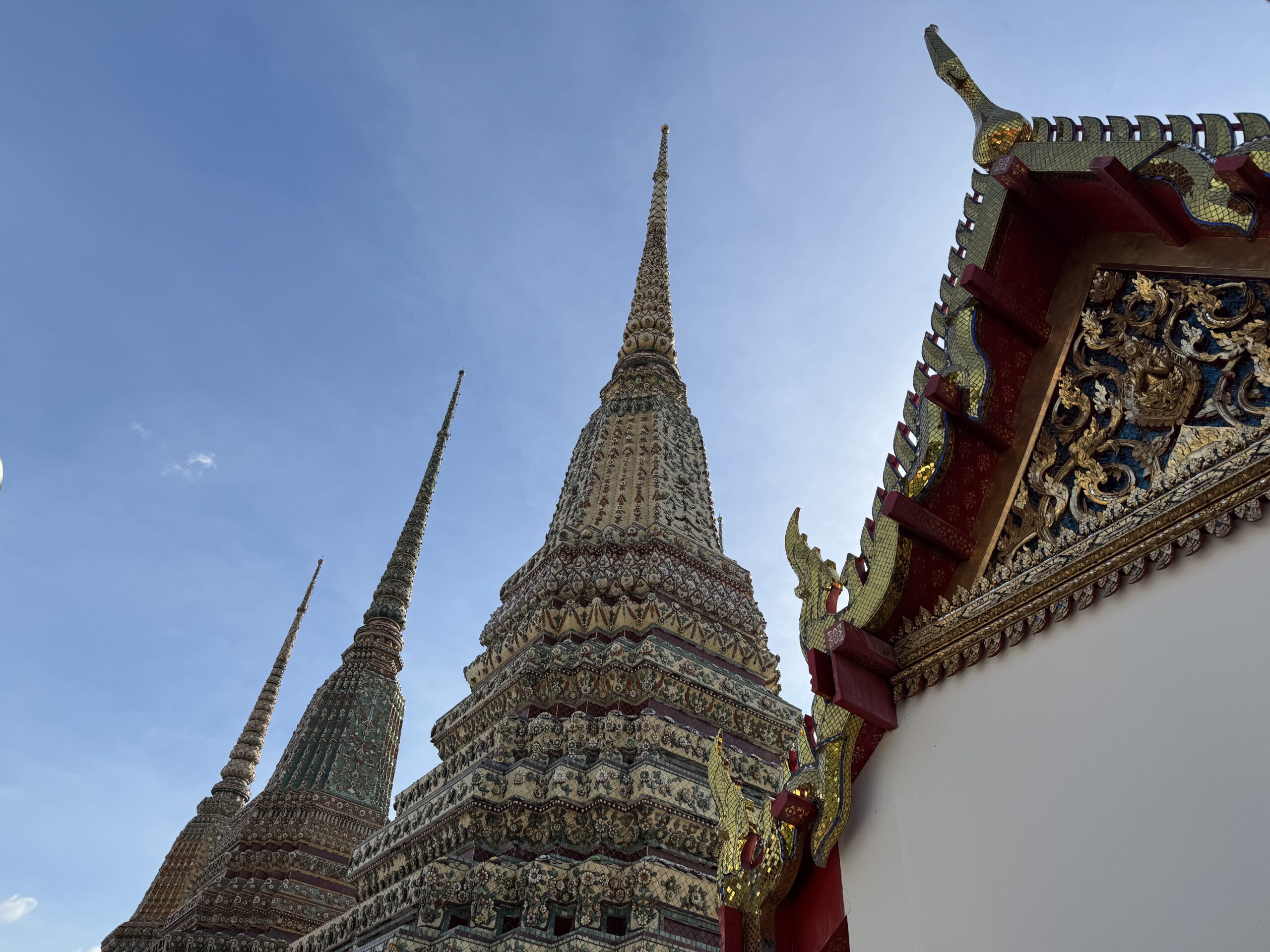 Toen naar Wat Pho gelopen, waar we met gewone kleding en ik met shawl gewoon binnen mochten. Reusachtige liggende gouden boeddha gezien.