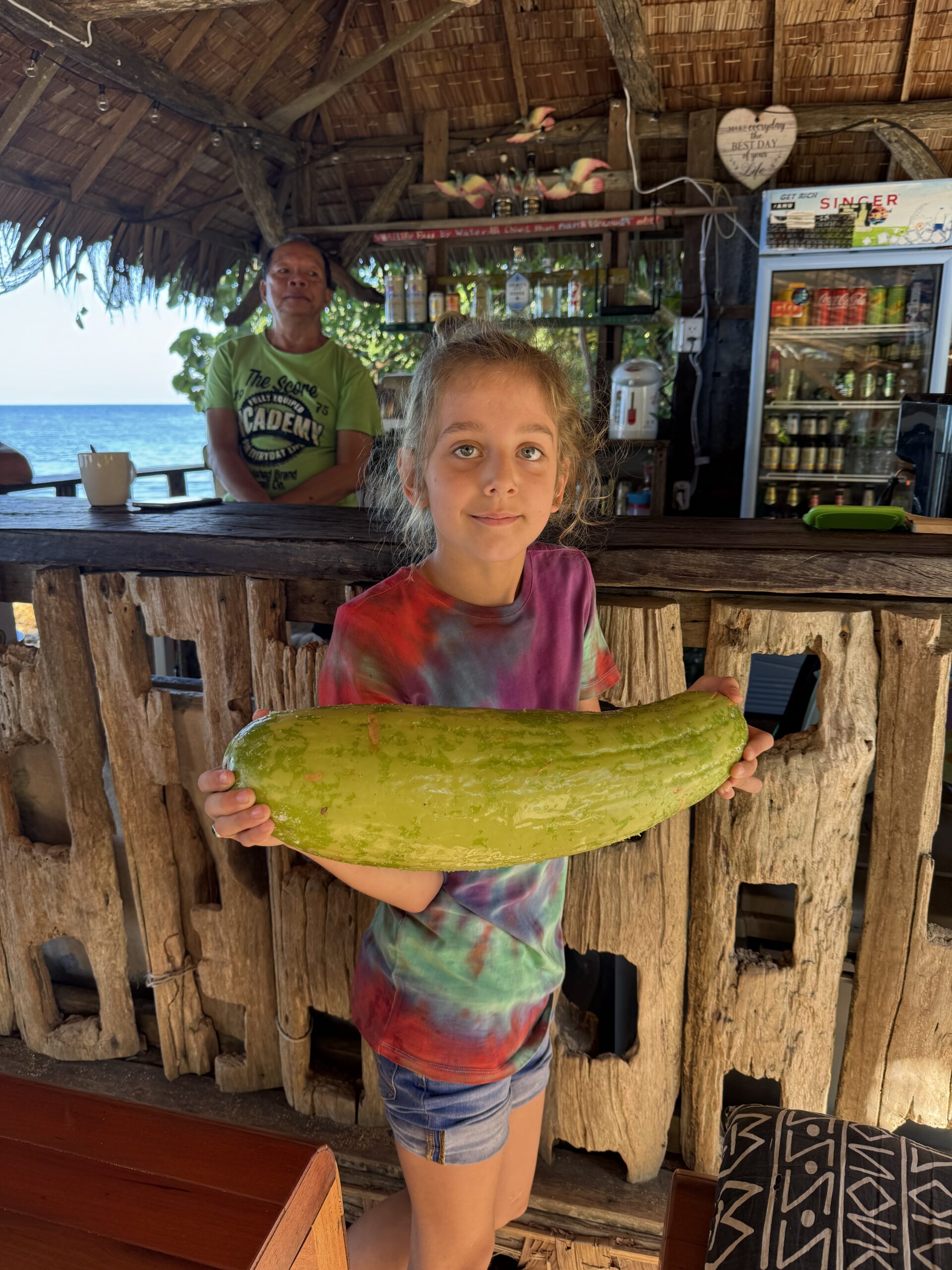 Vandaag heerlijk bewust alles ‘de laatste keer’ meegemaakt. Zalige warme zee met lichte bewolking, dus Storm hoefde zijn zwemshirt niet aan en we konden heerlijk drijven, snorkelen en lummelen. De bal die we op het eiland kochten hebben we aan het einde van de dag aan een Zweeds gezin met twee kleine kinderen gegeven. Dat scheelt weer in de koffer.