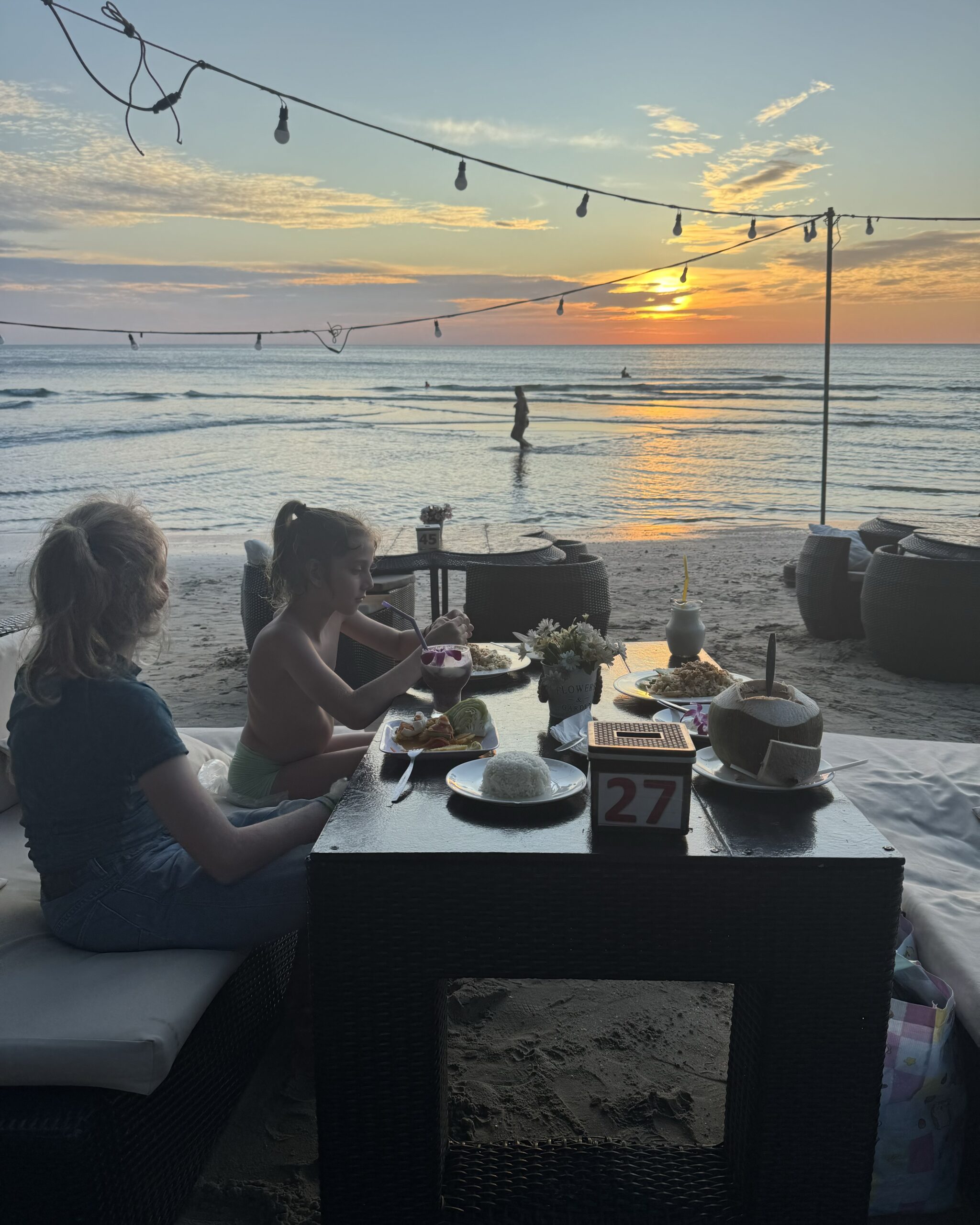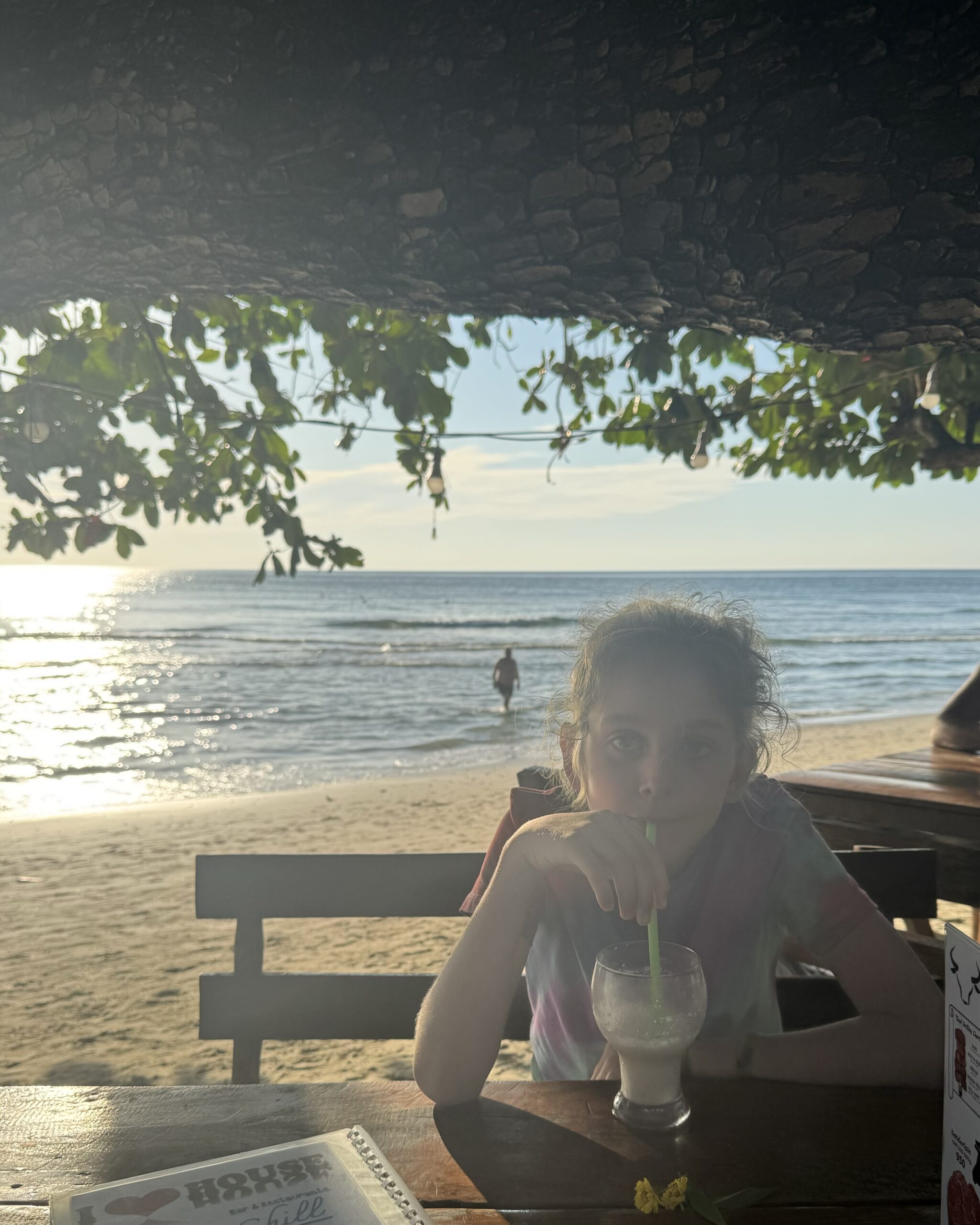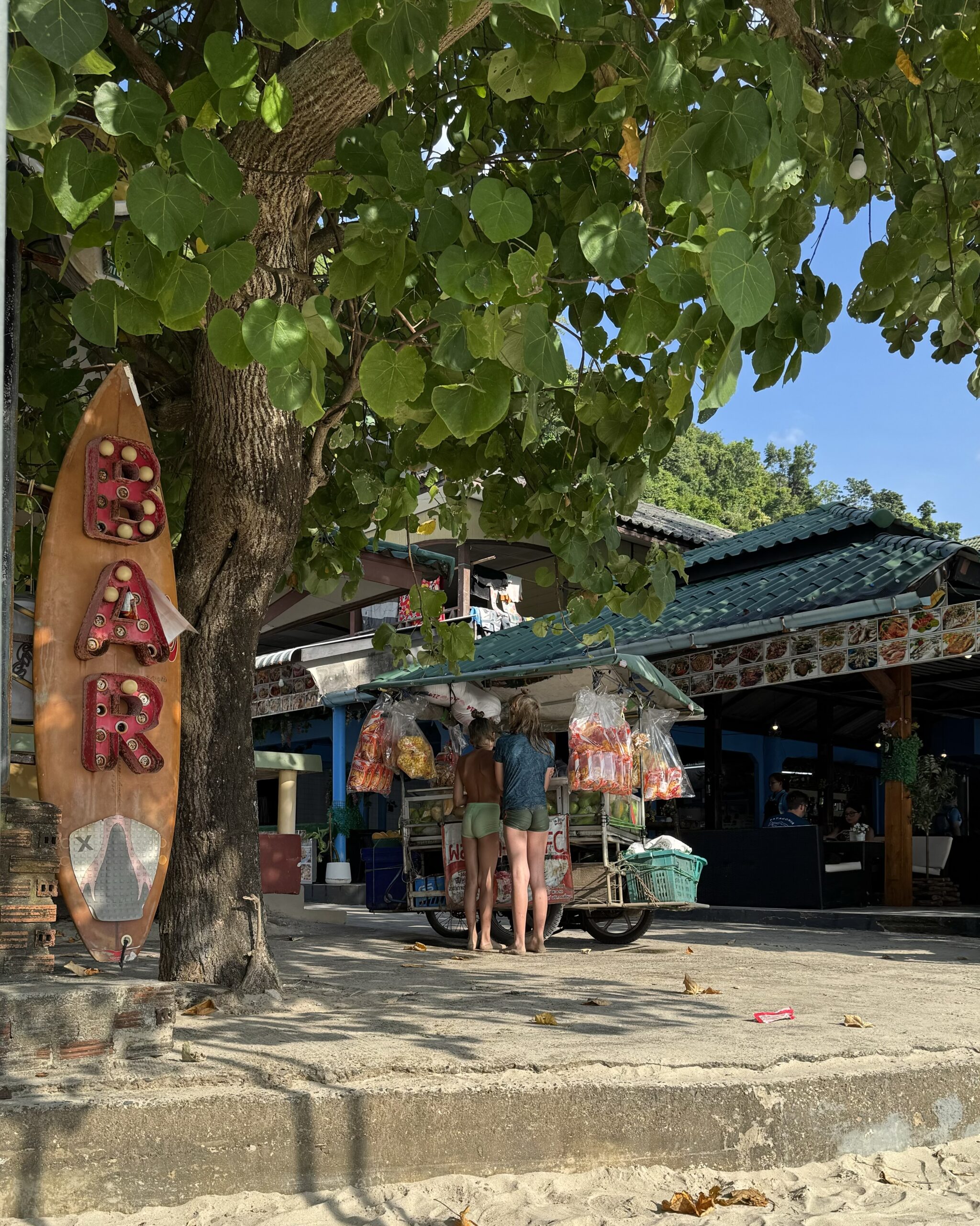 We dronken onze laatste lassi aan het strand, de jongens namen bij de ijscoman hun laatste ‘vier bolletjes ijs en een bolletje sticky rice op een groen (melk)broodje’ en ik datzelfde, maar dan in een bakje zonder broodje. Daarna nog in het water gespeeld, toen gingen we opdrogen en wachten op de mango-man met zijn karretje. Allemaal een lekkere mango aan zee gegeten en daarna de spullen gepakt en op de scooter terug naar de hostel gereden. De laatste keer met ons drieën op Ko Chang door de straat op de scooter. Het was super leuk. Alles.