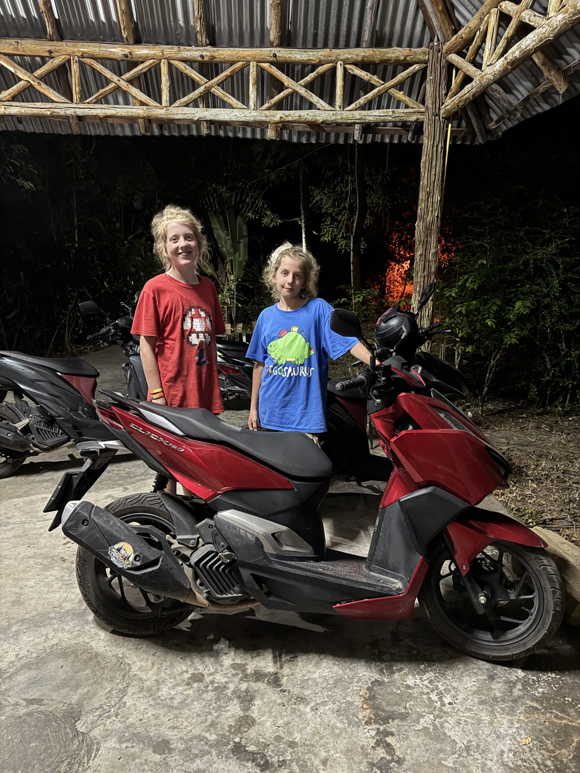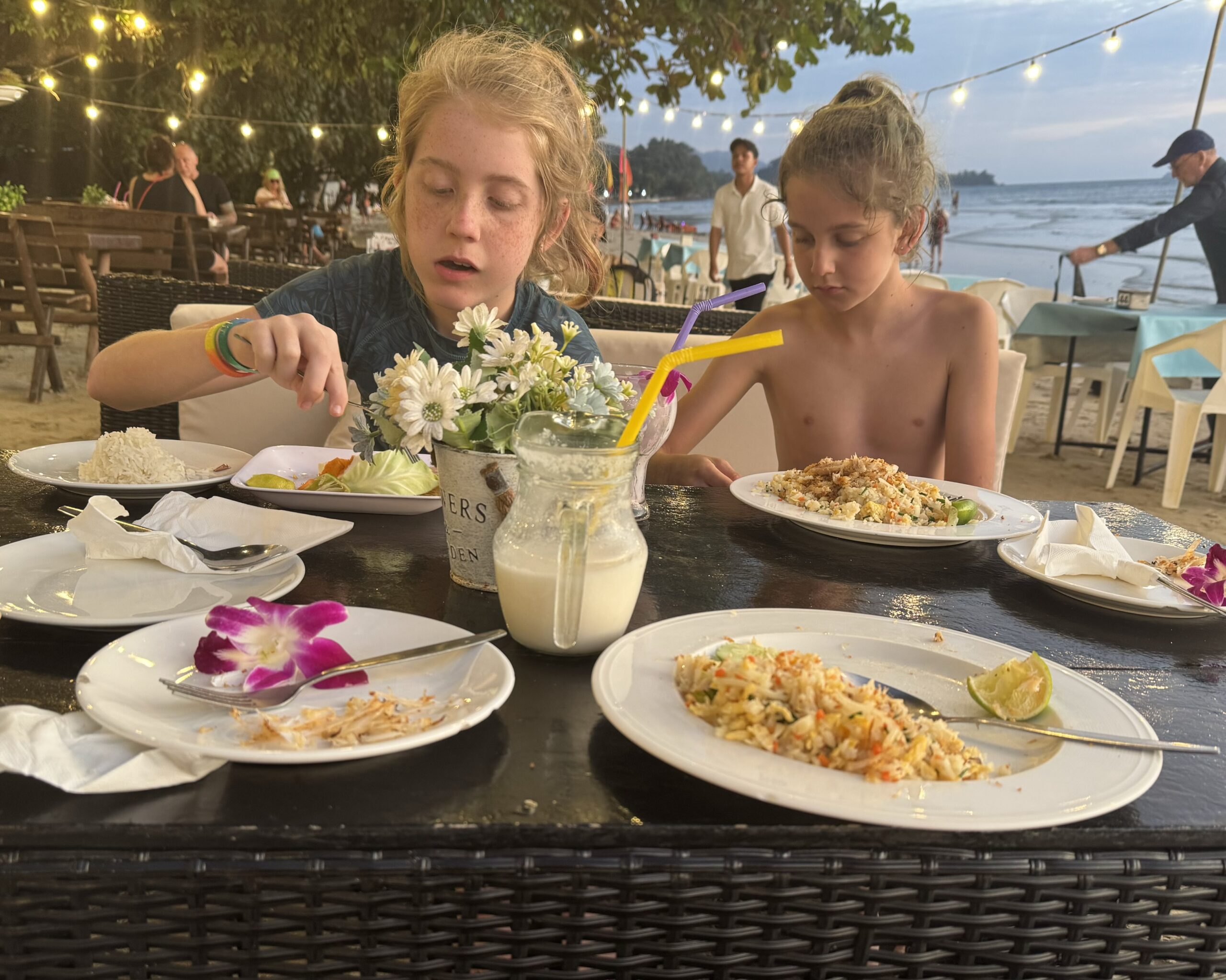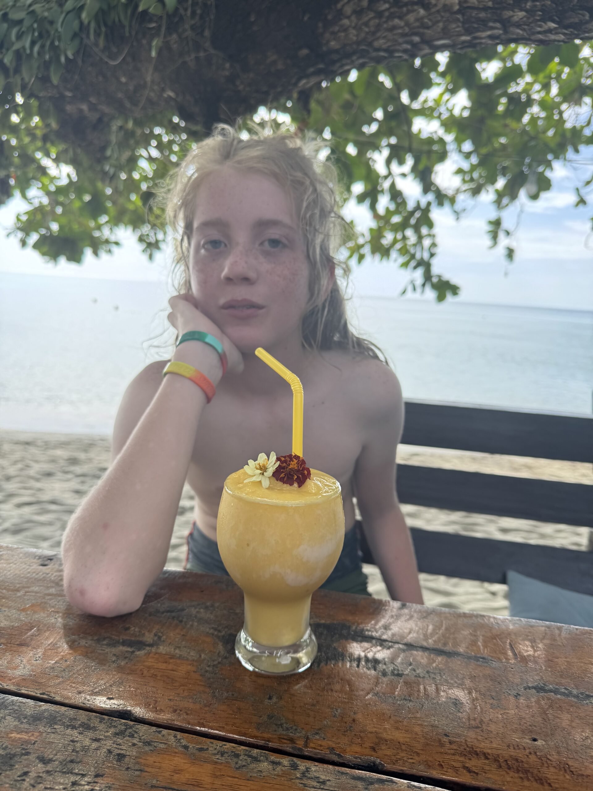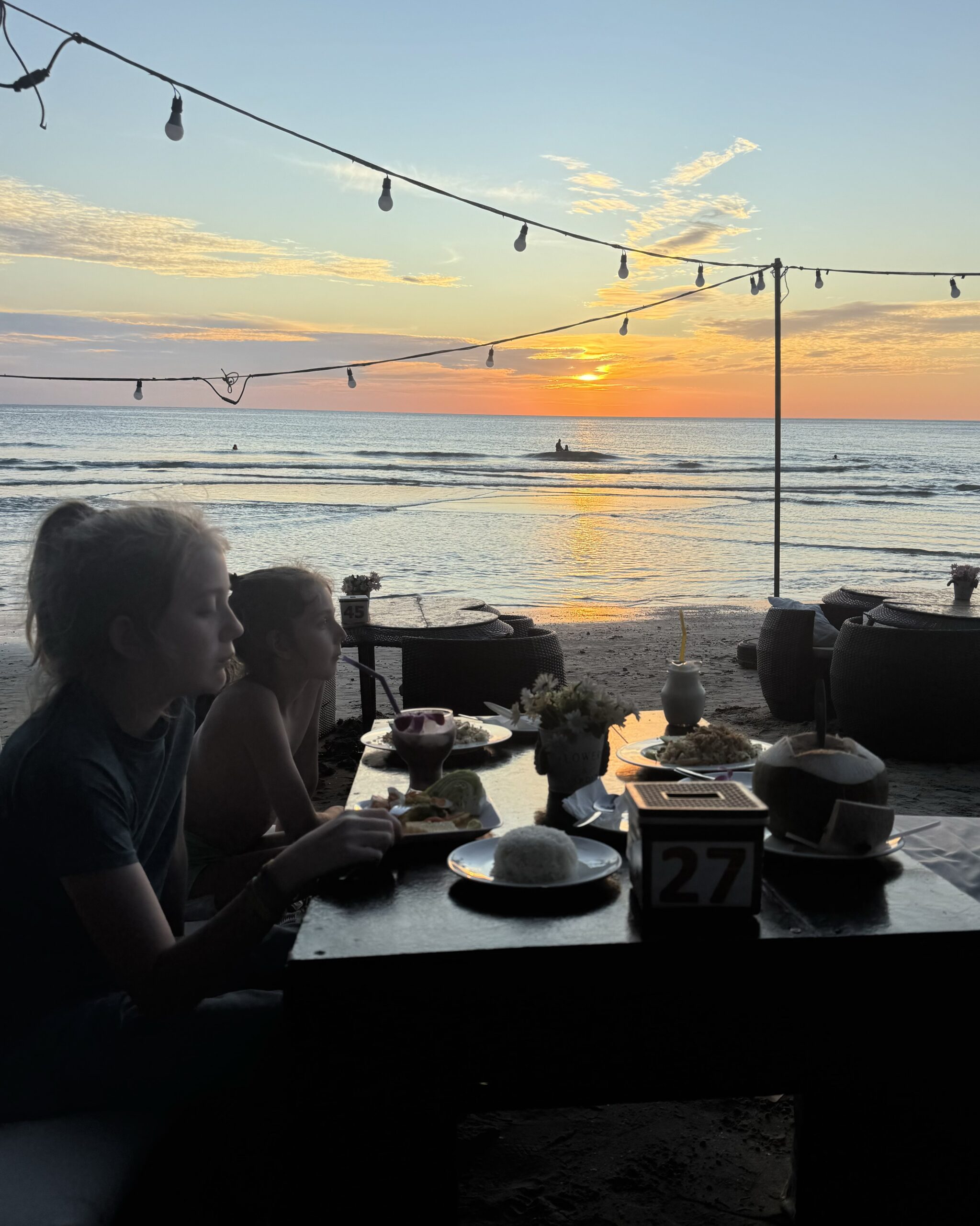 We dronken onze laatste lassi aan het strand, de jongens namen bij de ijscoman hun laatste ‘vier bolletjes ijs en een bolletje sticky rice op een groen (melk)broodje’ en ik datzelfde, maar dan in een bakje zonder broodje. Daarna nog in het water gespeeld, toen gingen we opdrogen en wachten op de mango-man met zijn karretje. Allemaal een lekkere mango aan zee gegeten en daarna de spullen gepakt en op de scooter terug naar de hostel gereden. De laatste keer met ons drieën op Ko Chang door de straat op de scooter. Het was super leuk. Alles.