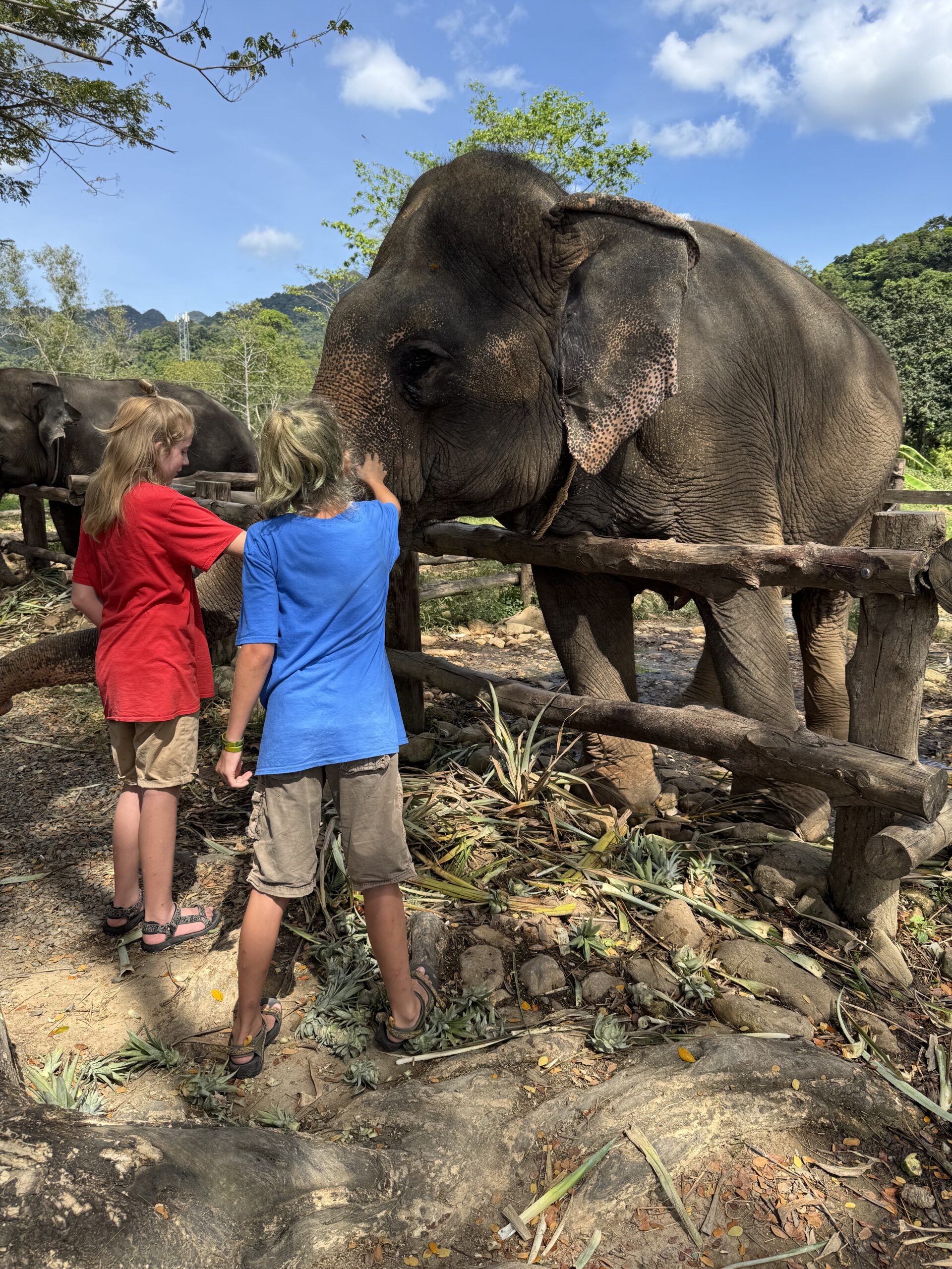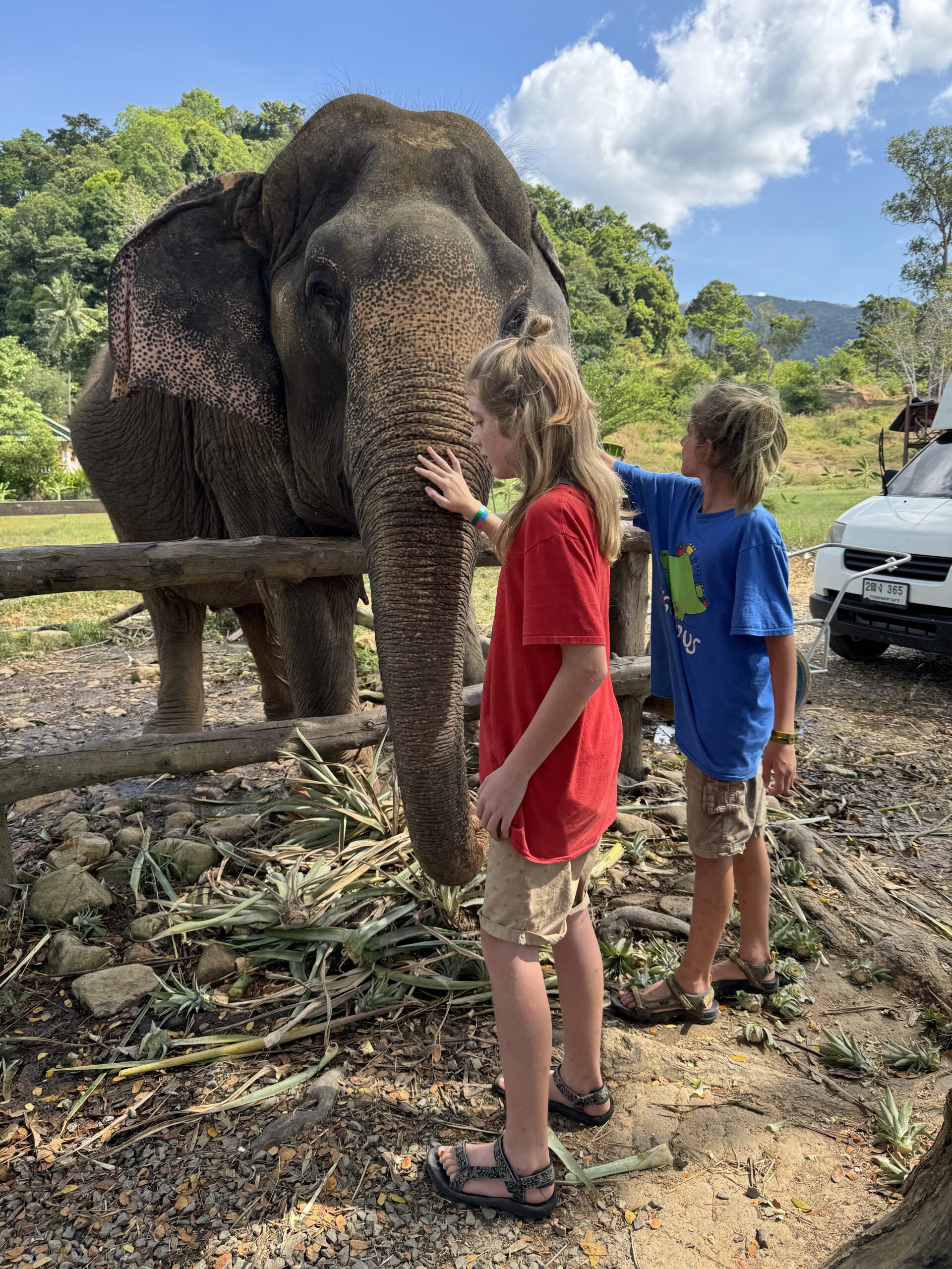 Na het ‘muesli met yoghurt en banaan ontbijt’ zijn we olifanten gaan voeren en aaien. Dit was de eerste keer voor beide jongens dat ze een olifant van zo dichtbij hadden gezien en ook nog konden aaien. Ze vonden het heel leuk.