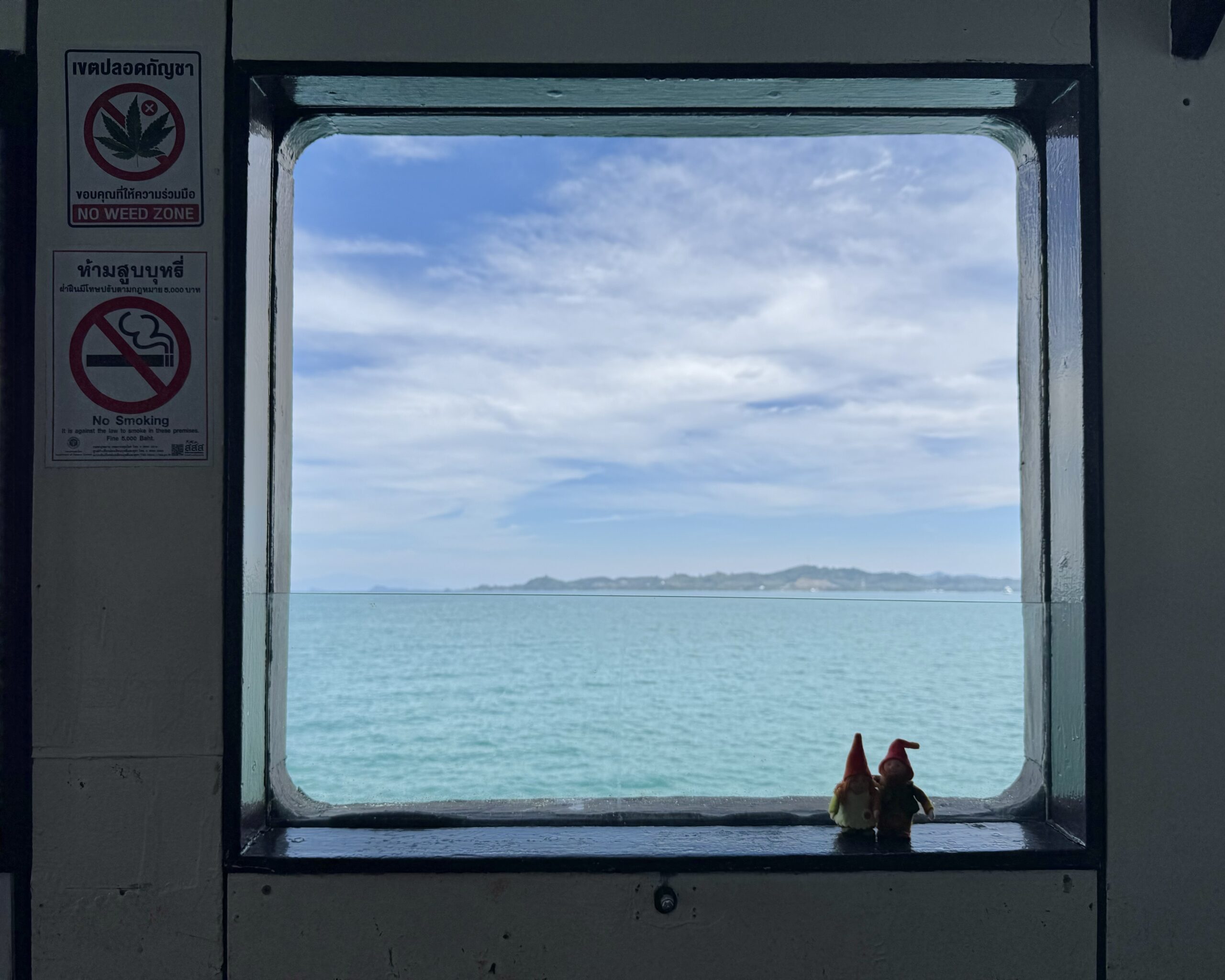 We kwamen aan bij de pier, kochten daar een kaartje voor de ferry inclusief de taxi naar de hostel (ferry Thb 80, taxi Thb 100 p.p.) Om 13.50u vertrok de taxi na enig uitzoekwerk wie waar naartoe gebracht moet worden. Helemaal rommelig op z’n Thais, hahaha.