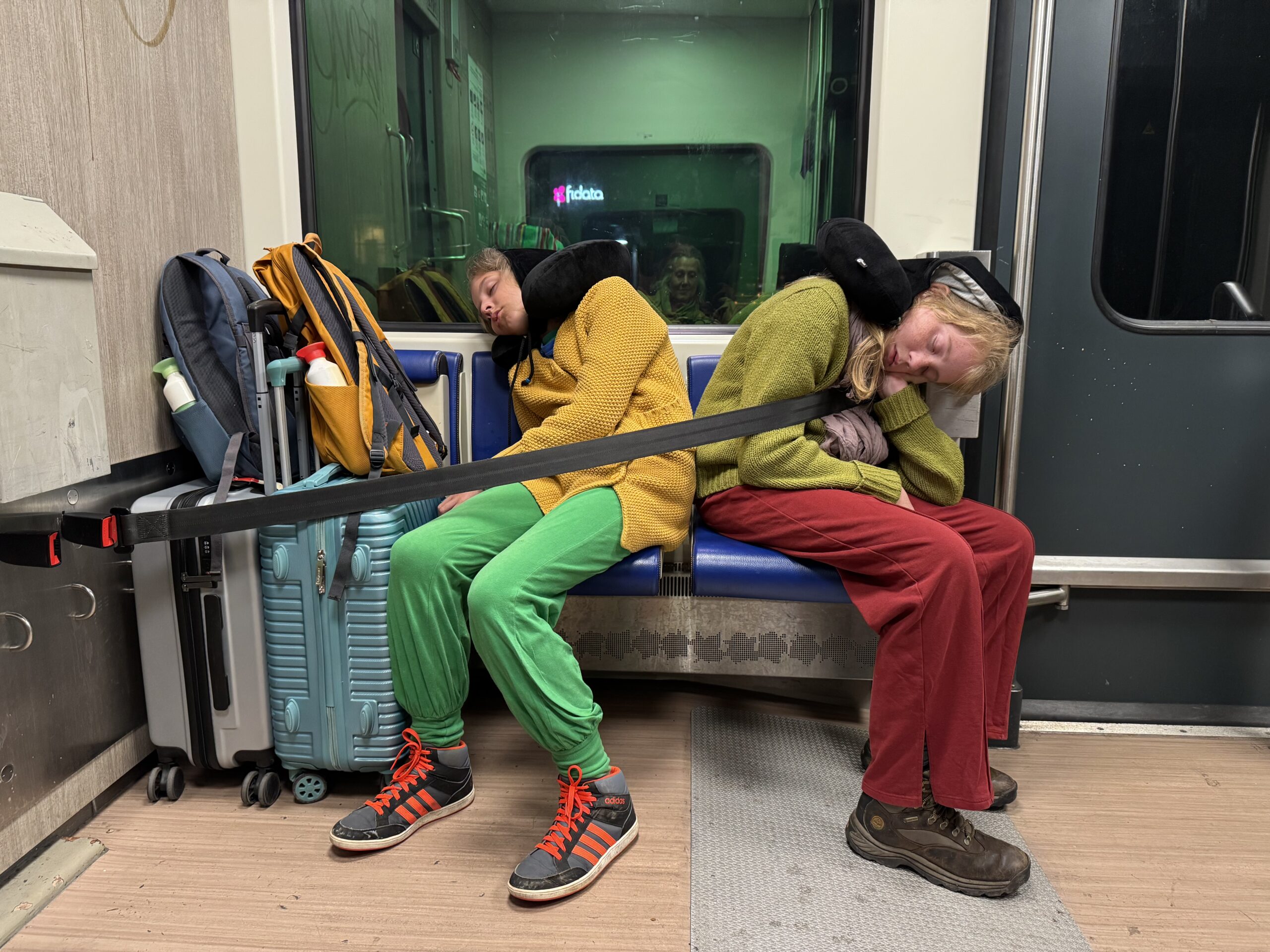 Alle koffers en tassen logisch ingepakt, een nieuwe koffer gedecoreerd met stippen, zodat we die zeker herkennen op de bagageband, want alle koffers die we meenamen zijn inmiddels begraven en vervangen. We hebben op het bed nog even een spelletje pesten gespeeld, daarna nog gelezen en zijn lekker in slaap gevallen.